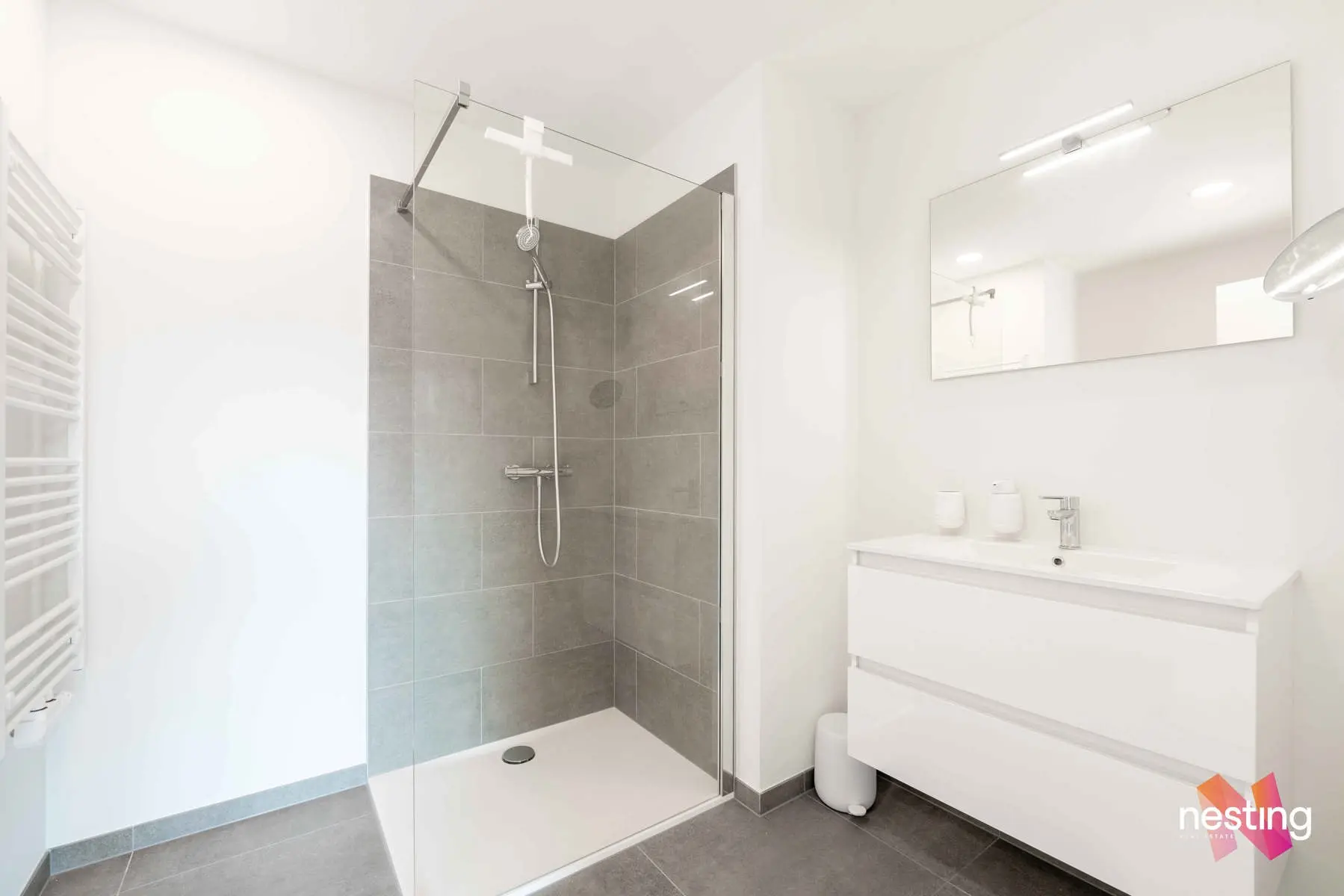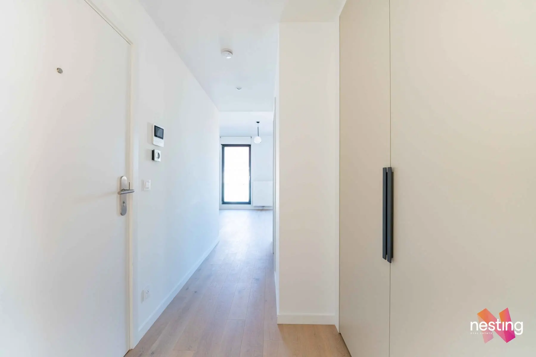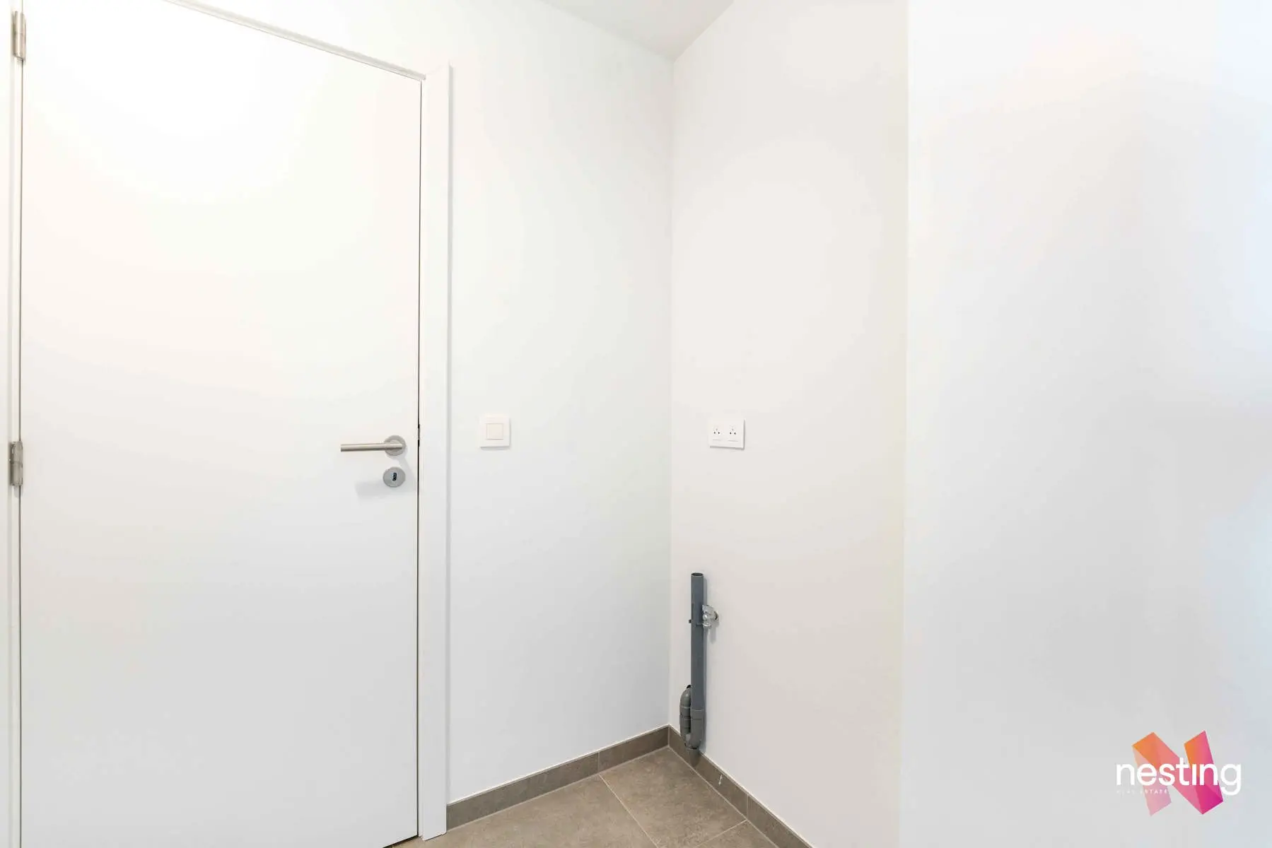 Hall d'entrée avec vestiaire, séjour de +- 29m2 avec une magnifique cuisine ouverte super équipée donnant sur un balcon orienté sud-ouest et une magnifique vue sur le Wiels, un hall de nuit avec dressing, une chambre avec dressing sur mesure (14,5m2) et sa salle de bains attenante et un wc séparé avec espace buanderie.