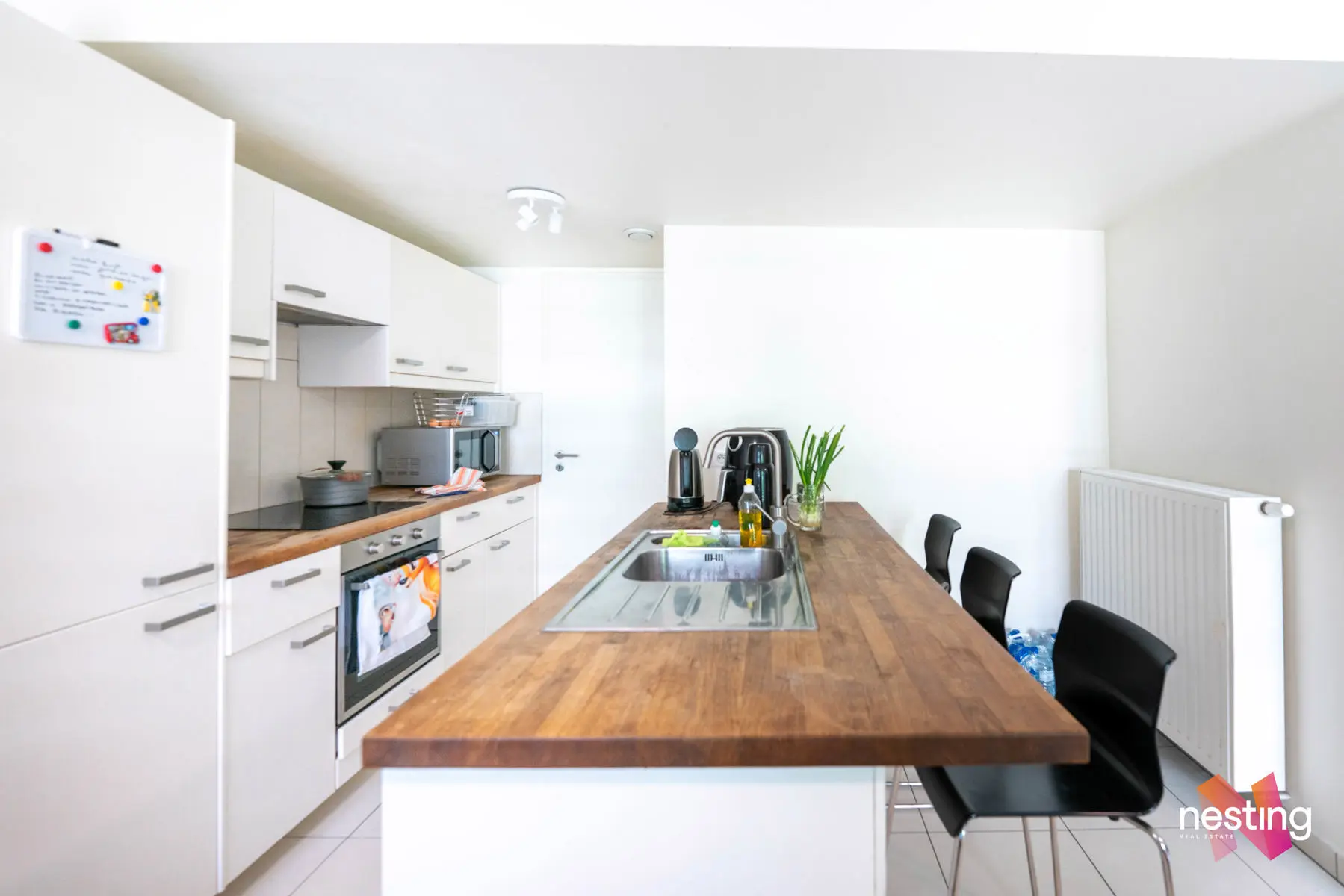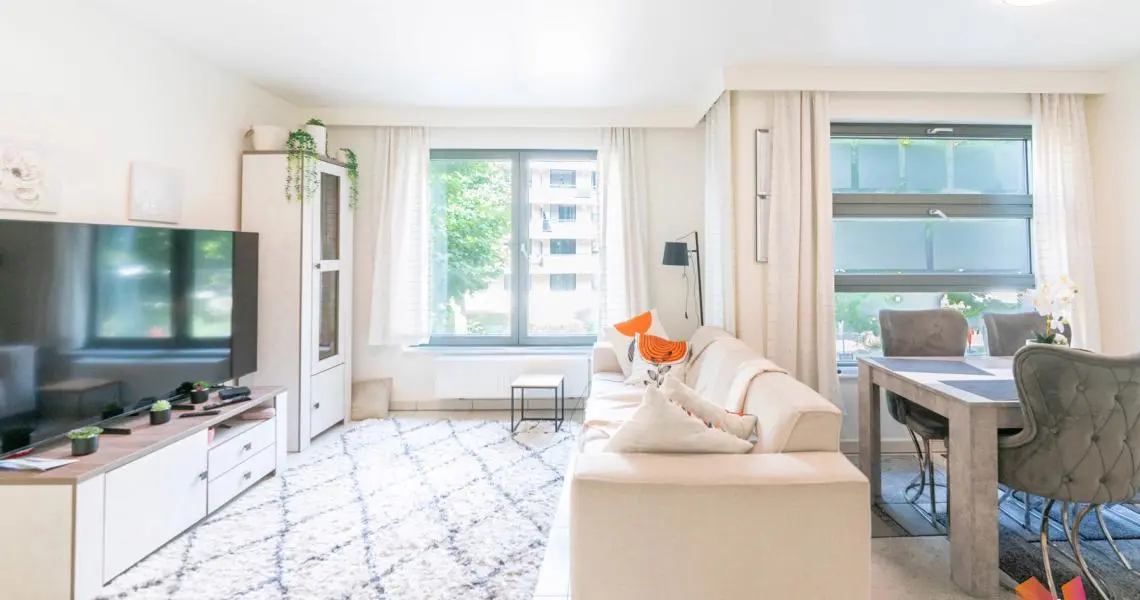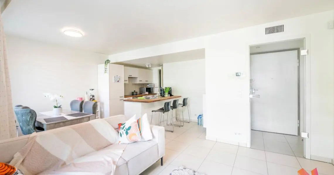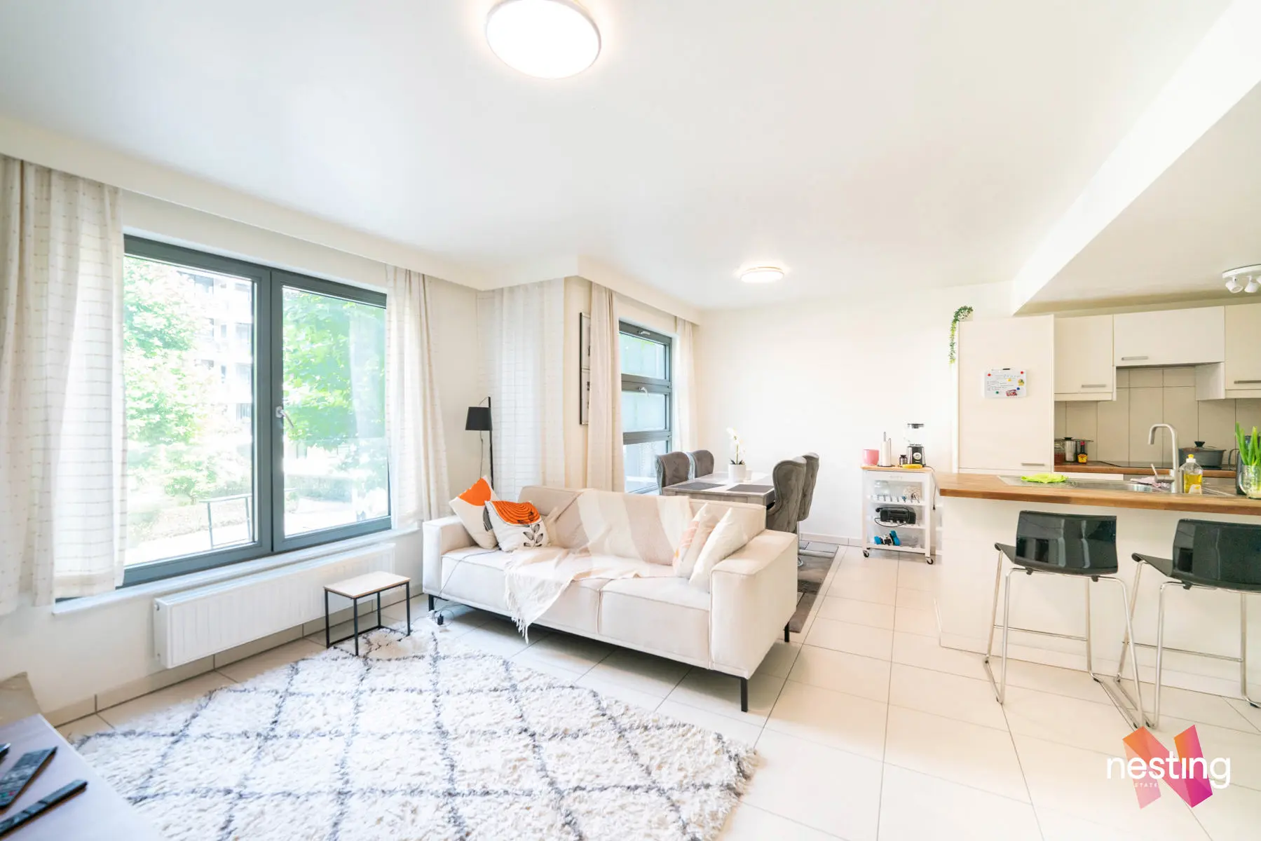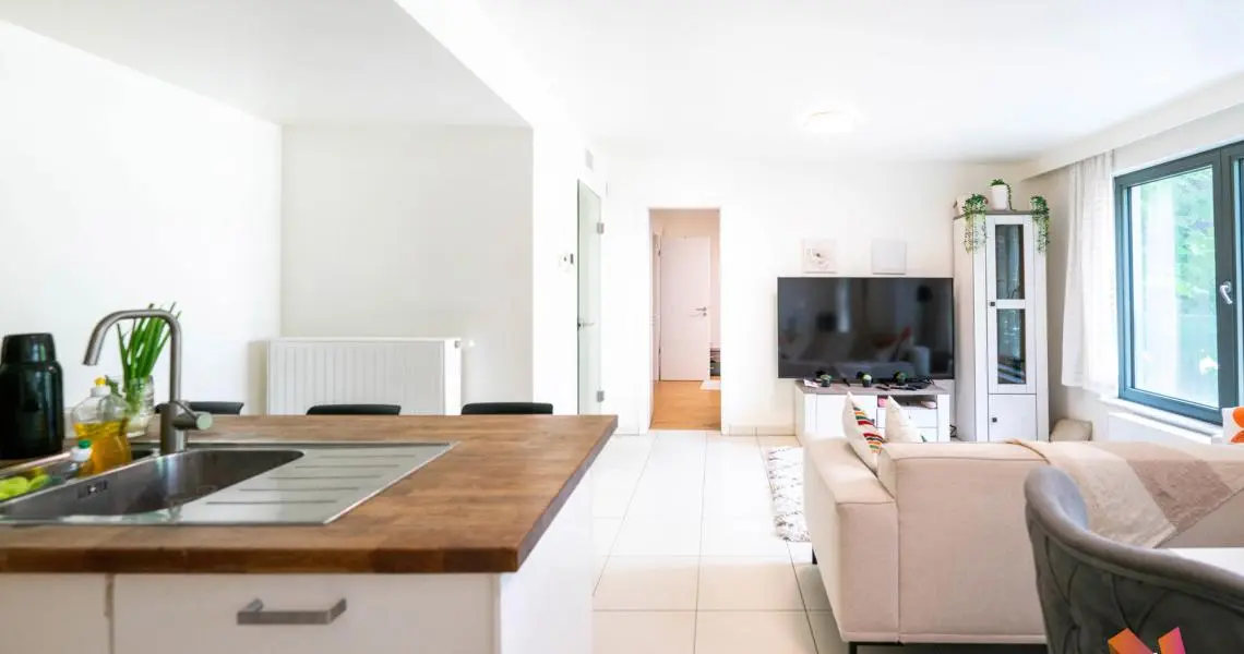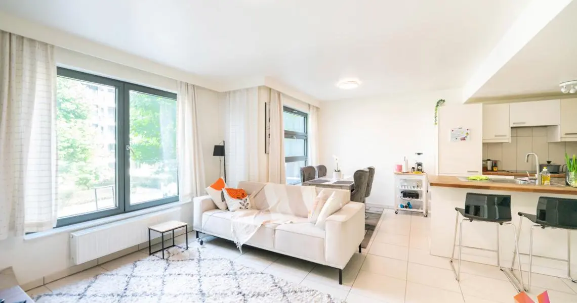 Forest, limite Uccle, à proximité du parc Duden, des commerces et transports en communs, superbe appartement dans un immeuble de 2015, calme, lumineux et offrant : hall d'entrée avec wc séparé, séjour de +/-30m2, cuisine américaine super équipée, chambre de +:- 15m2, salle de douche, buanderie.