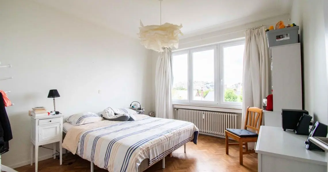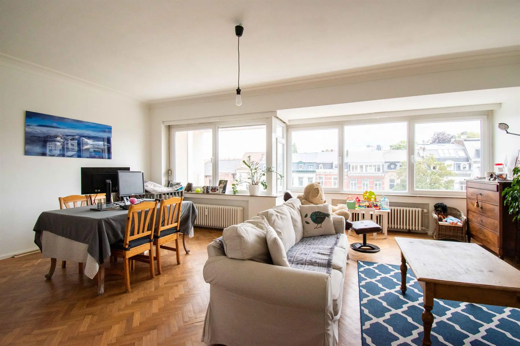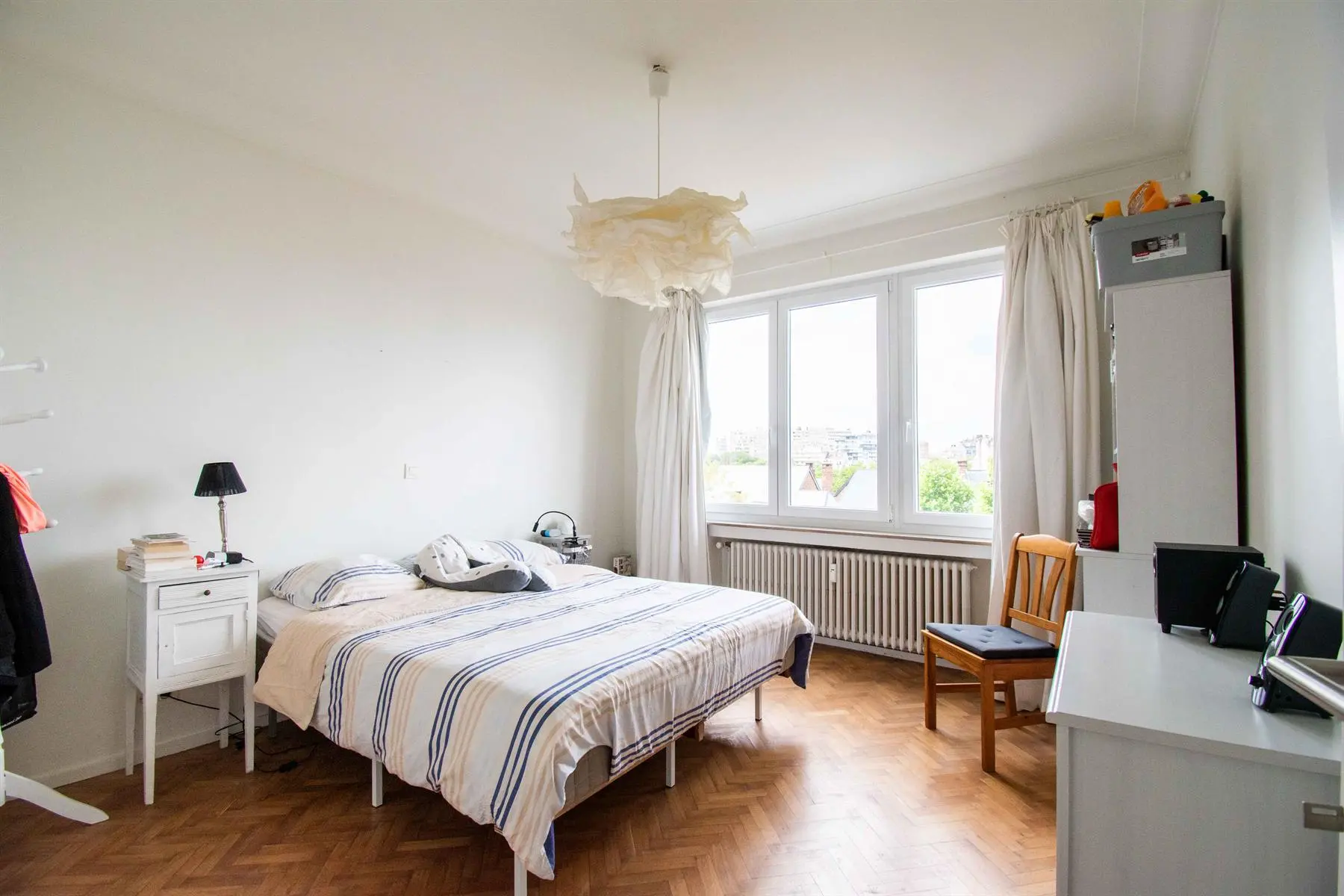 LOUE - Ixelles, à proximité de l'Abbaye de la cambre, des étangs d'ixelles, de l'ULB des commerces et des transports en communs, au 5ème étage d'un immeuble de 1949, superbe Appartement rénové de +/-105m², très lumineux, calme, et offrant : Hall d'entrée avec vestiaire, un vaste salon de +/-35m2 donnant accès à une terrasse de 3m², une cuisine ouverte hyper équipée avec un balcon à l'arrière et buanderie, hall de nuit, toilette indépendante, salle de bain, deux chambres (15 et 12m2). Double vitrage. Porte blindée. Cave. Charges de 150 euros : communs et chauffage. Disponible à partir du 15 Août. PEB : D- . A visiter sans tarder !