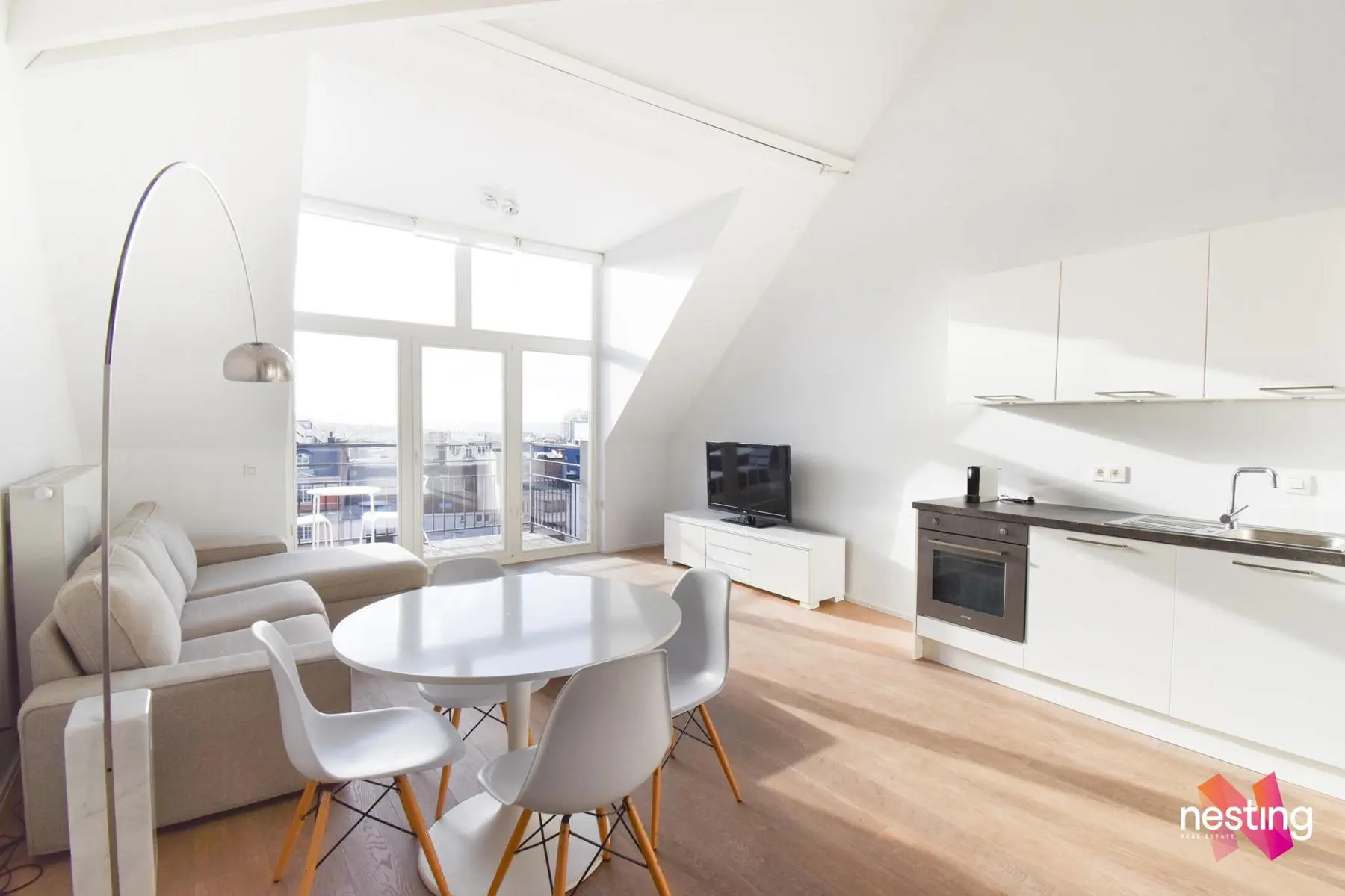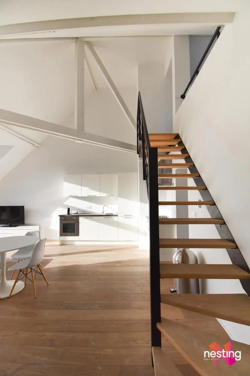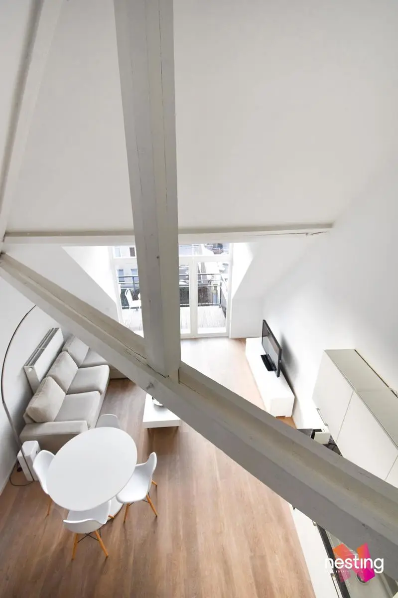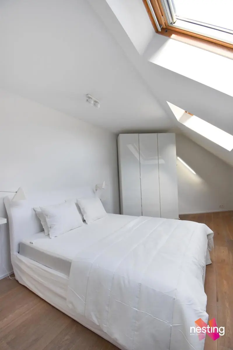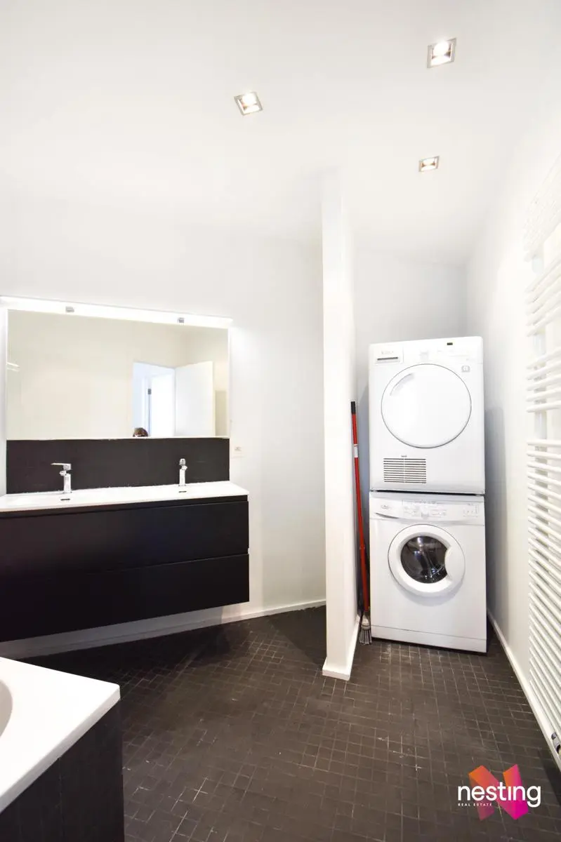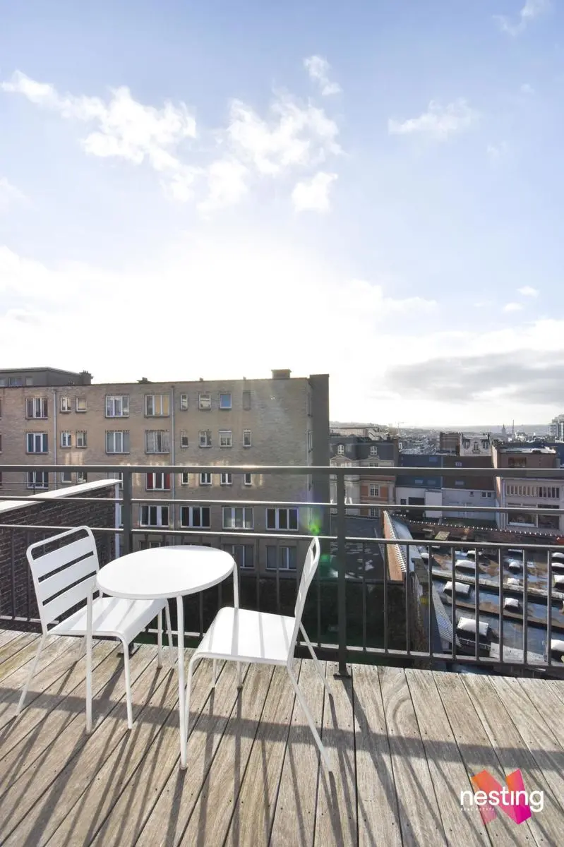 Une grande salle de séjour de +- 35m2 avec cuisine ouverte super équipée, une belle terrasse surplombant Bruxelles, un hall de nuit avec wc séparé, une salle de bains avec coin buanderie et une chambre de +- 17,5 m2. L'appartement dispose également d'une mezzanine avec chambre d'amis (canapé lit), d'une cave et d'un local vélo.