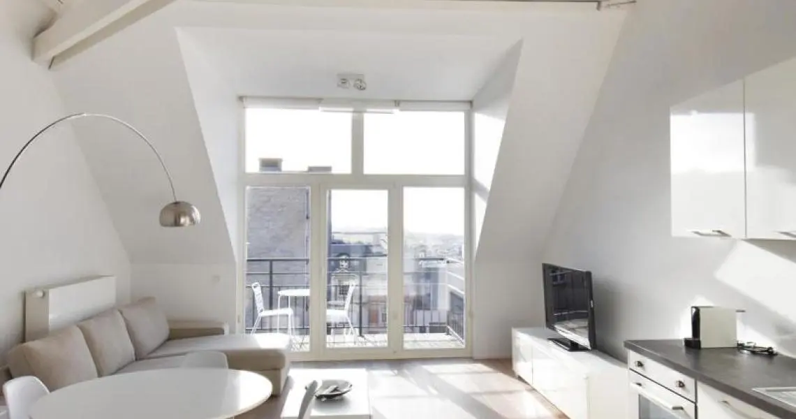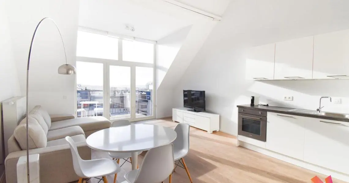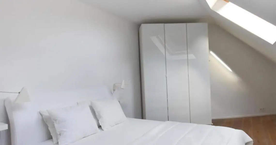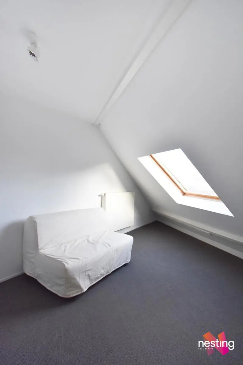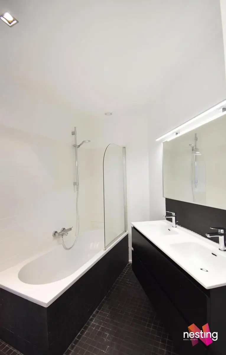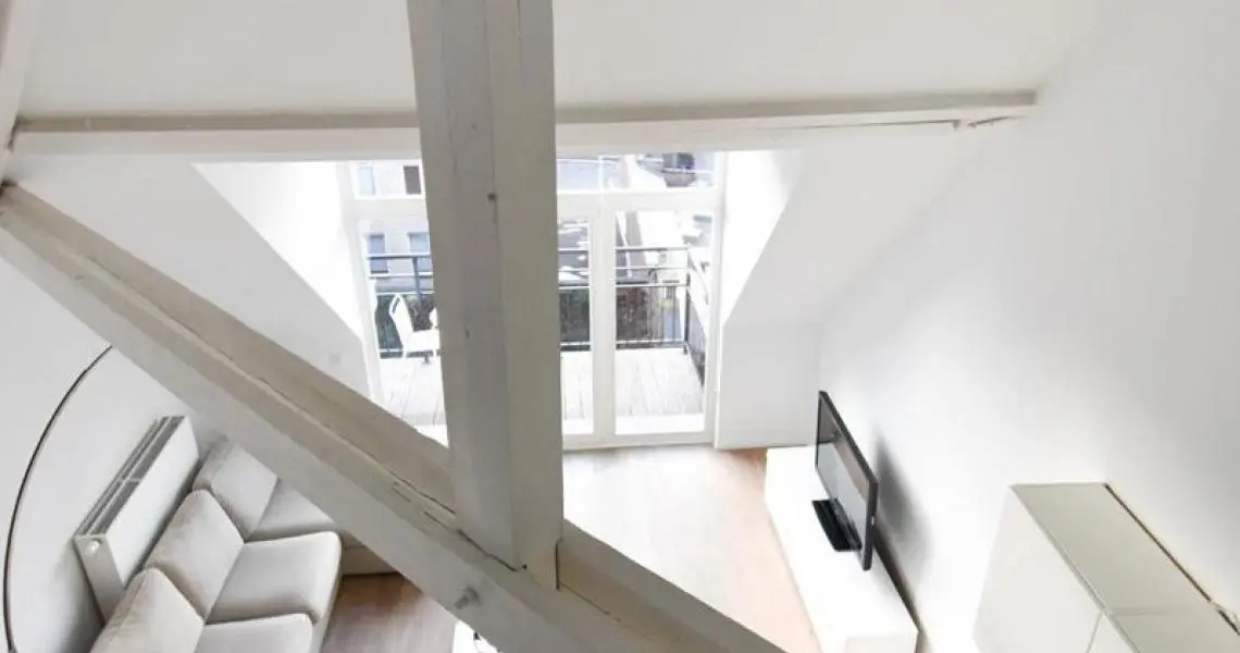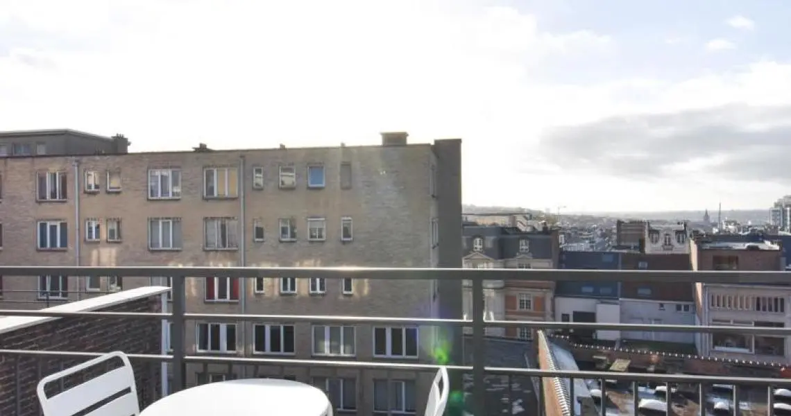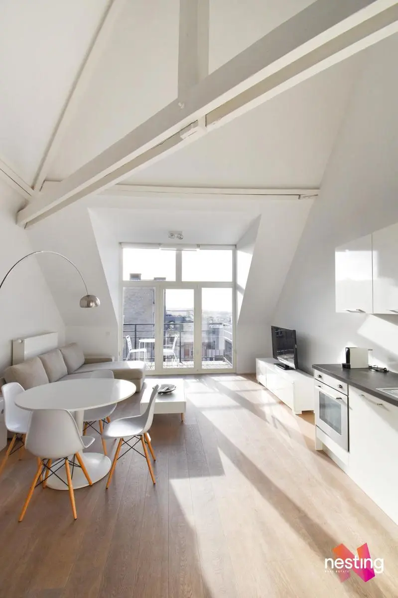 Une grande salle de séjour de +- 35m2 avec cuisine ouverte super équipée, une belle terrasse surplombant Bruxelles, un hall de nuit avec wc séparé, une salle de bains avec coin buanderie et une chambre de +- 17,5 m2. L'appartement dispose également d'une mezzanine avec chambre d'amis (canapé lit), d'une cave et d'un local vélo.
