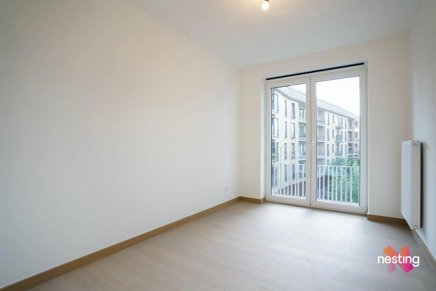 Hall d'entrée, salon de +/-35m2 avec cuisine US hyper équipée, deux chambres( 15m2 et 9m2), salle de bain avec baignoire, w.c. séparé, espace buanderie. Il est possible d'accéder à la terrasse de +/-7m2 depuis les chambres et le séjour.