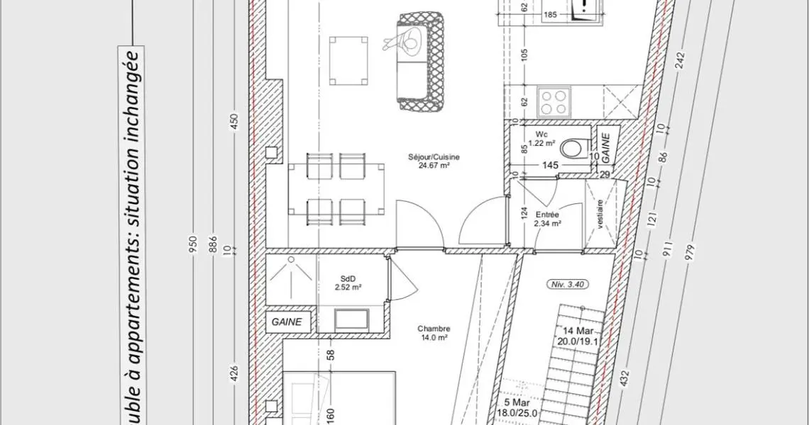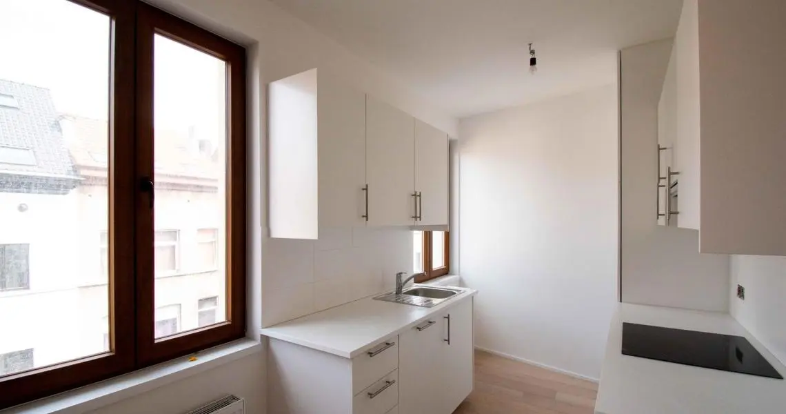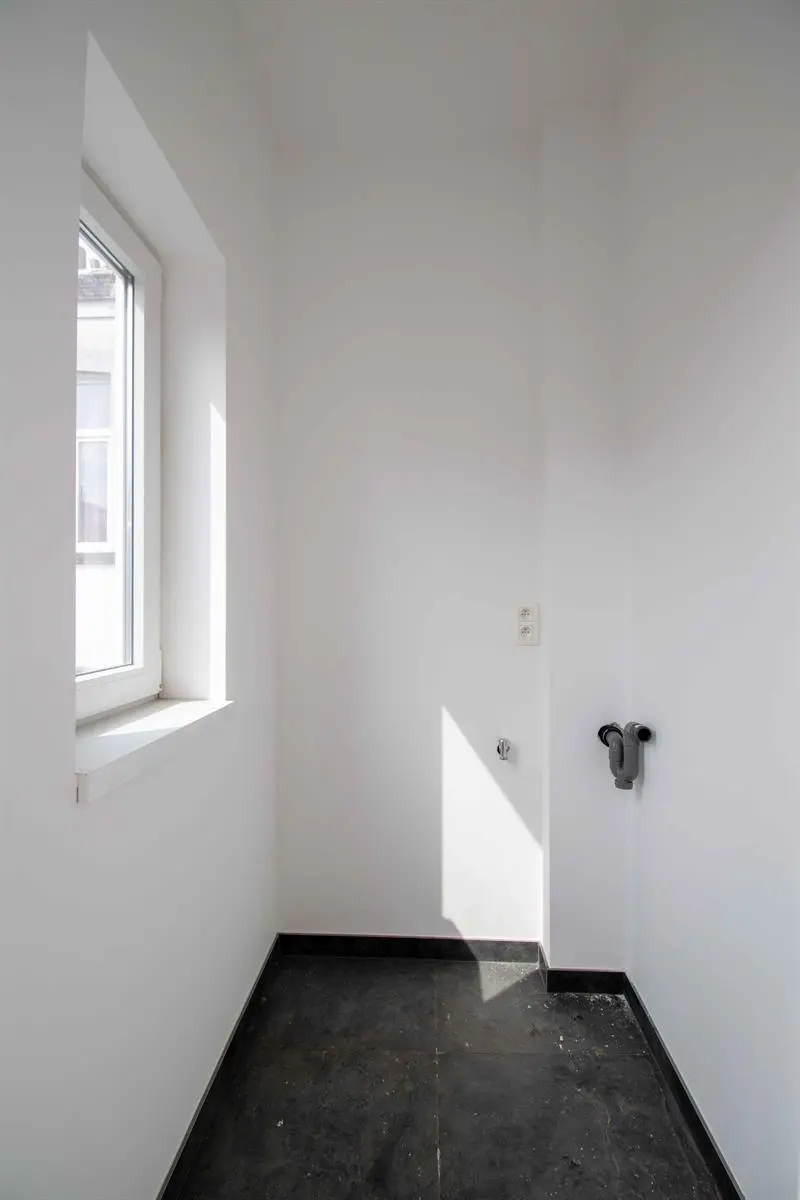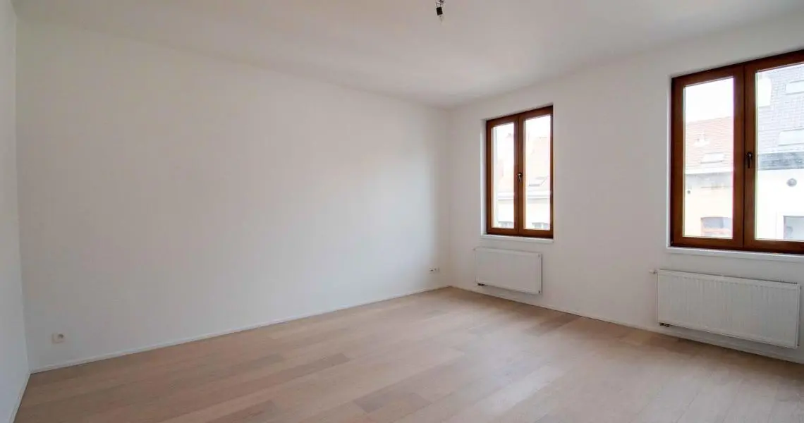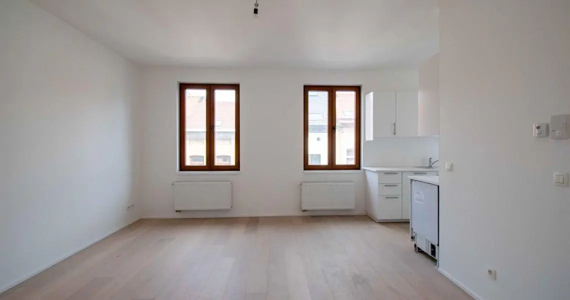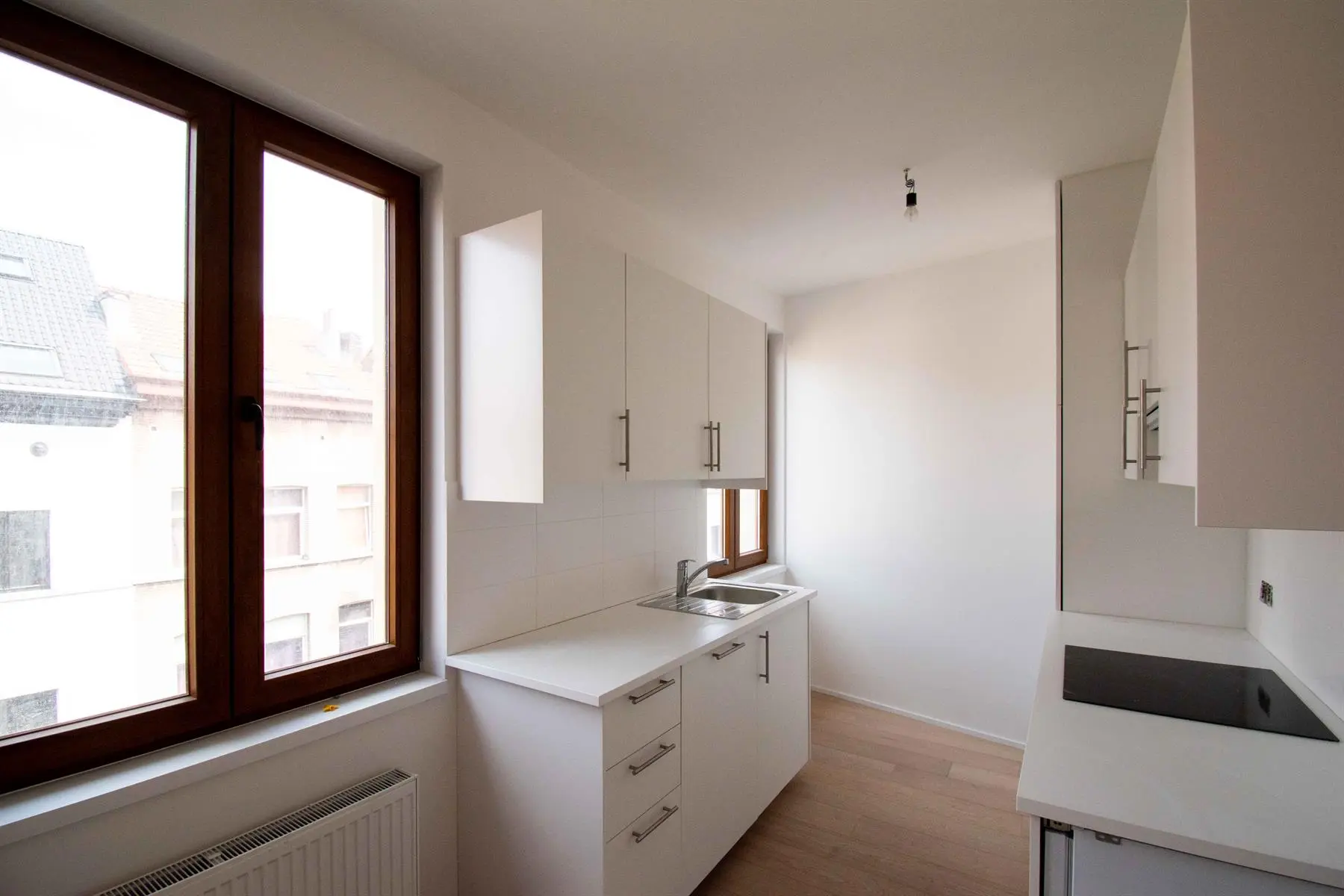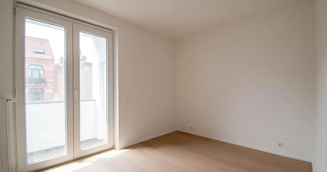 Saint-Gilles, à proximité immédiate de la place Van Meenen, des commerces et des transports en communs, dans un immeuble entièrement rénové (1ere occupation), superbe appartement au 3ème et dernier étage, parquet partout, lumineux et offrant : hall d'entrée avec vestiaire et wc séparé, beau séjour, cuisine Us équipée, 1 chambre de +- 14m², salle de douche, wc séparé, terrasse arrière de +- 4 m².