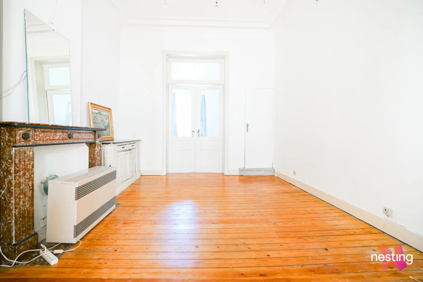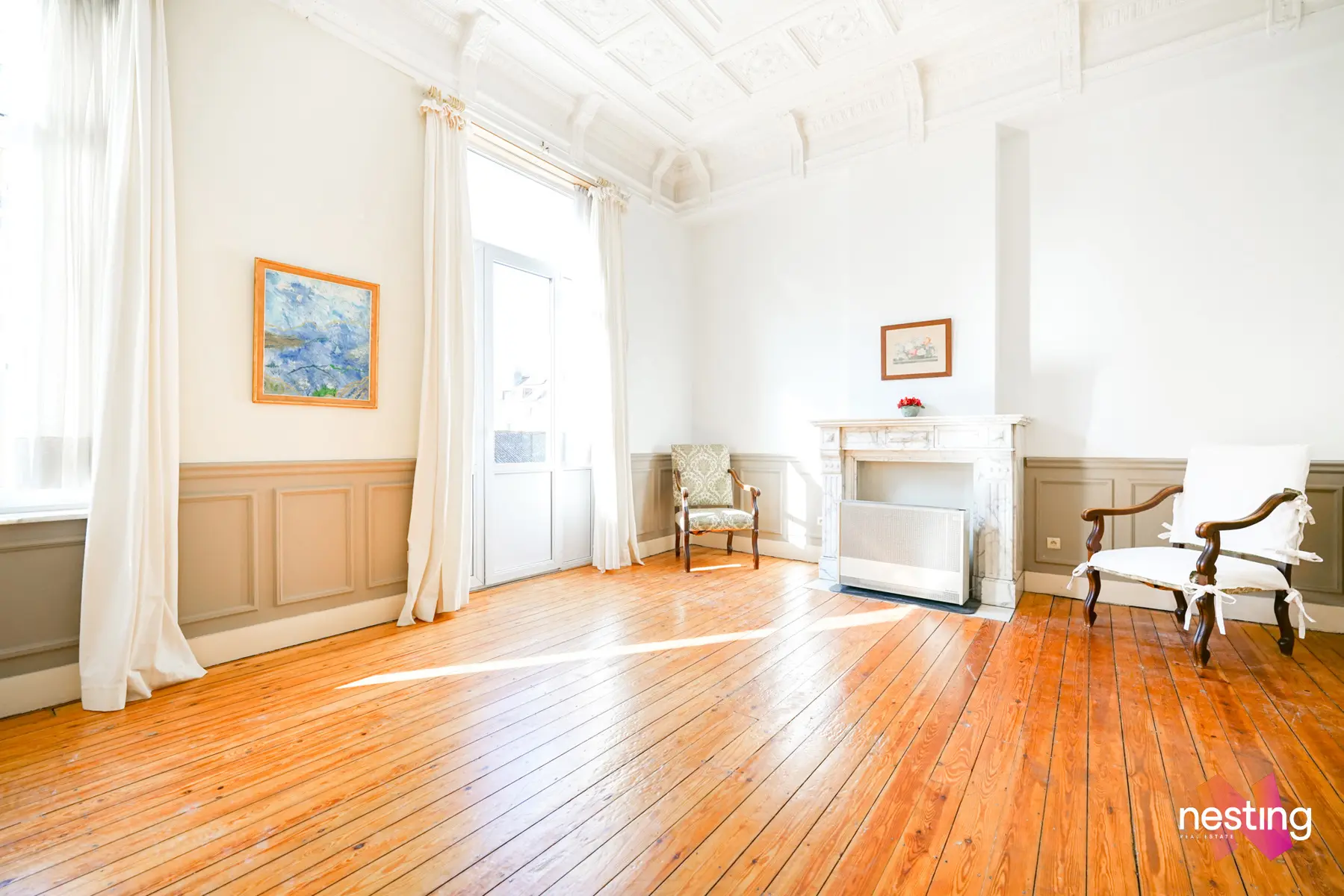 Un grand salon de près de 30 m². Ce vaste espace est agrémenté de magnifiques moulures au plafond, ajoutant une touche d'élégance et de caractère. Le salon s'ouvre sur un balcon, parfait pour profiter de l'air frais.