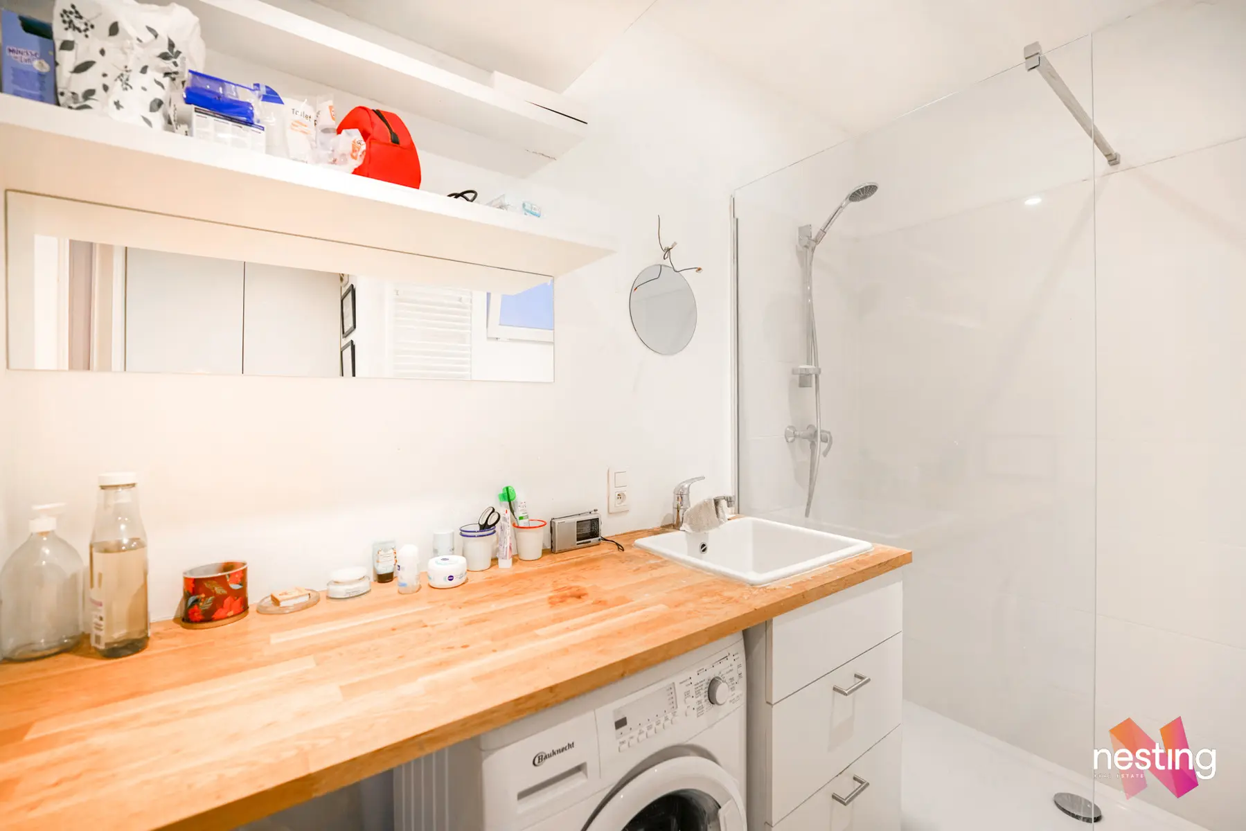 Un hall d'entrée, une salle de douche avec une machine à laver, une cuisine américaine super-équipée, un grand séjour de +-24m², une salle à manger donnant acces au premier balcon et une chambre spacieuse de +-18m² disposant d'un second balcon.