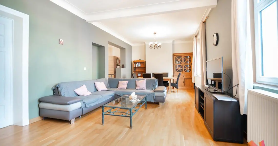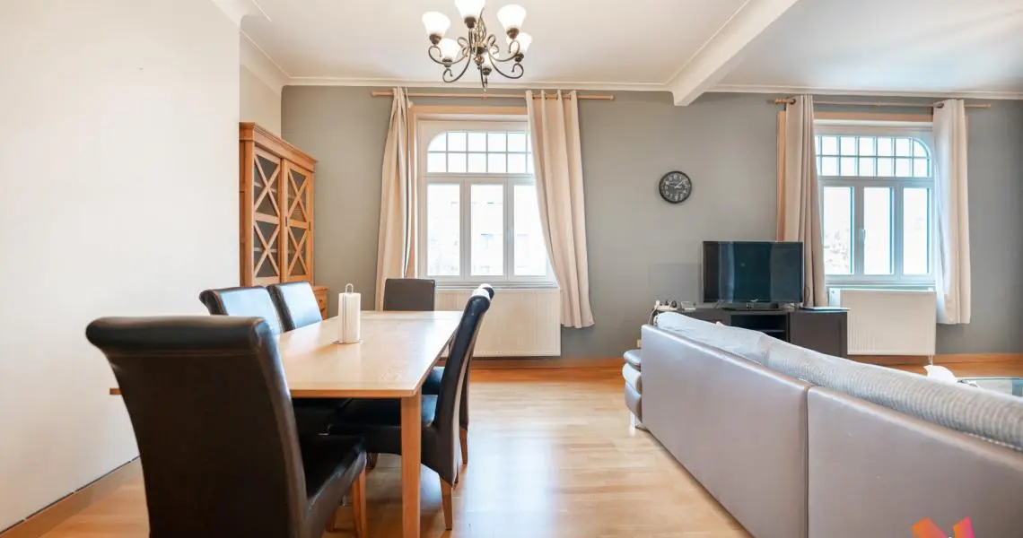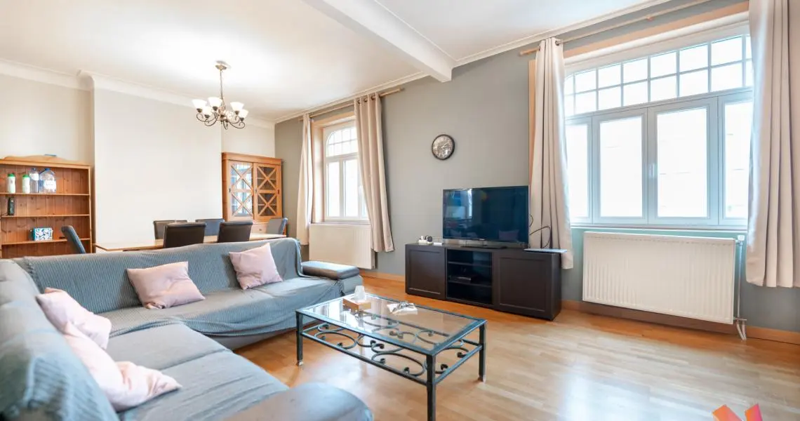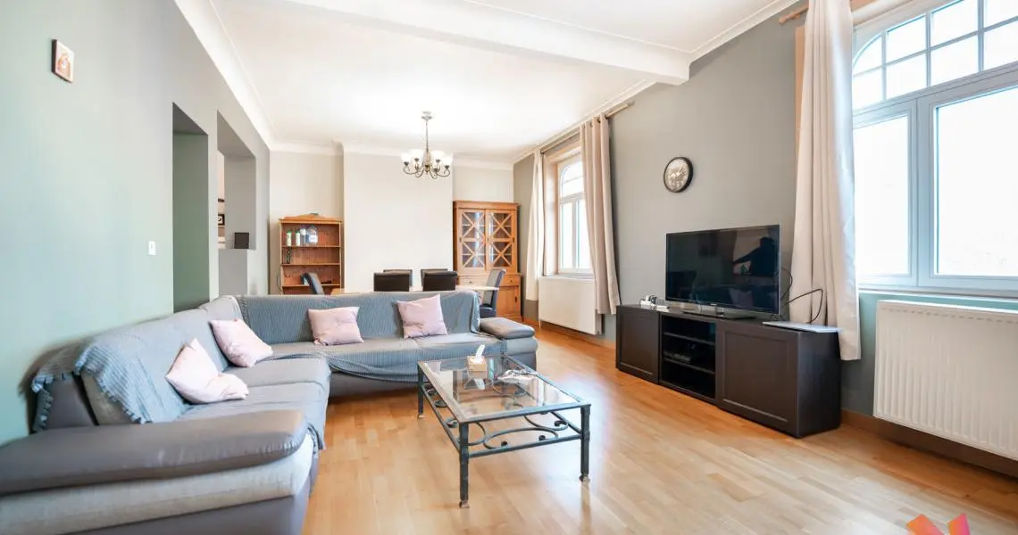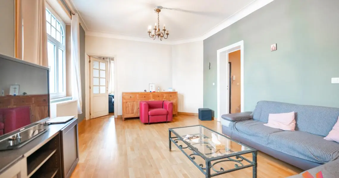 L'appartement se trouve dans une petite copropriété bien gérée au 3e étage sur 4 et se compose comme suit : un grand hall d'entrée, un beau séjour lumineux de +- 36m2, une cuisine ouverte, 2 chambres (+-17 et 12m2) et une salle de bains avec wc.