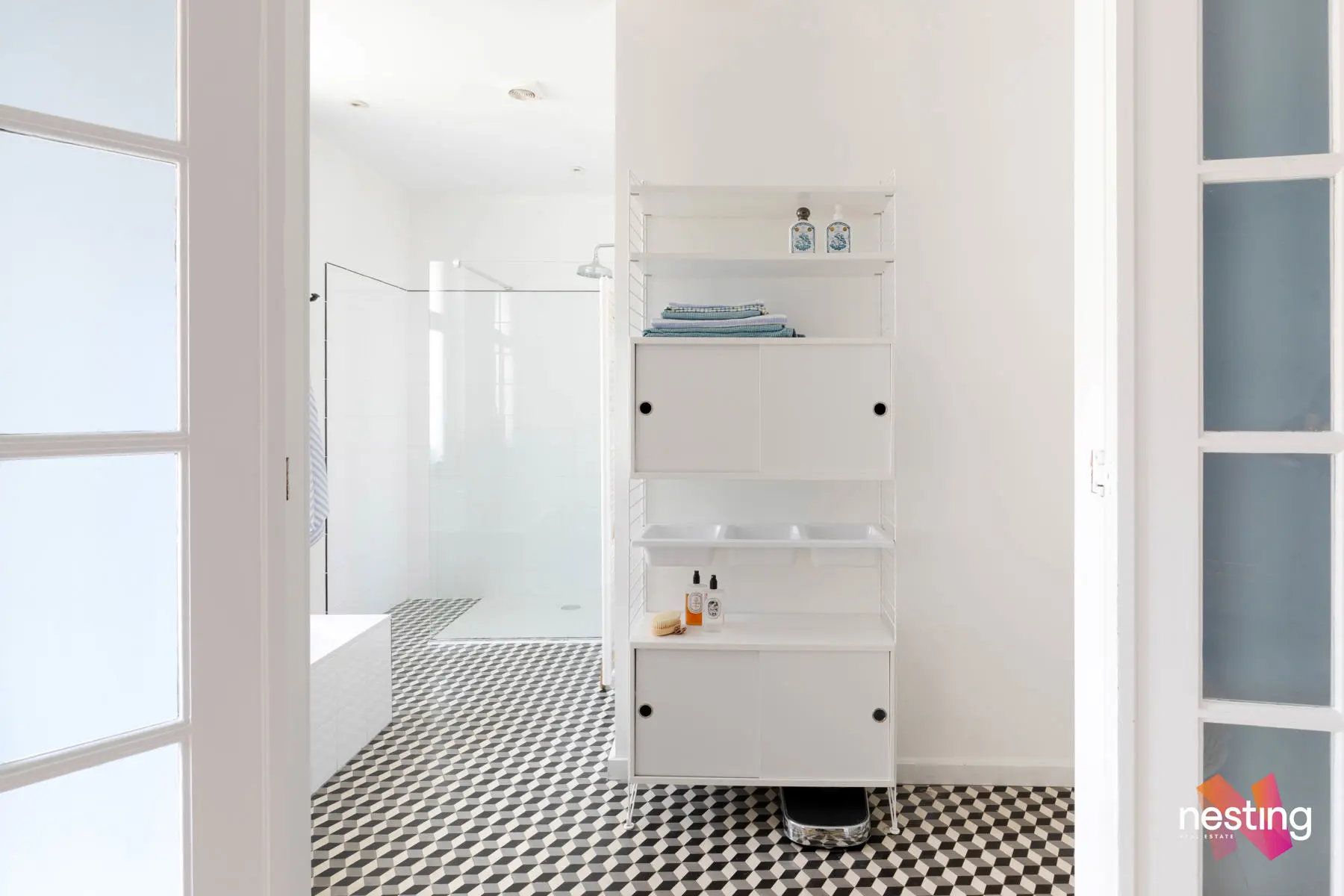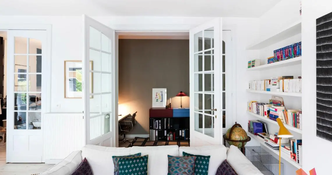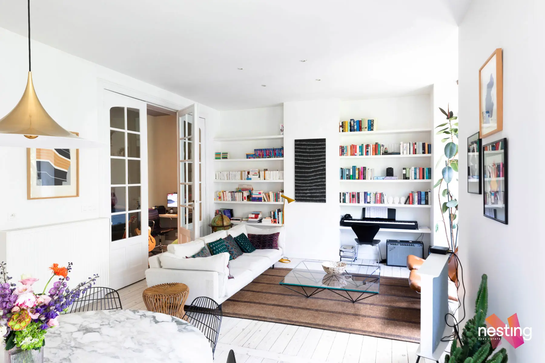 Nombreux rangements sur mesure, cachet et éléments d’époque conservés (portes, terrazzo), hauts plafonds