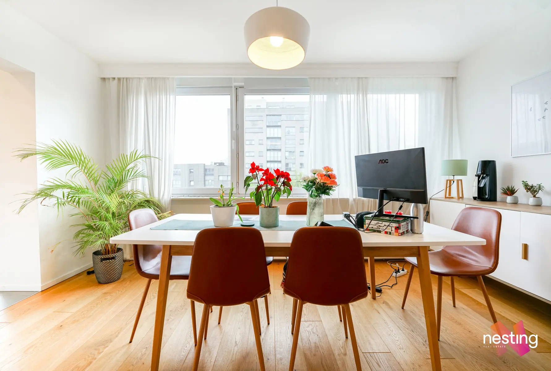 Appartement spacieux de +/- 90m2 au 5e étage très lumineux, complètement meublé (électroménager & TV compris), dans un environnement calme offrant :