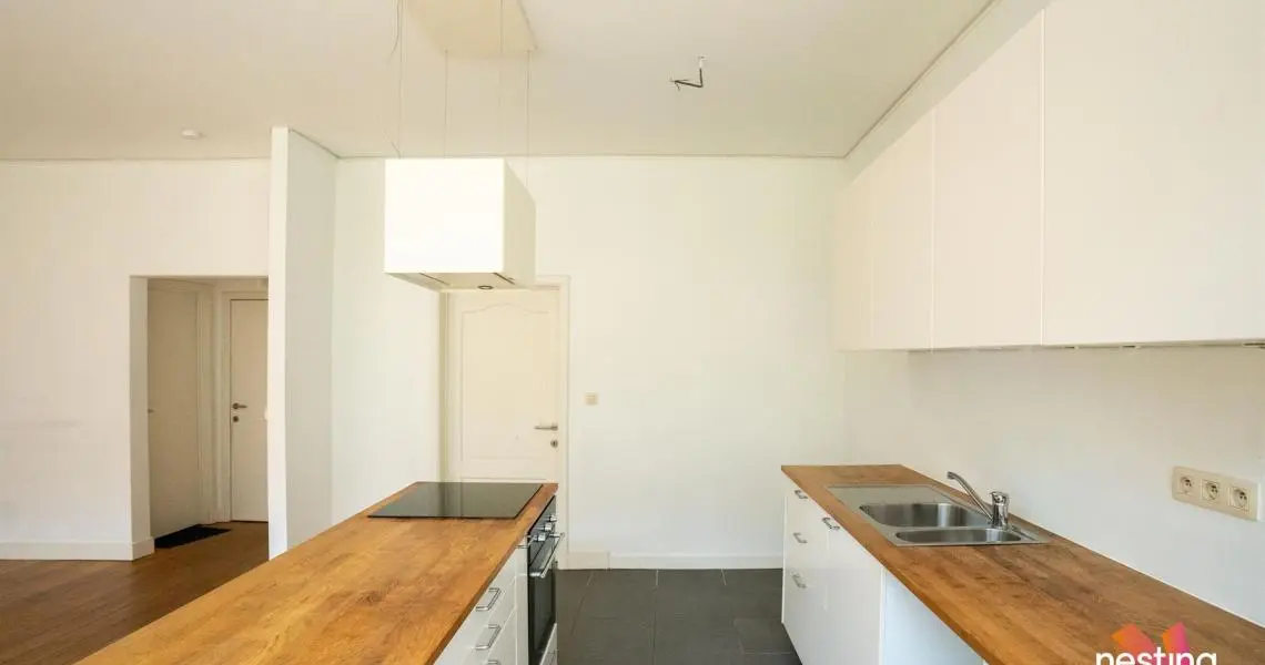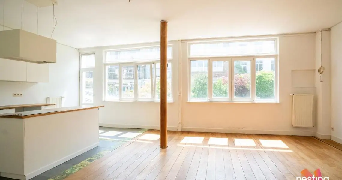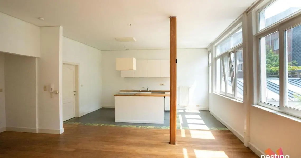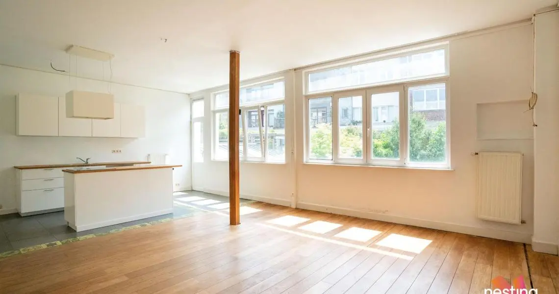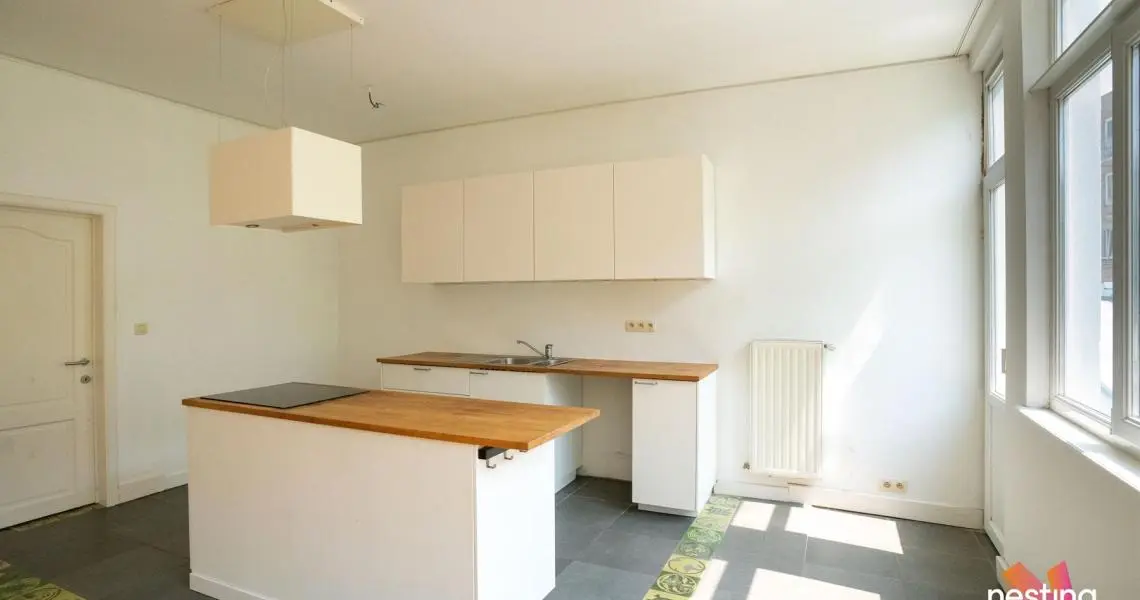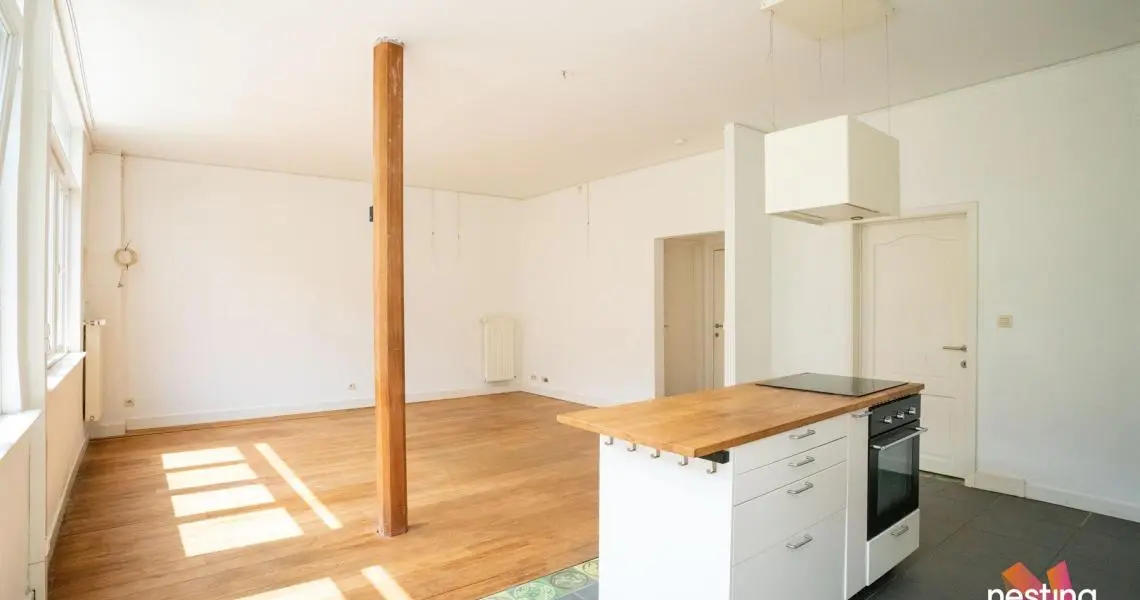 hall d'entrée, wc séparé, grand séjour, cuisine US semi-équipée, chambre avec accès à une terrasse de +/-15m², salle de bains.