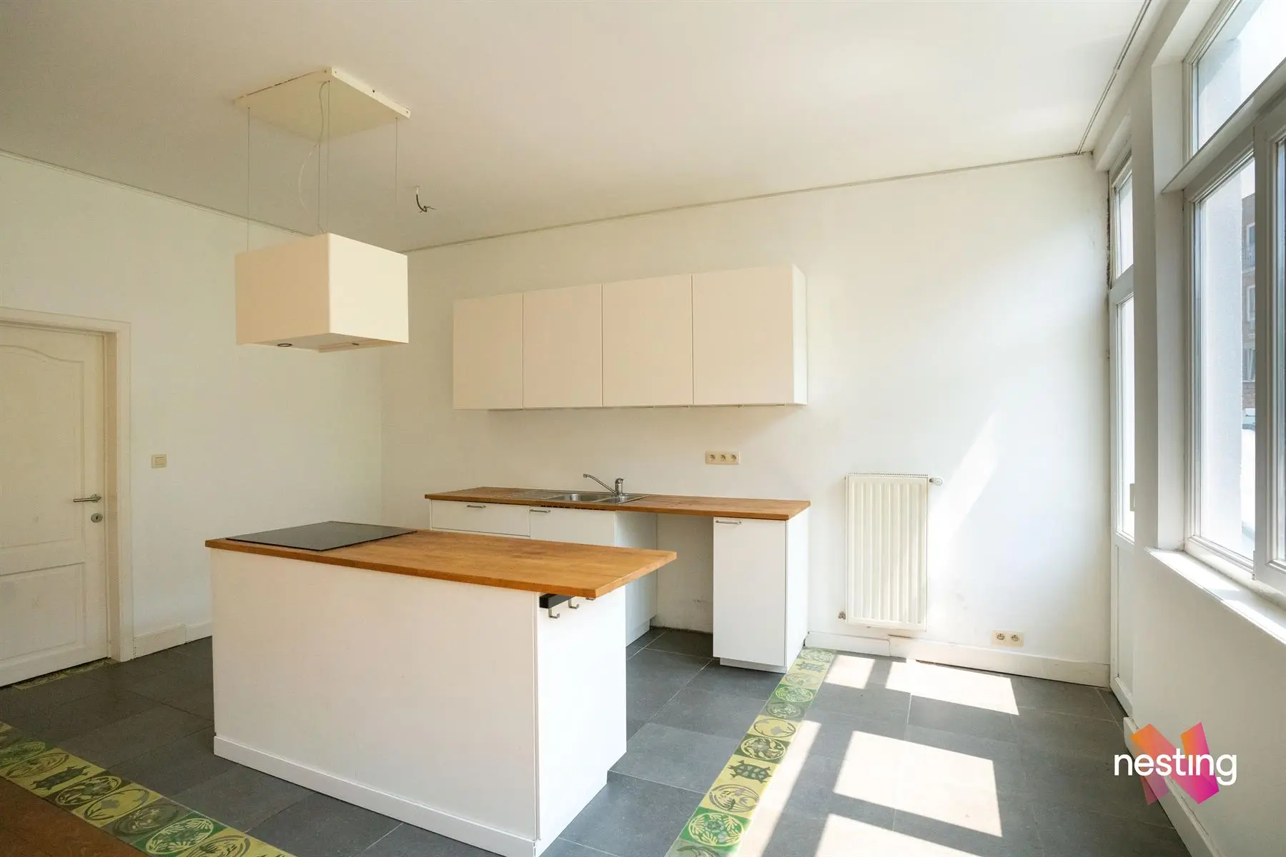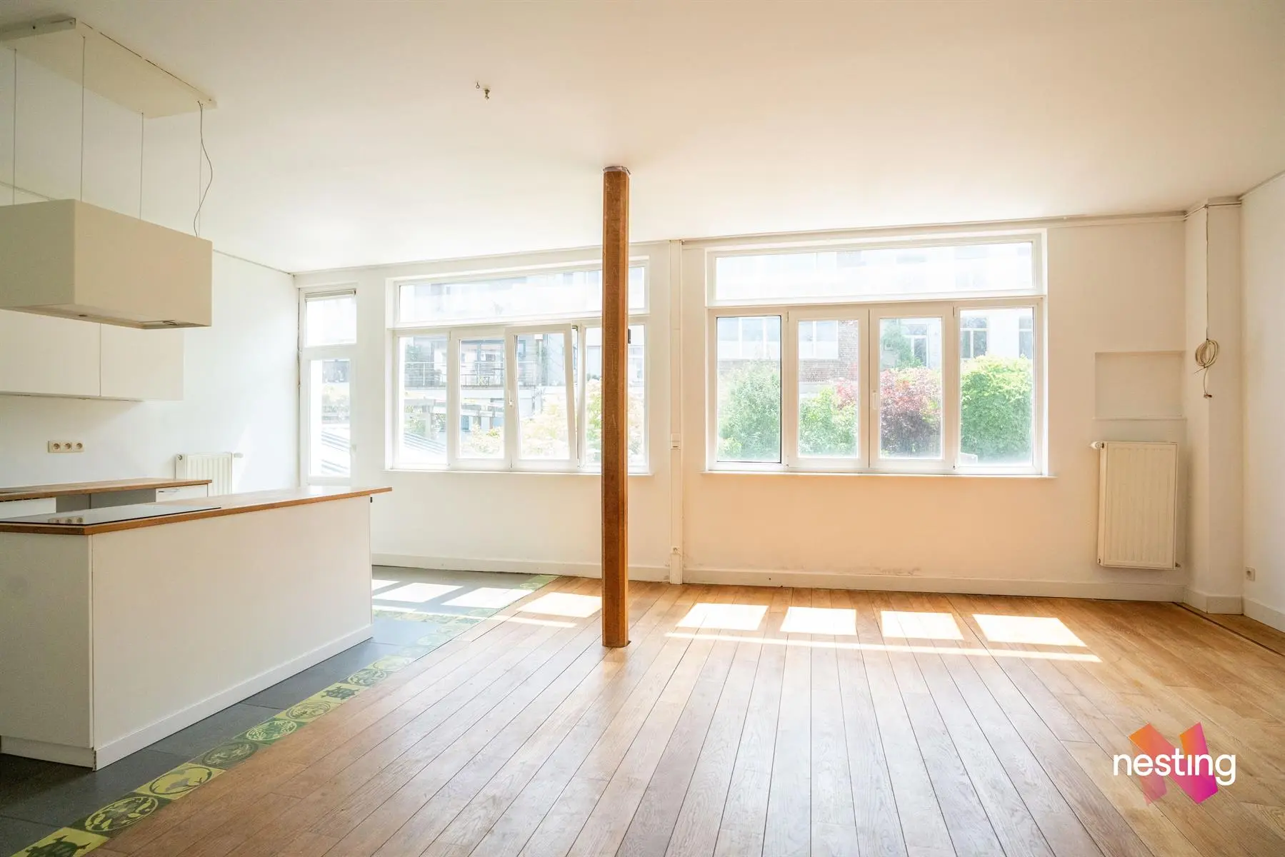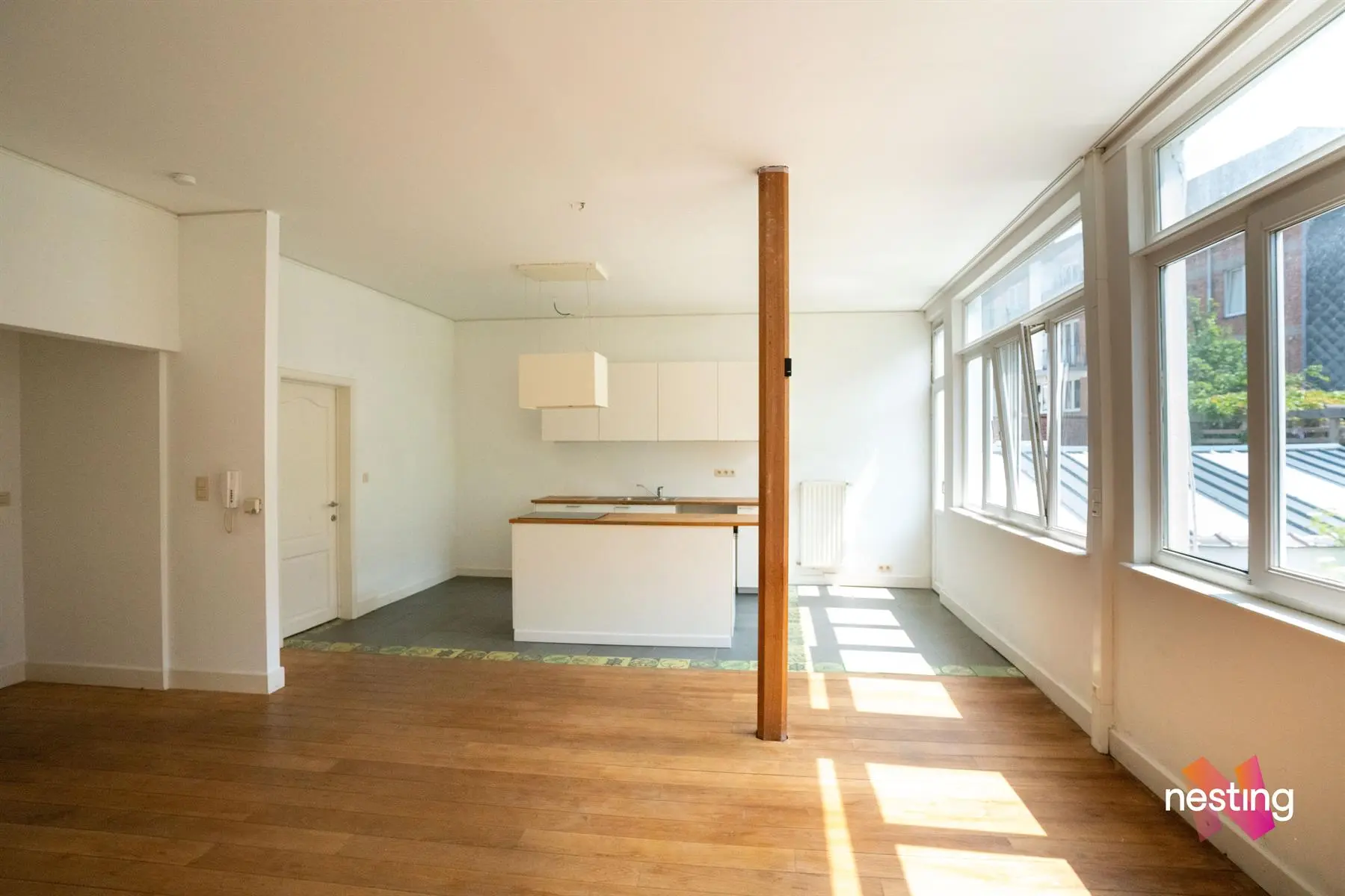 hall d'entrée, wc séparé, grand séjour, cuisine US semi-équipée, chambre avec accès à une terrasse de +/-15m², salle de bains.