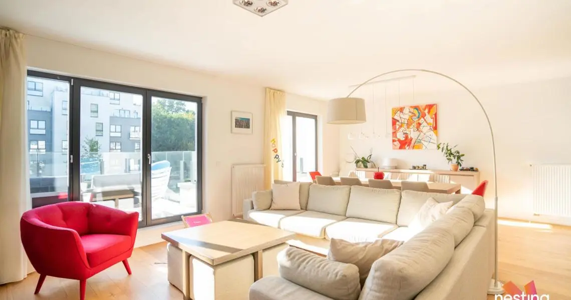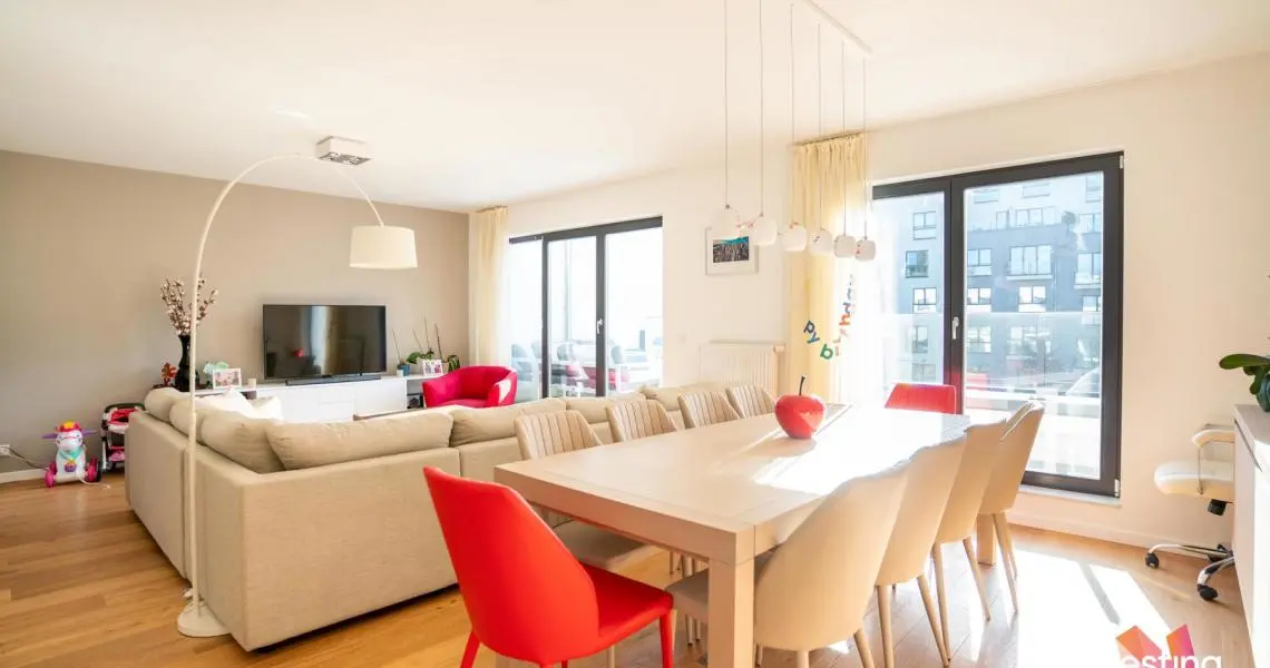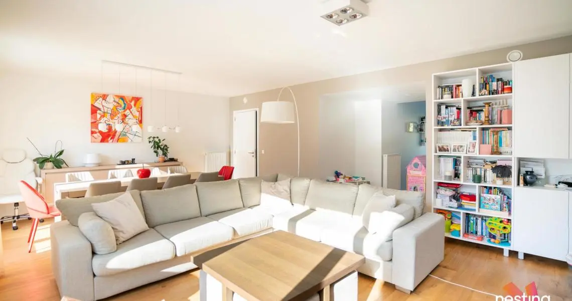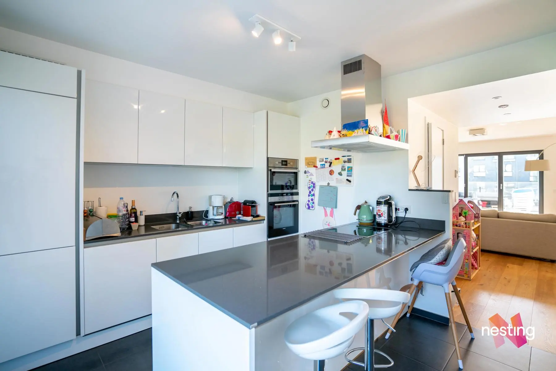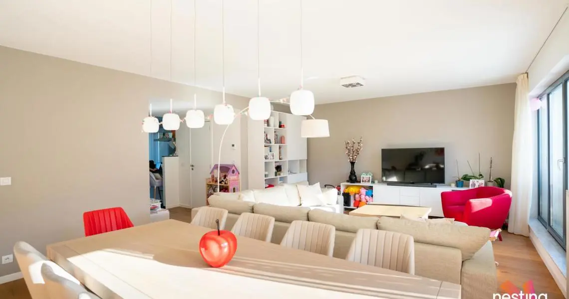 Hall d'entrée avec wc séparé, vaste séjour de +- 40m2 donnant sur une terrasse de +/-20m2 orientée plein sud, une cuisine entièrement équipée, hall de nuit avec placards, grande masterbedroom avec dressing et sa propre salle de bain avec wc, 2 chambres qui partagent une salle de douche, buanderie.