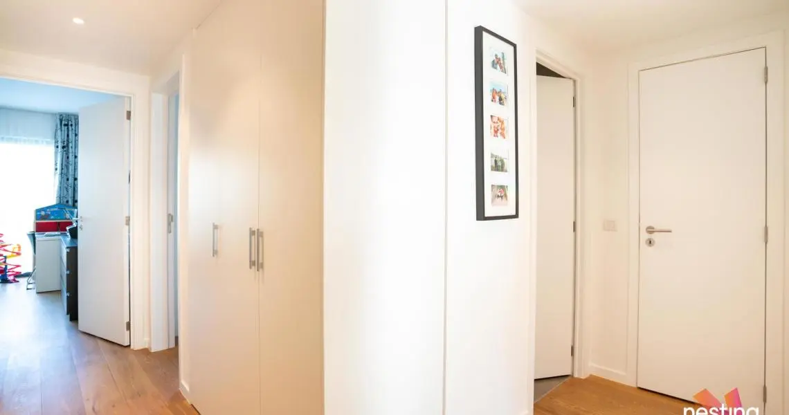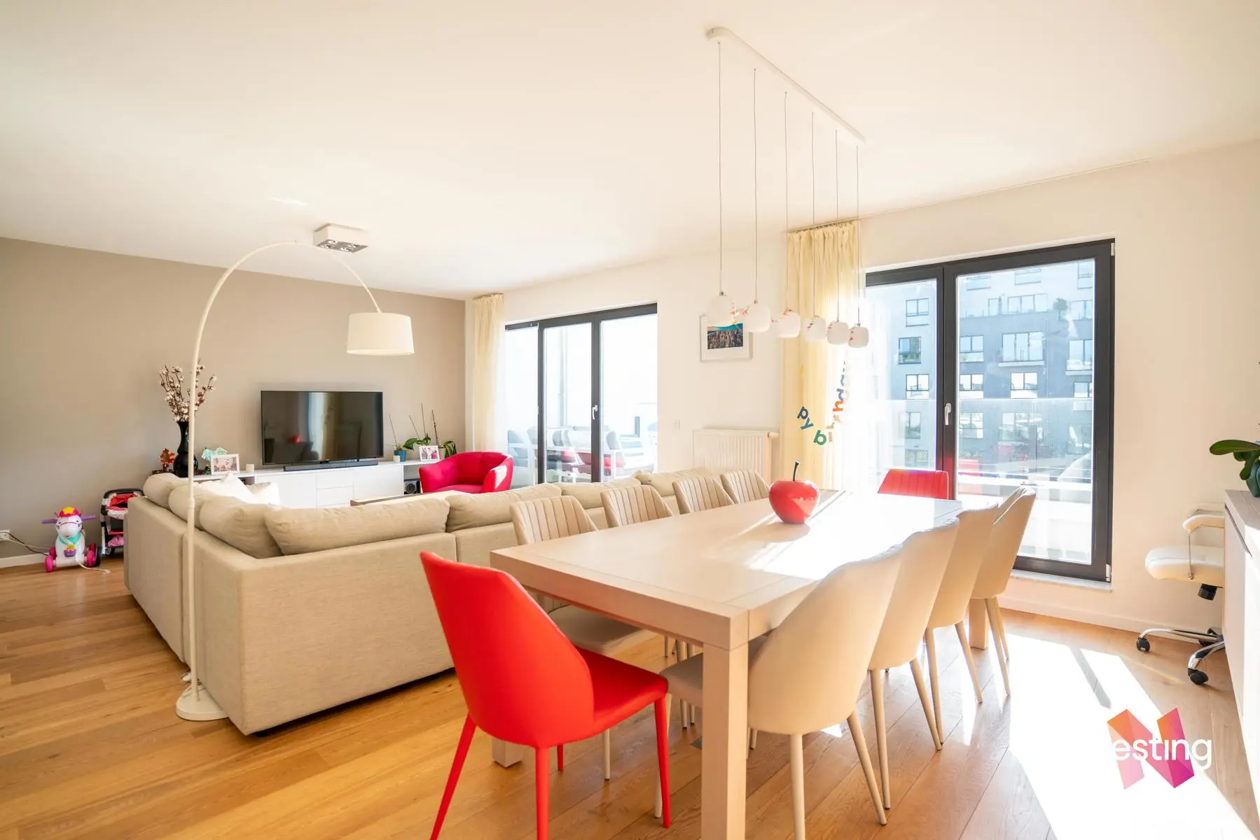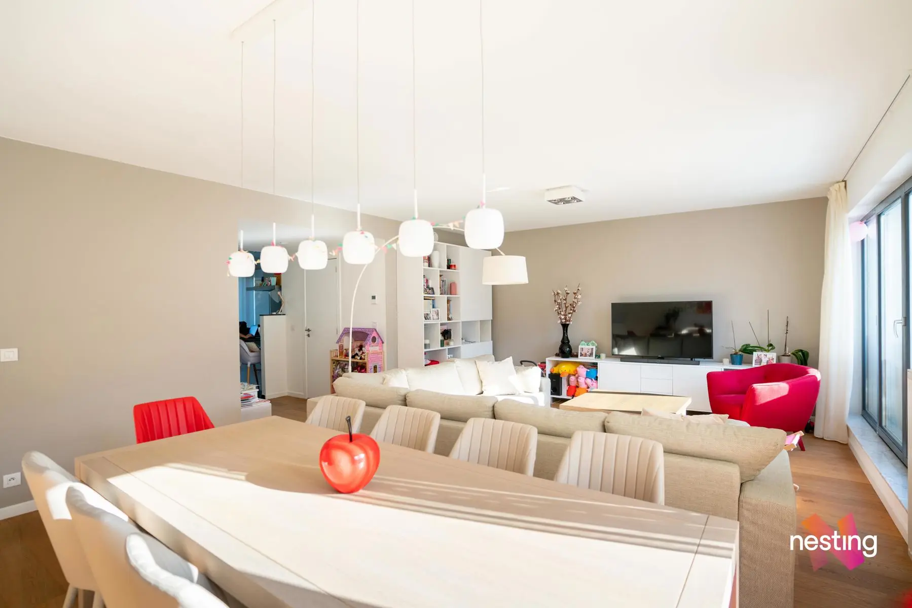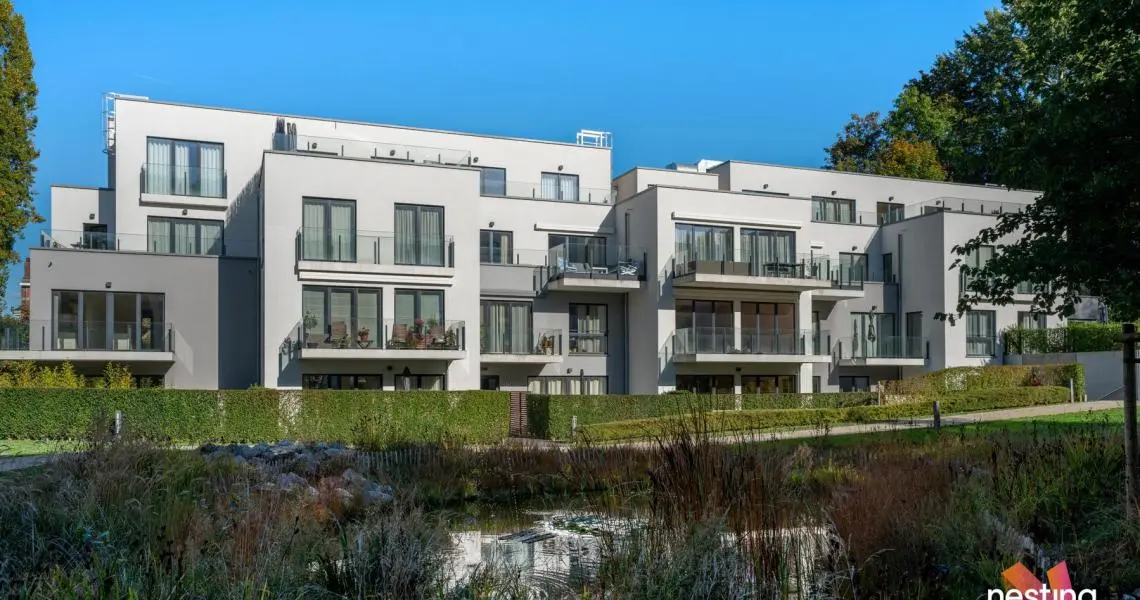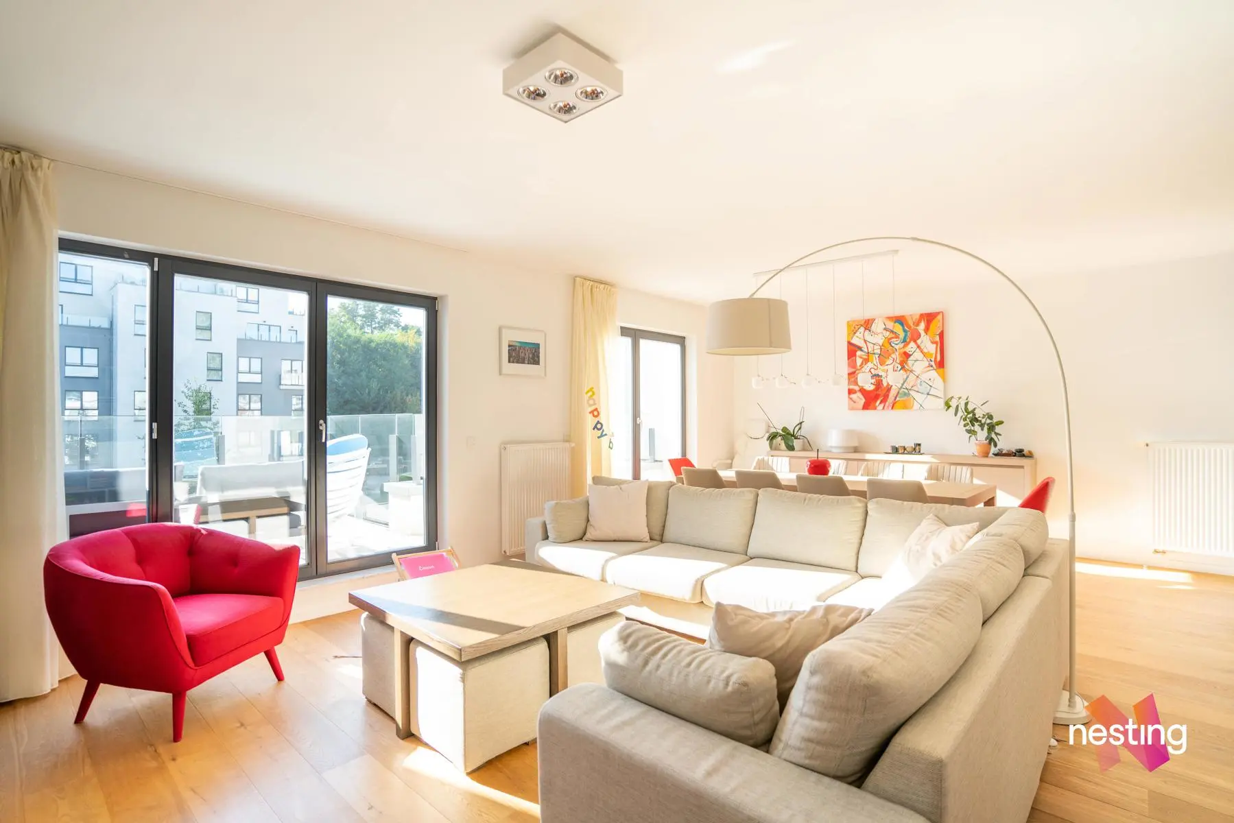 Hall d'entrée avec wc séparé, vaste séjour de +- 40m2 donnant sur une terrasse de +/-20m2 orientée plein sud, une cuisine entièrement équipée, hall de nuit avec placards, grande masterbedroom avec dressing et sa propre salle de bain avec wc, 2 chambres qui partagent une salle de douche, buanderie.