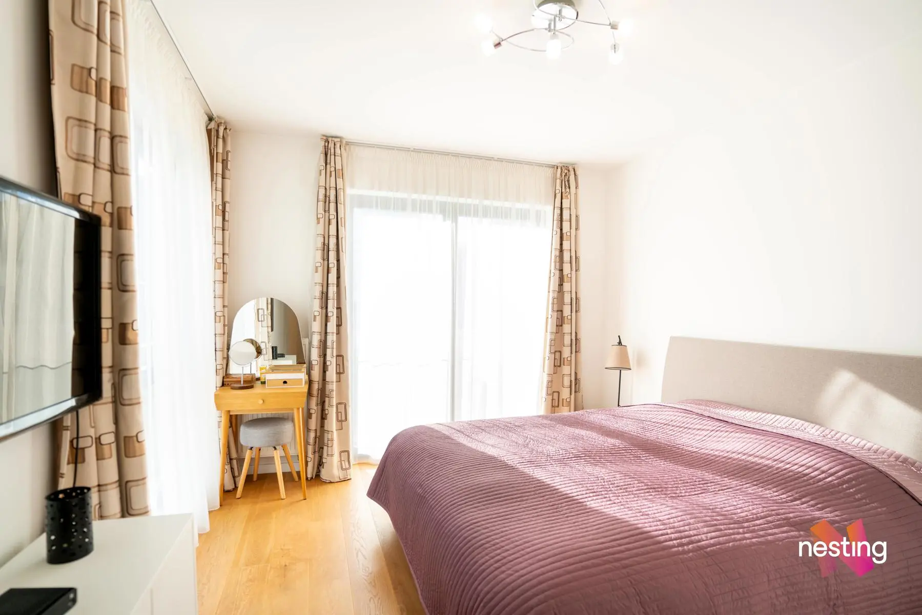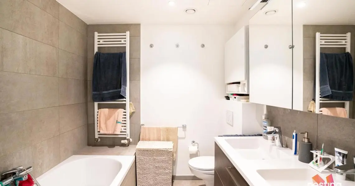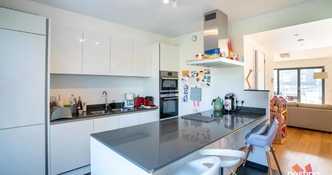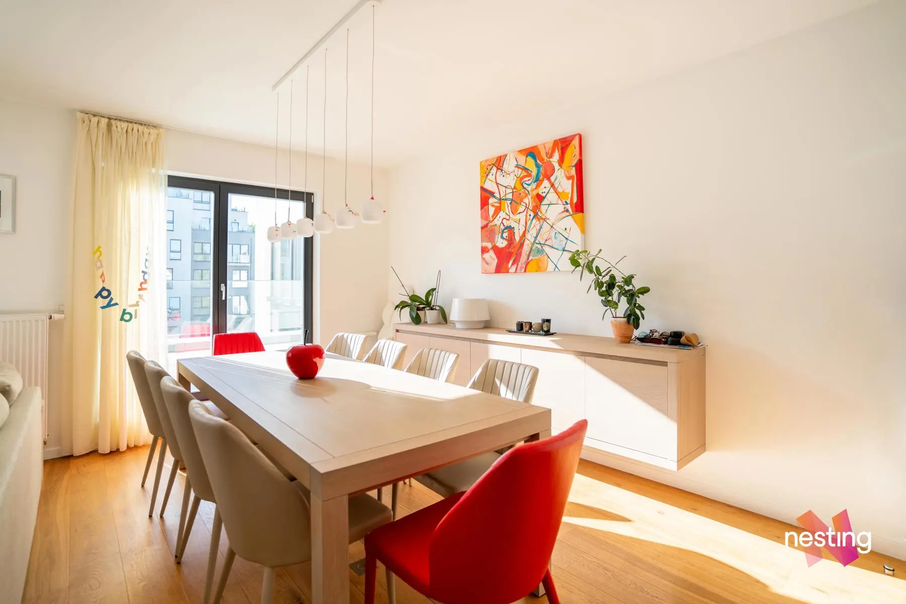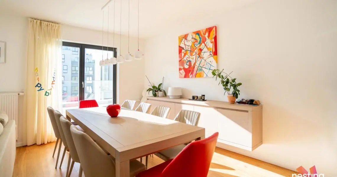 Hall d'entrée avec wc séparé, vaste séjour de +- 40m2 donnant sur une terrasse de +/-20m2 orientée plein sud, une cuisine entièrement équipée, hall de nuit avec placards, grande masterbedroom avec dressing et sa propre salle de bain avec wc, 2 chambres qui partagent une salle de douche, buanderie.