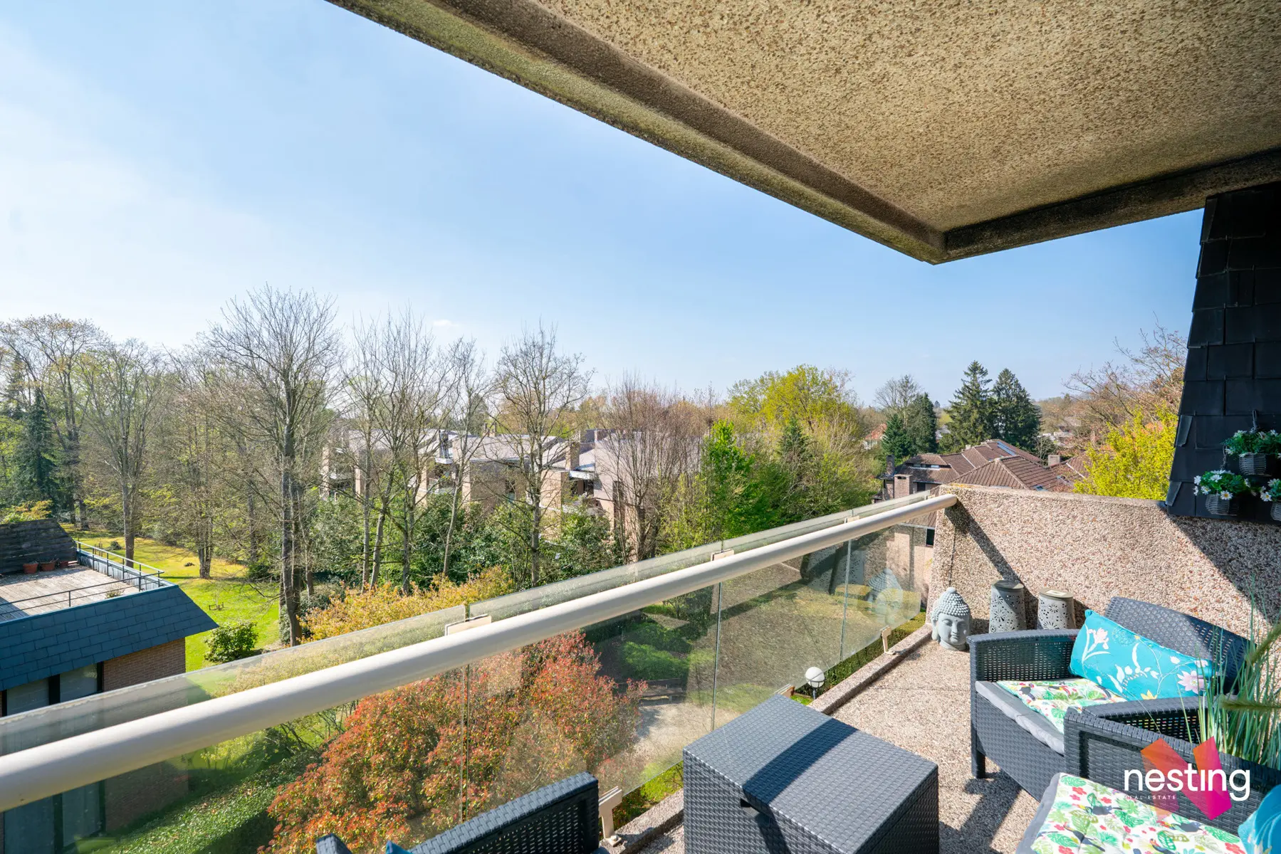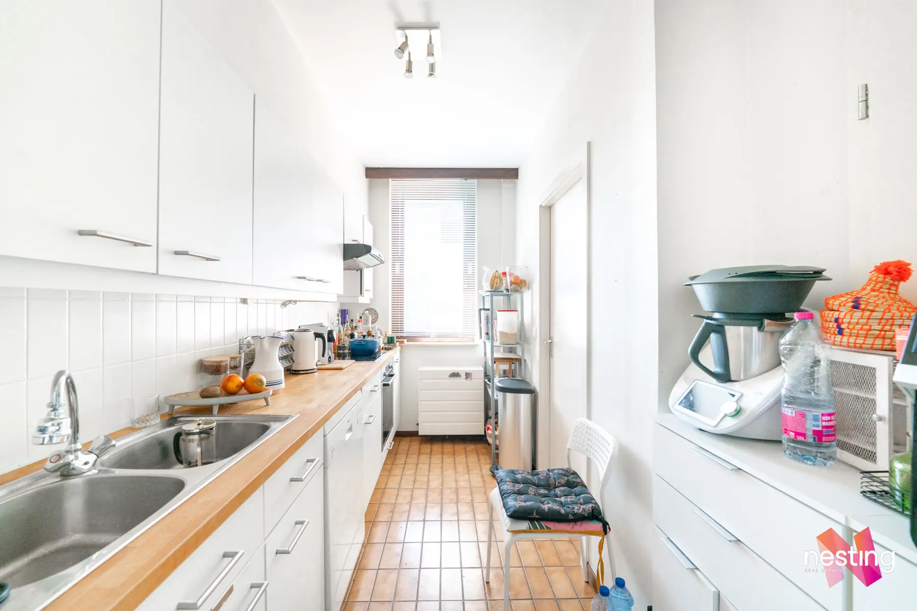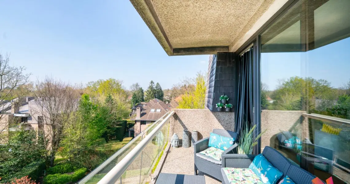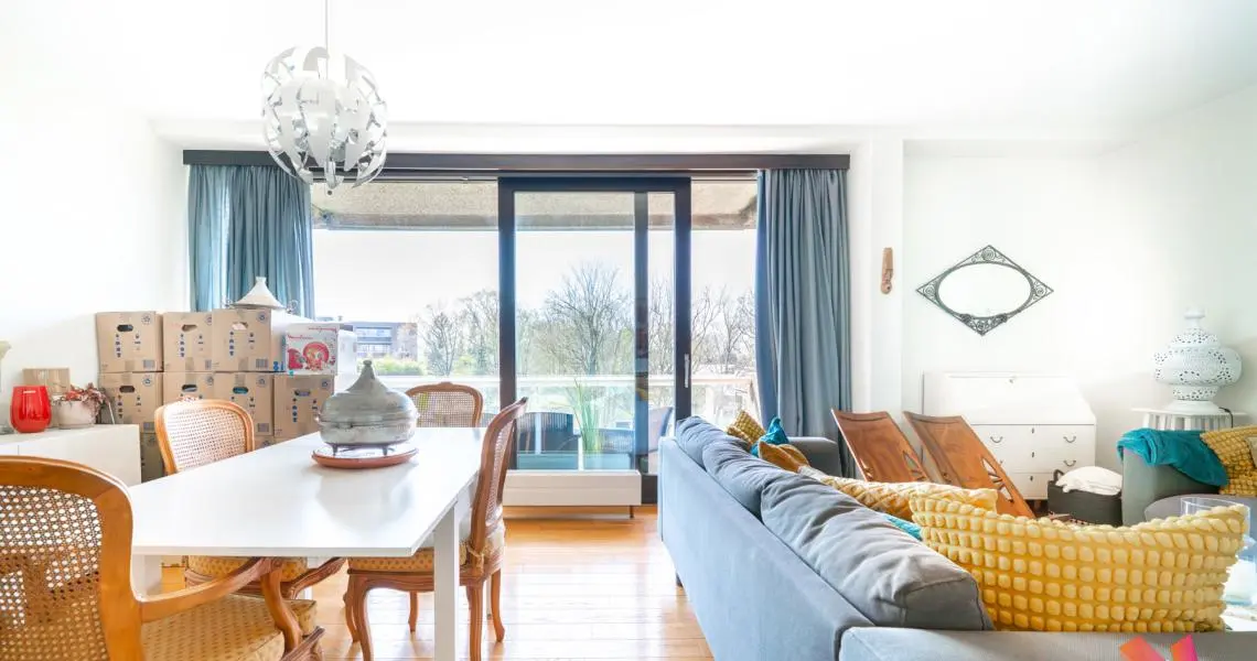 Un hall d'entrée avec vestiaire, une buanderie, un grand séjour de +- 30m2 donnant accès à une terrasse exposée ouest, une cuisine séparée super équipée, deux chambres de +- 13,5m2 et +- 16,5m2, une salle de bains et deux WC séparés.