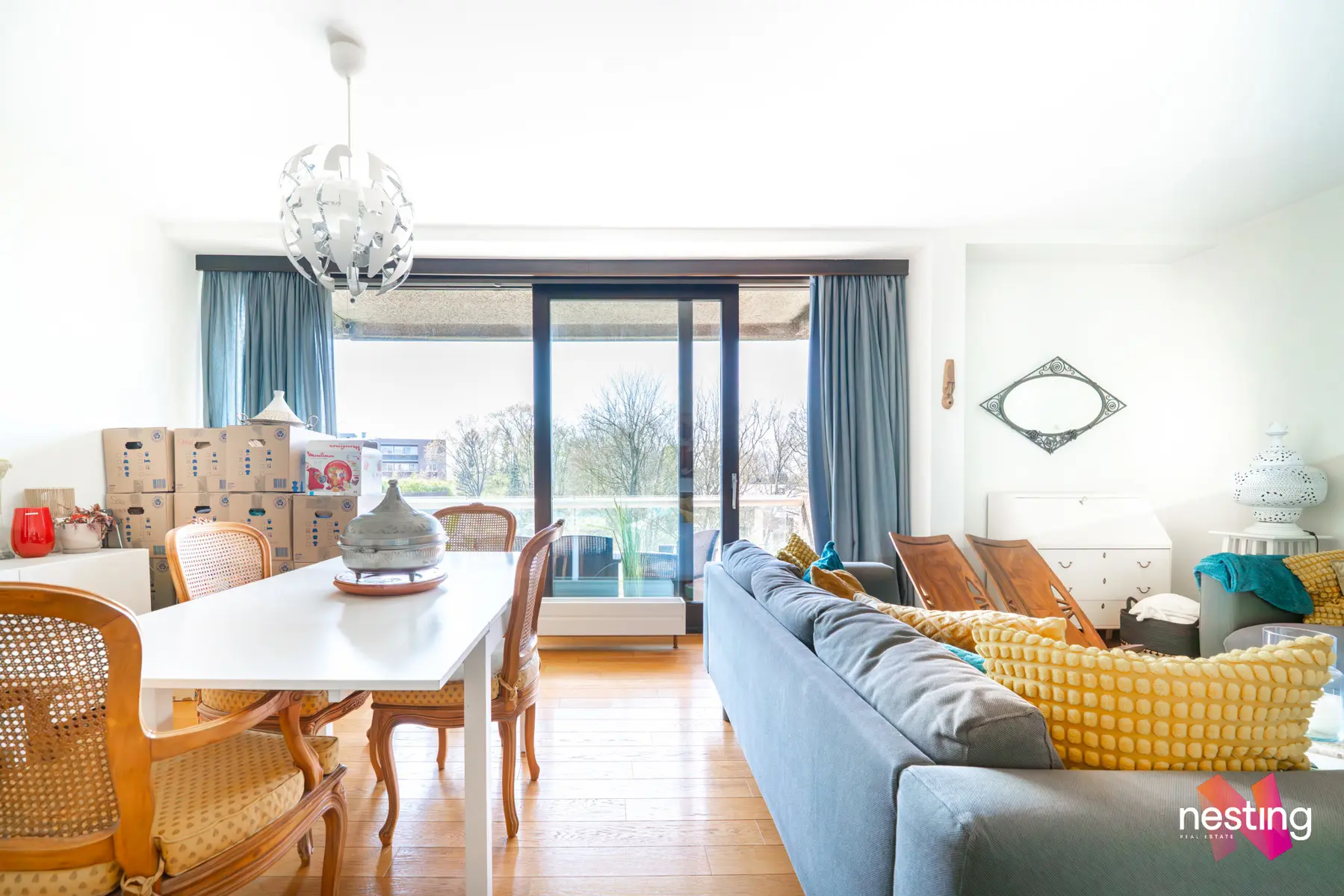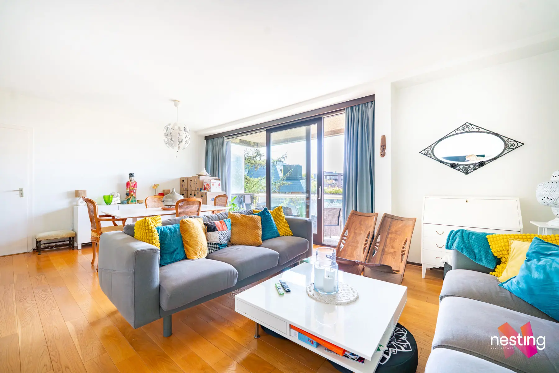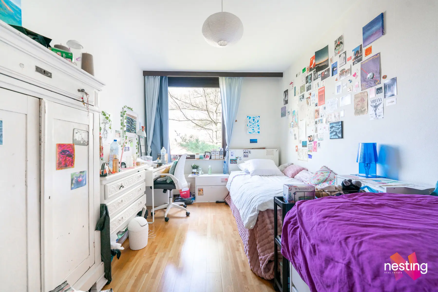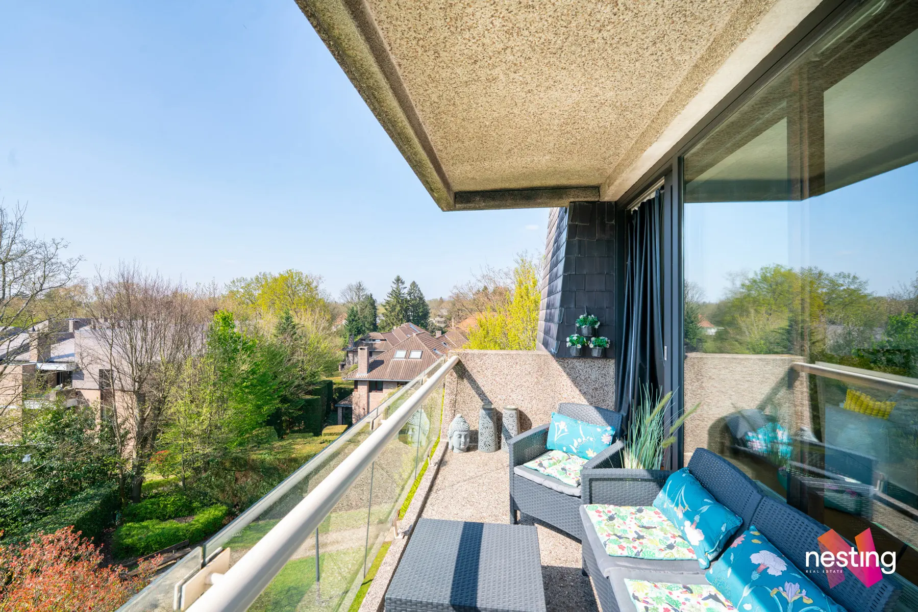 Un hall d'entrée avec vestiaire, une buanderie, un grand séjour de +- 30m2 donnant accès à une terrasse exposée ouest, une cuisine séparée super équipée, deux chambres de +- 13,5m2 et +- 16,5m2, une salle de bains et deux WC séparés.