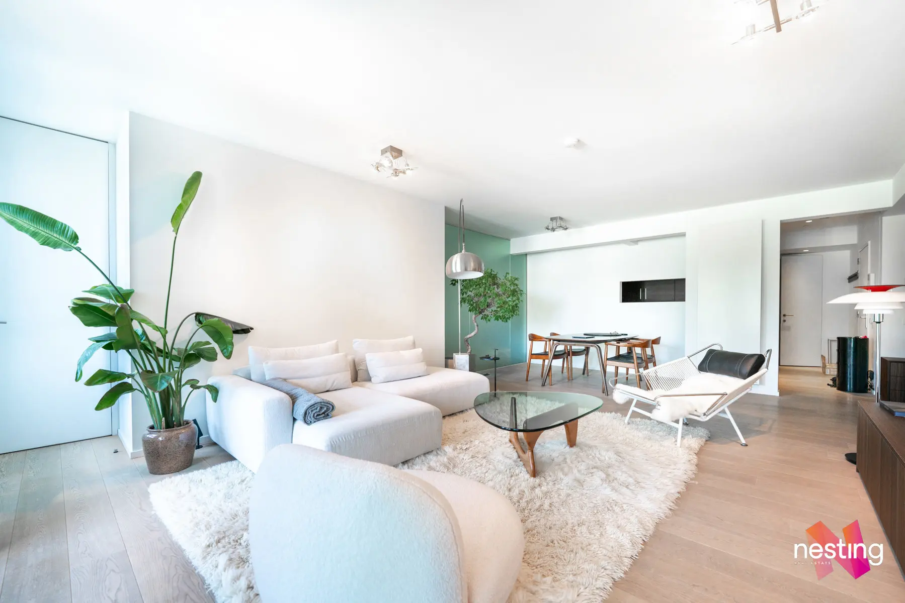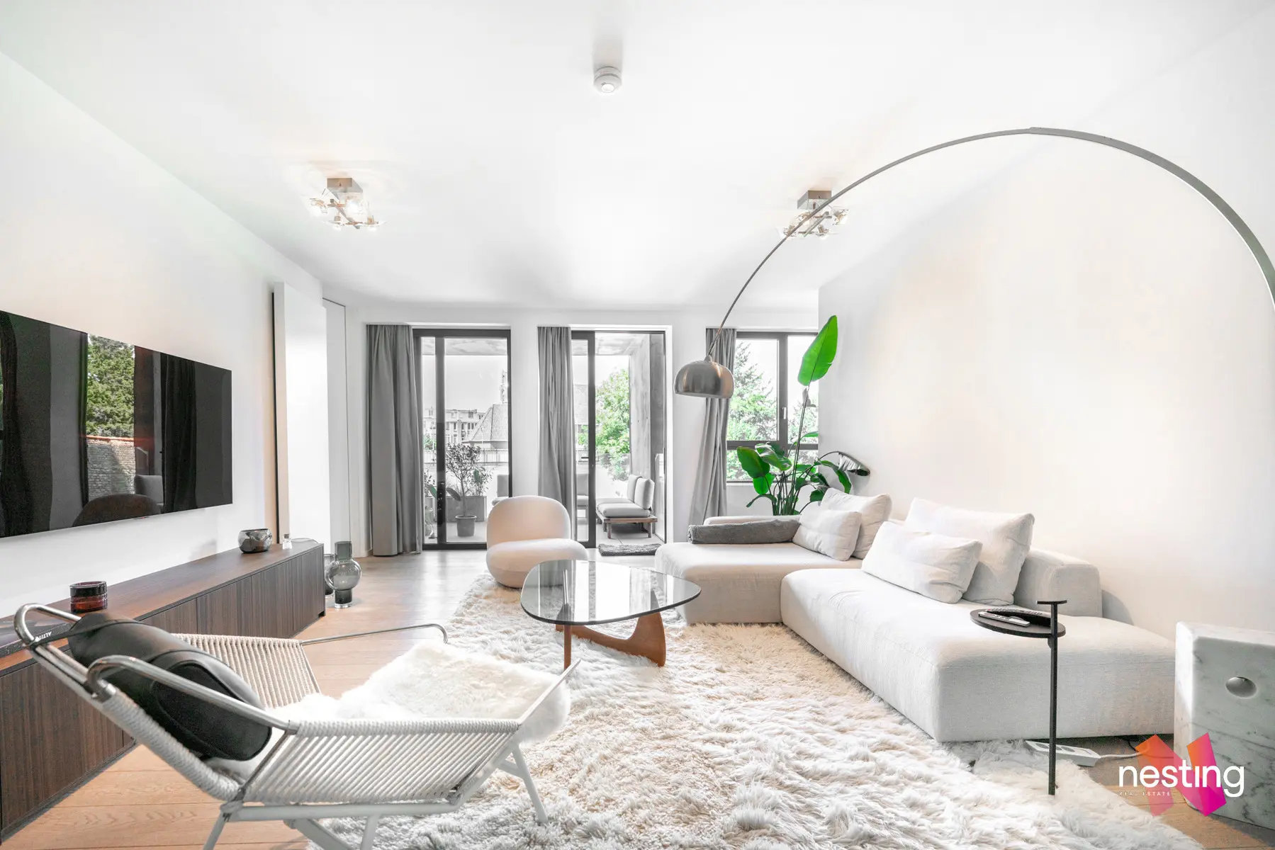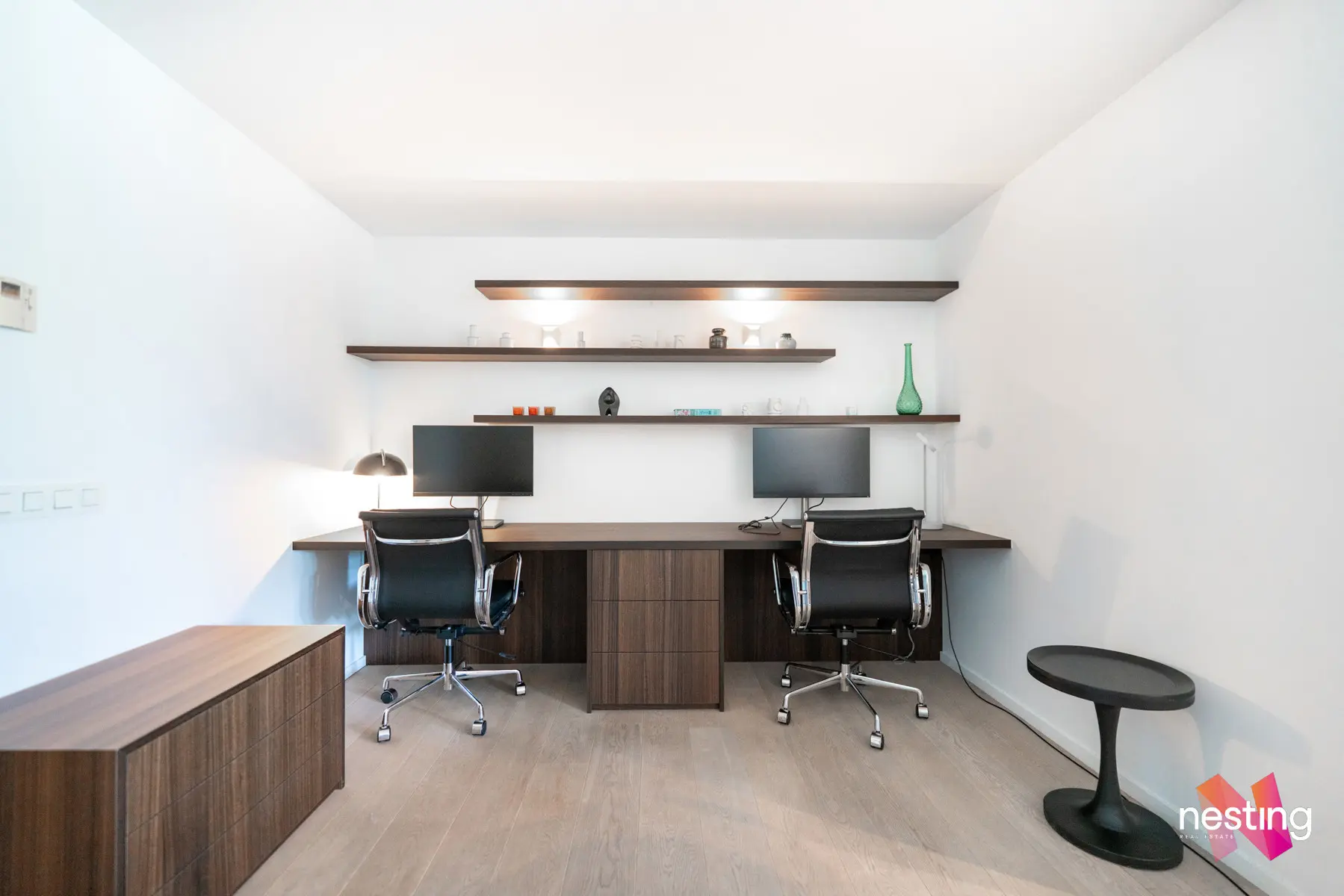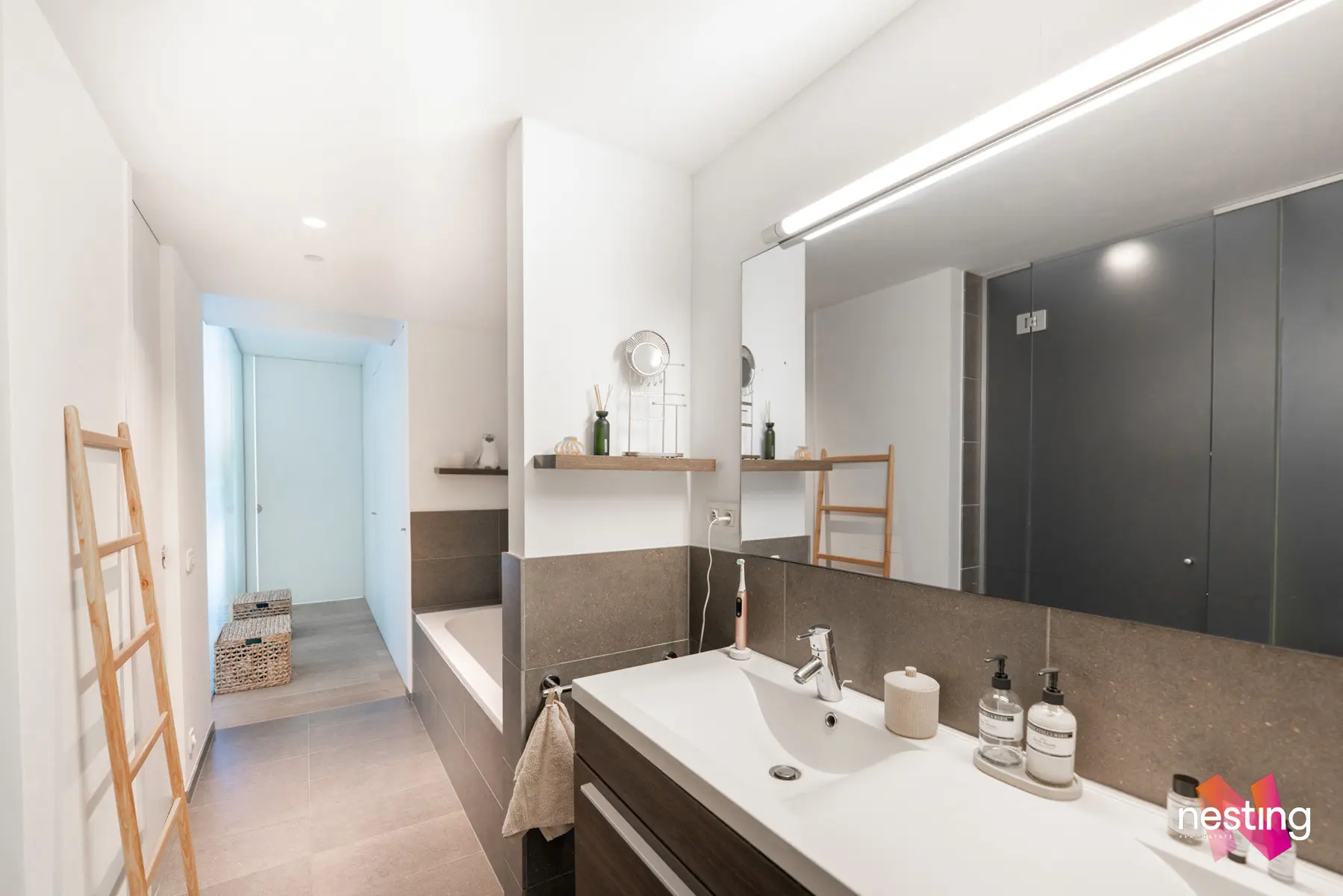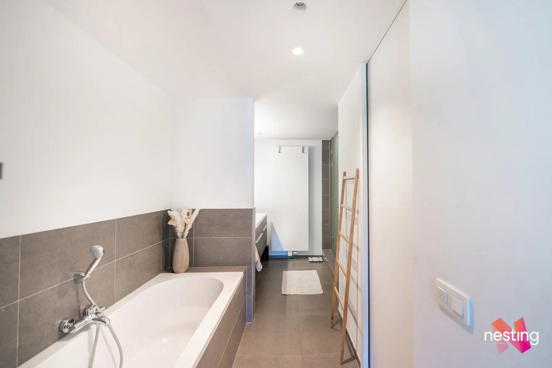 Il comprend : Un hall d'entrée, un espace buanderie, une cuisine super-équipée, un grand séjour de +- 45m2 donnant sur une terrasse de +- 20m2 exposée ouest, 2 chambres dont l'une avec une salle de douche et un espace dressing et l'autre avec une salle de bains et 2 WC séparés.