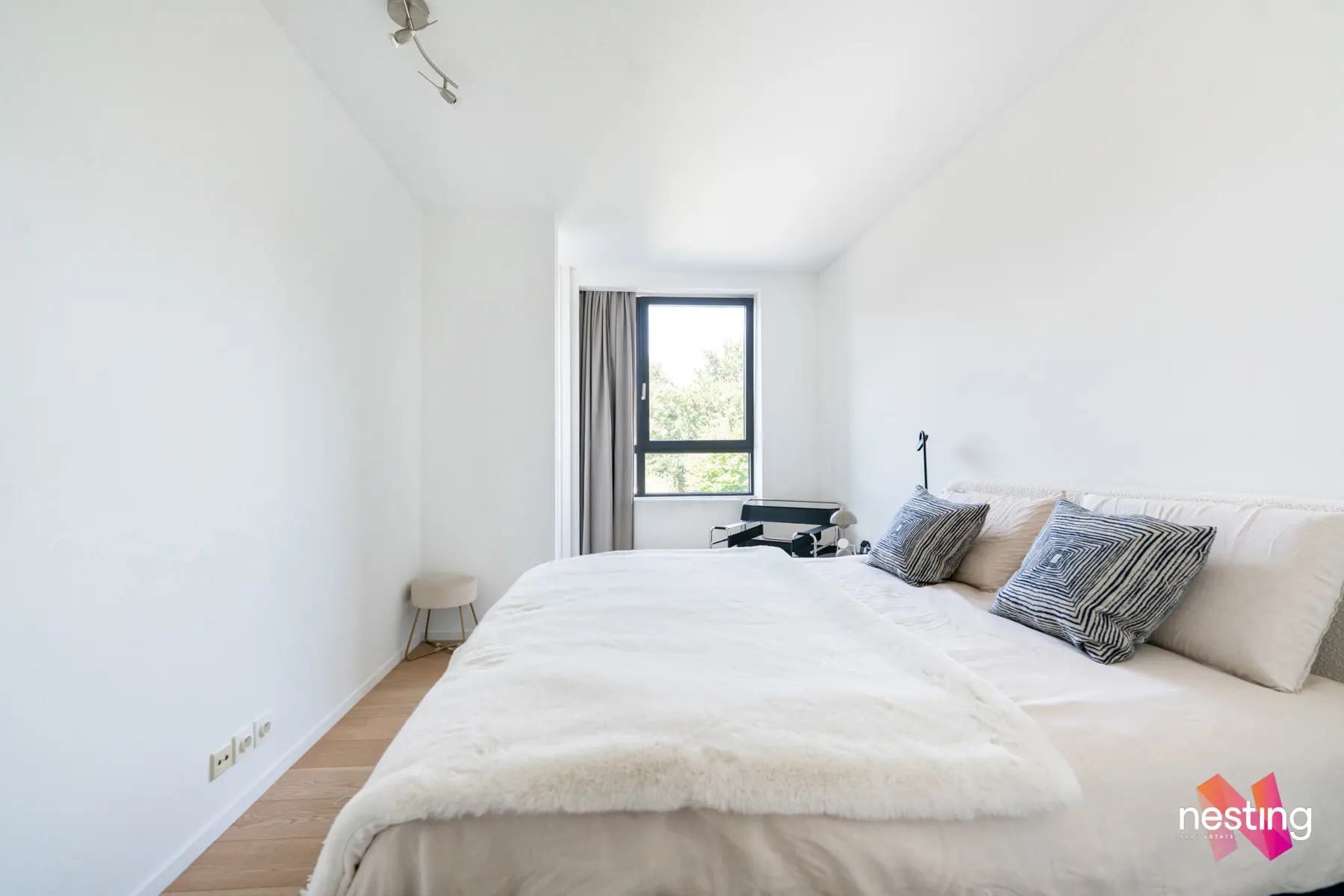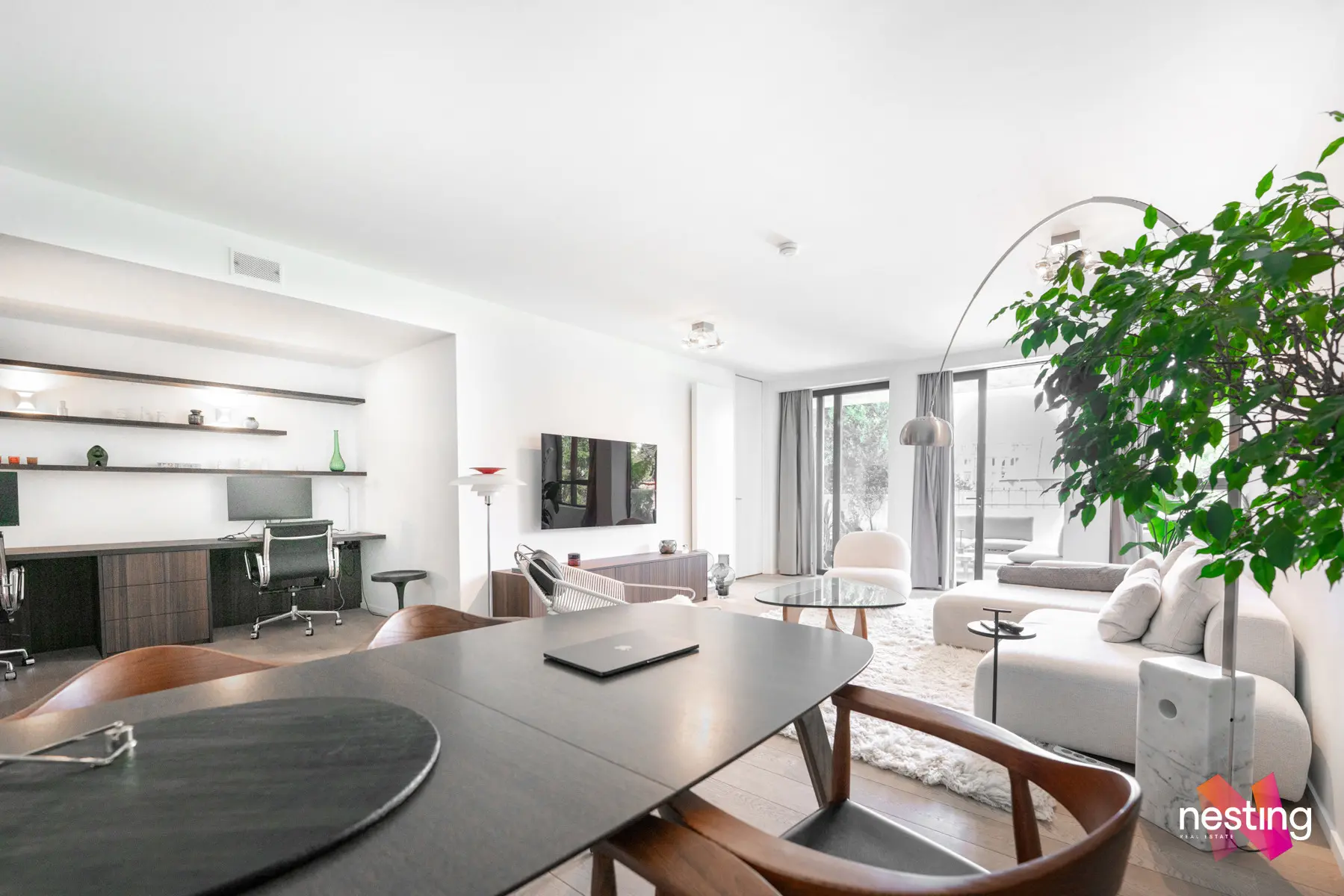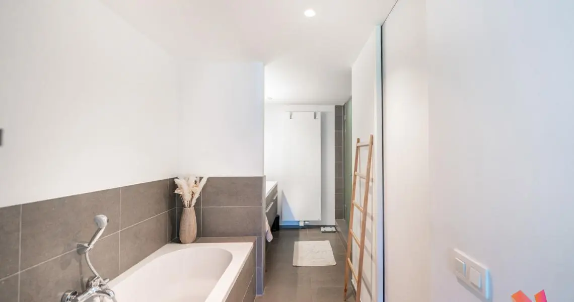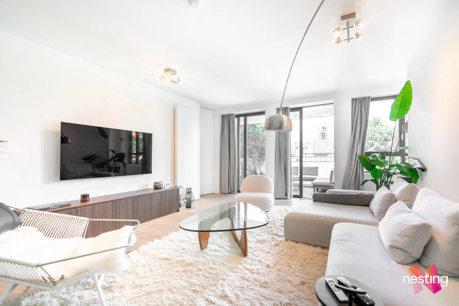 Il comprend : Un hall d'entrée, un espace buanderie, une cuisine super-équipée, un grand séjour de +- 45m2 donnant sur une terrasse de +- 20m2 exposée ouest, 2 chambres dont l'une avec une salle de douche et un espace dressing et l'autre avec une salle de bains et 2 WC séparés.