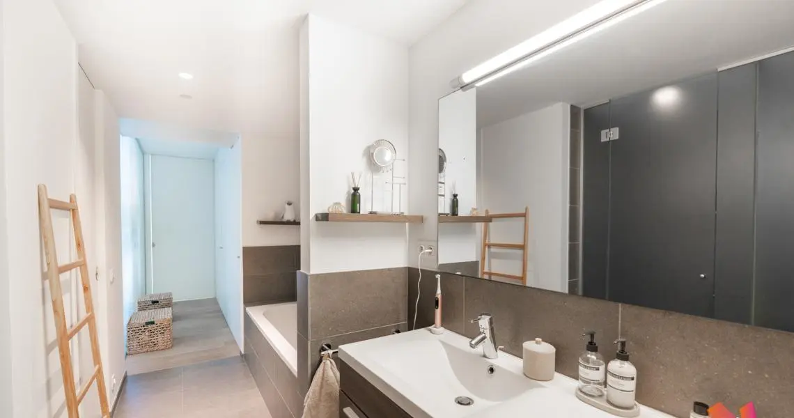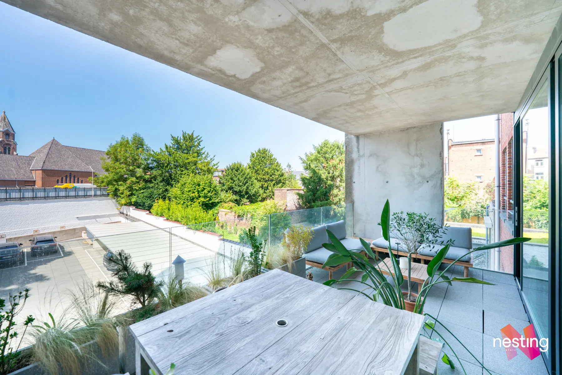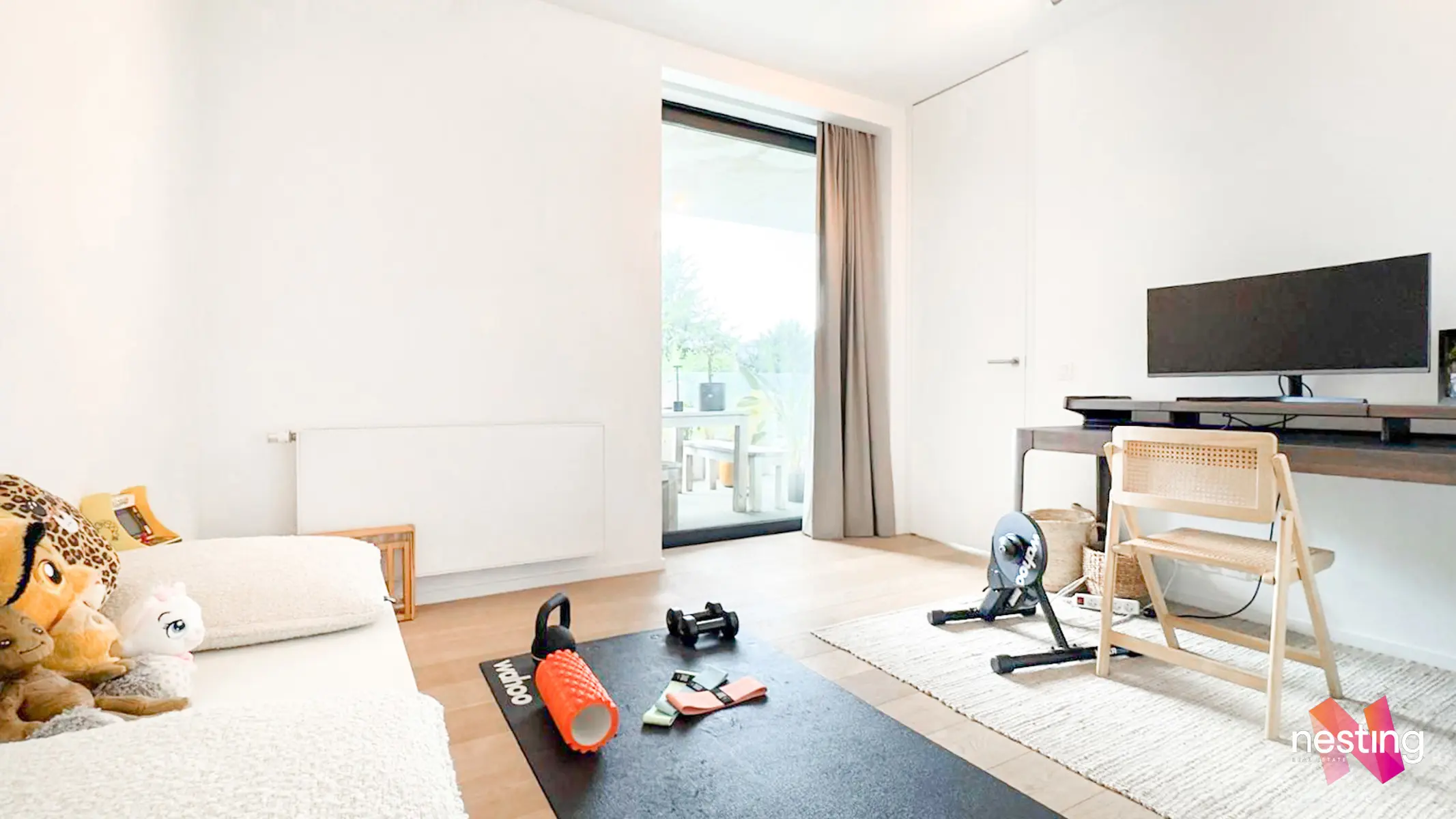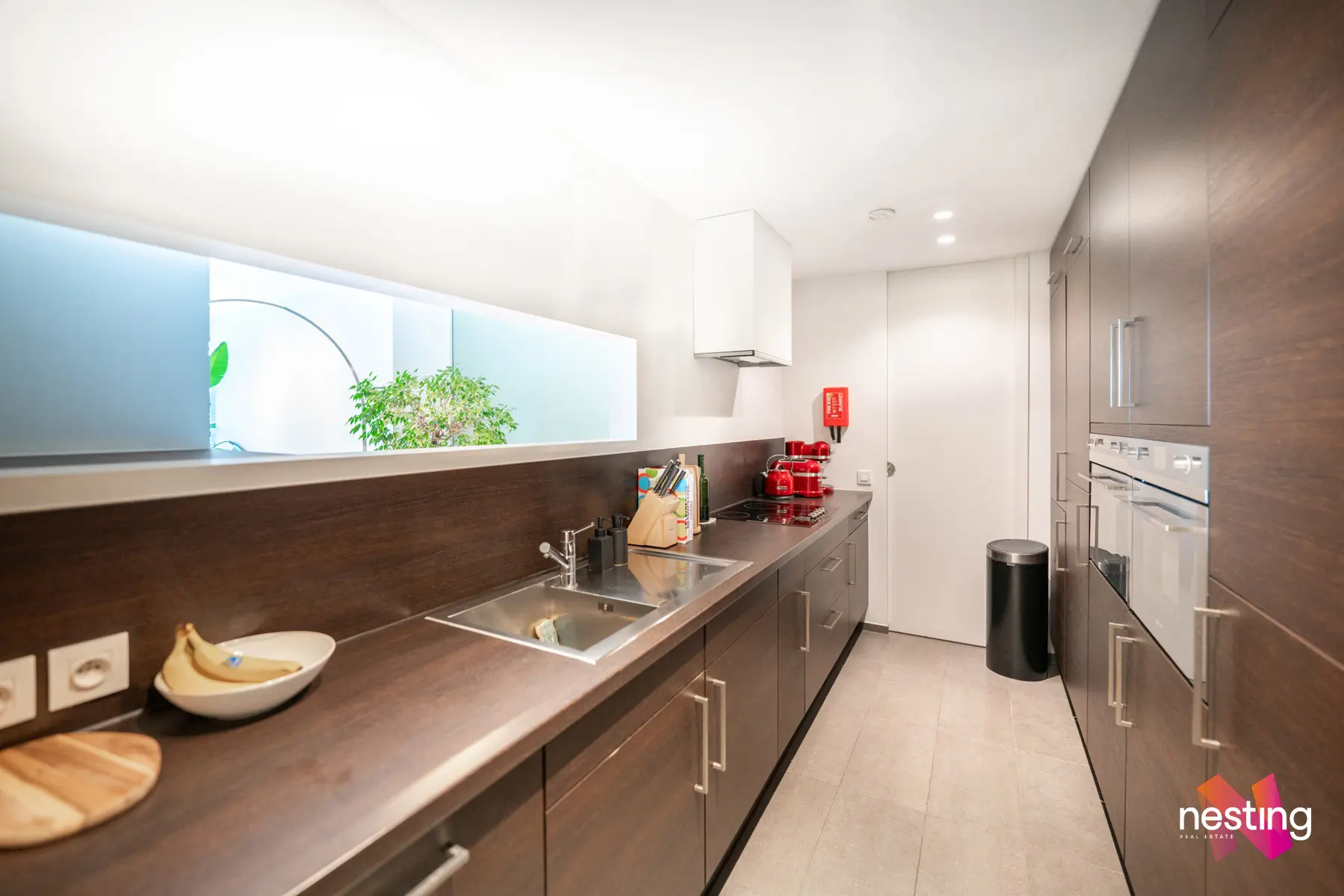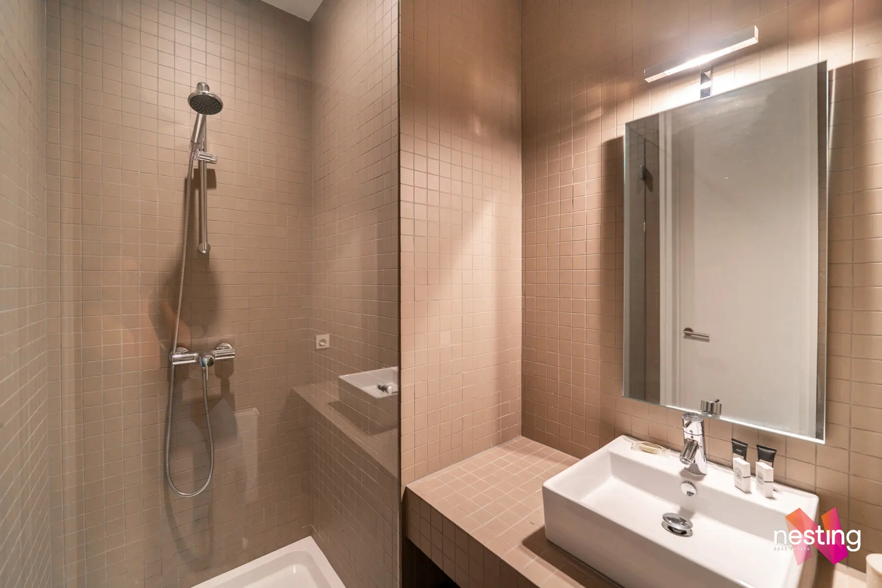 Il comprend : Un hall d'entrée, un espace buanderie, une cuisine super-équipée, un grand séjour de +- 45m2 donnant sur une terrasse de +- 20m2 exposée ouest, 2 chambres dont l'une avec une salle de douche et un espace dressing et l'autre avec une salle de bains et 2 WC séparés.