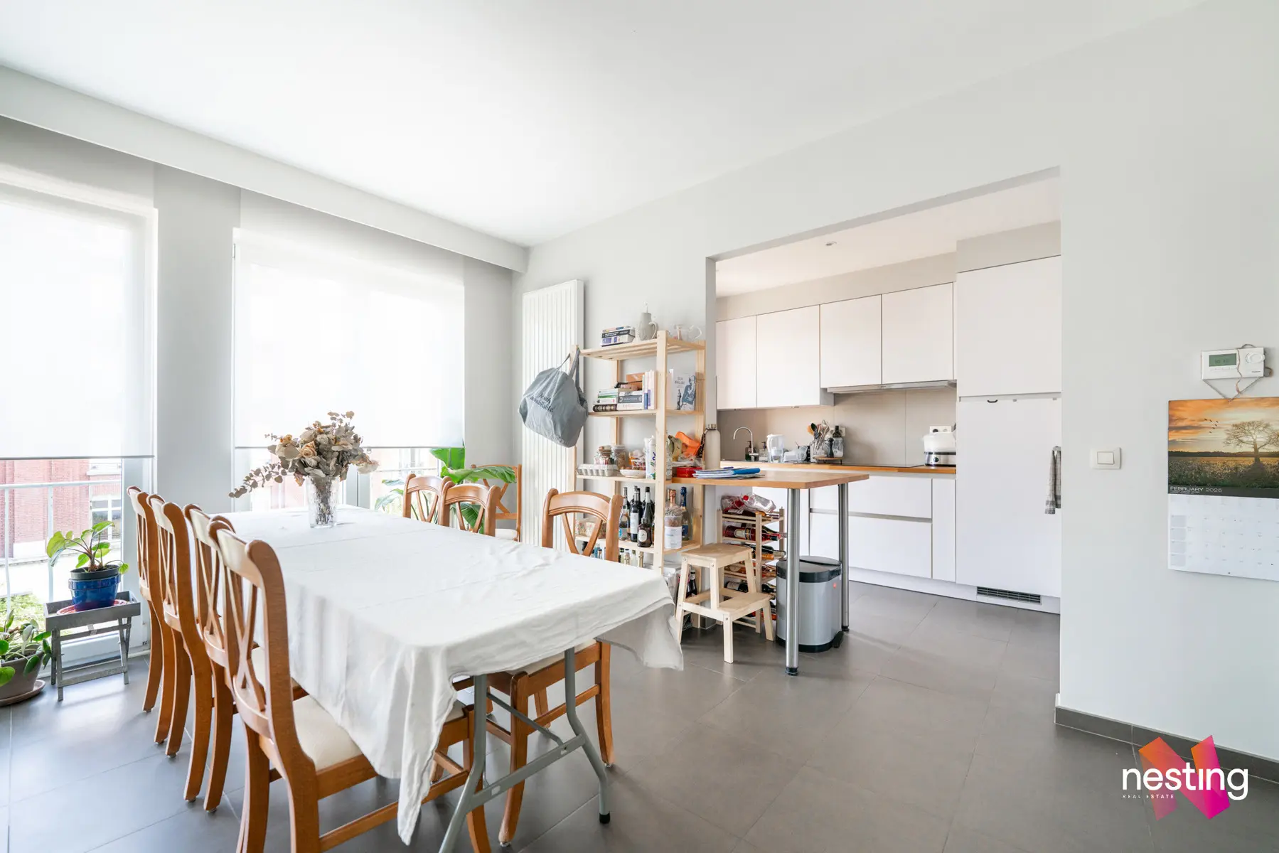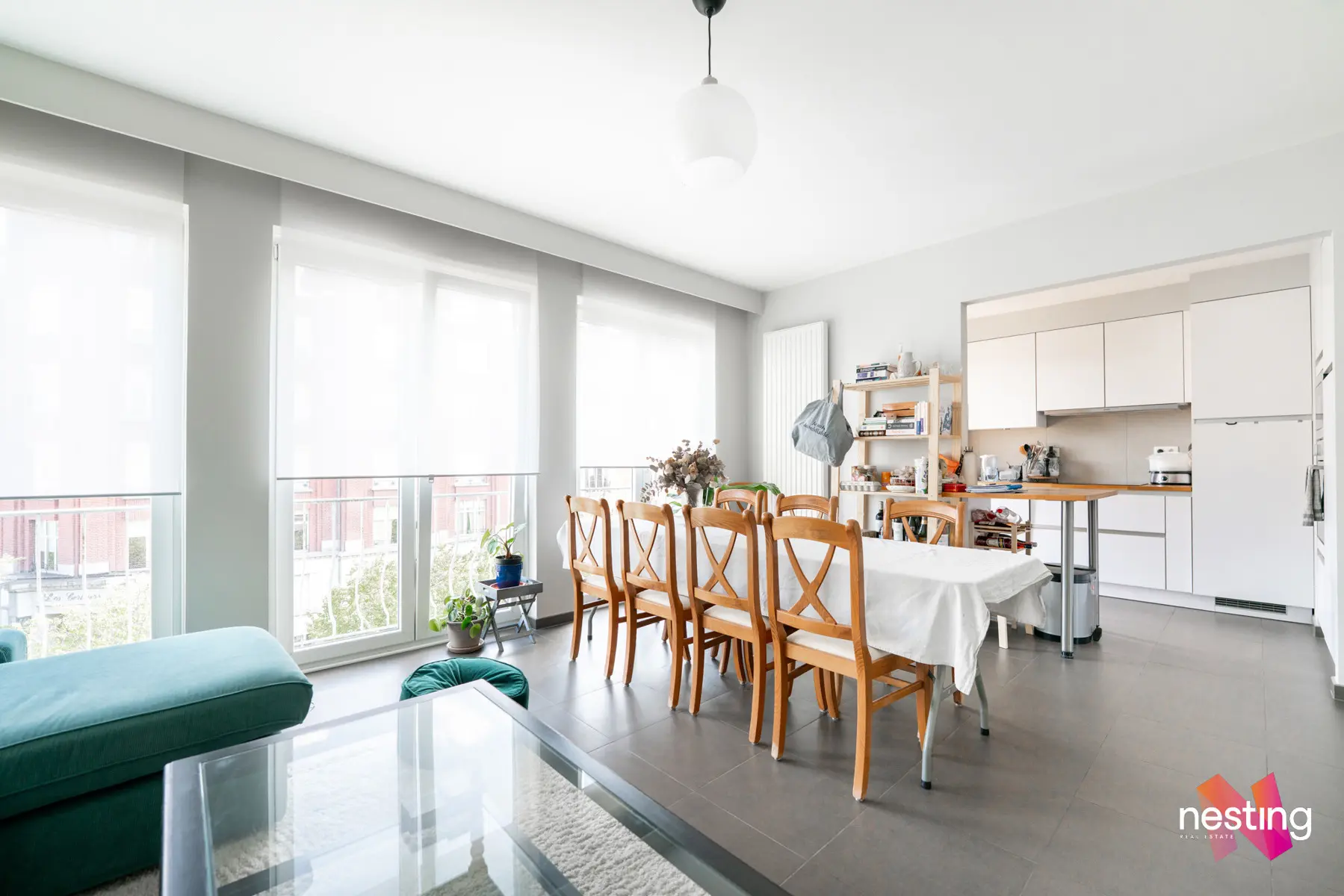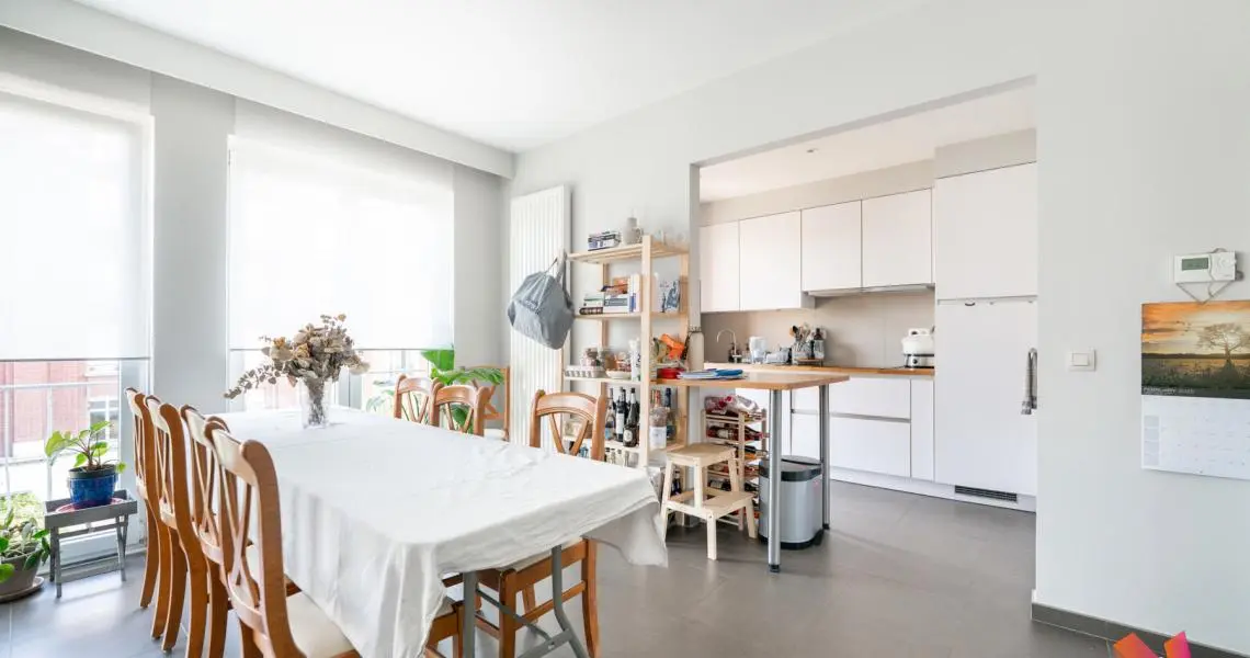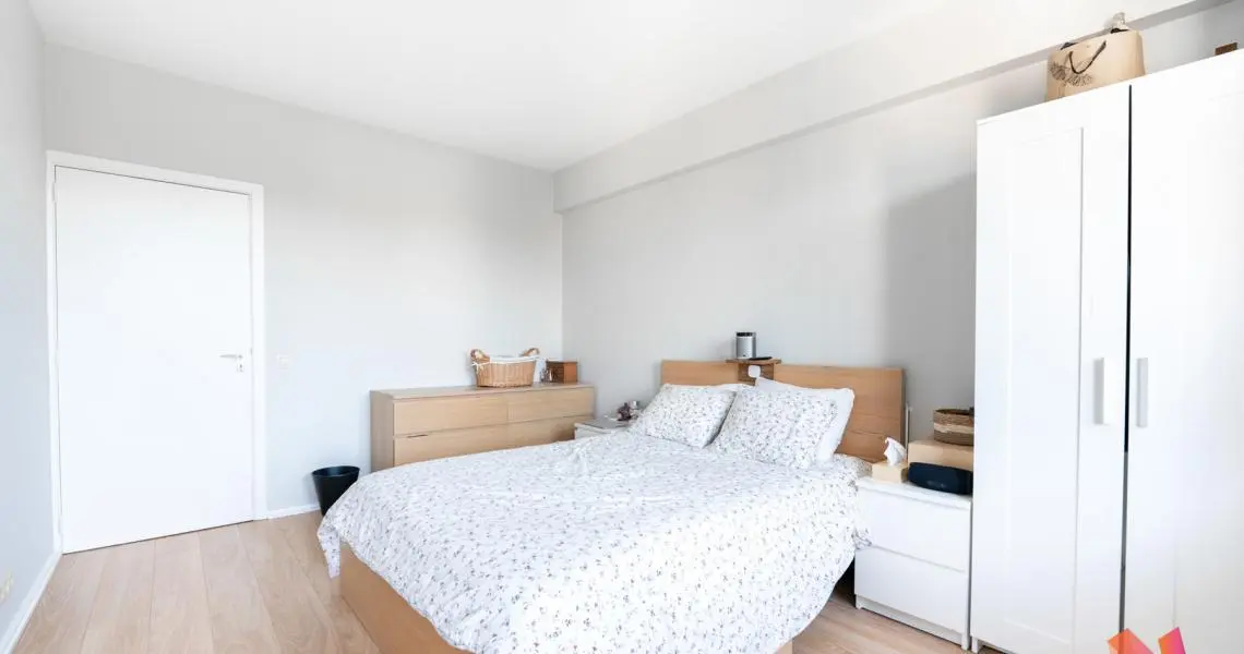 Un hall d'entrée, un séjour de +- 23 m2, une cuisine ouverte super-équipée donnant sur un premier balcon, 2 chambres de +- 14m2 et 13m2 dont une avec un accès au second balcon, une salle de bain et un wc séparé.