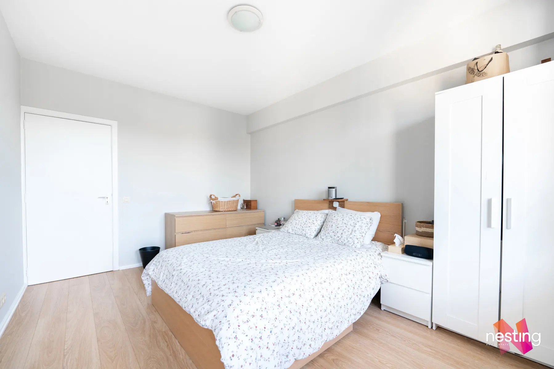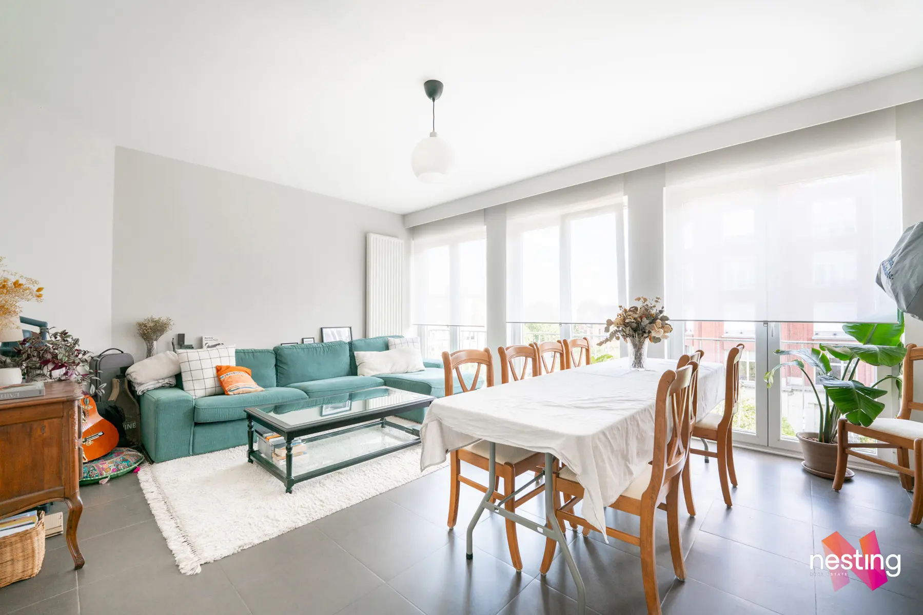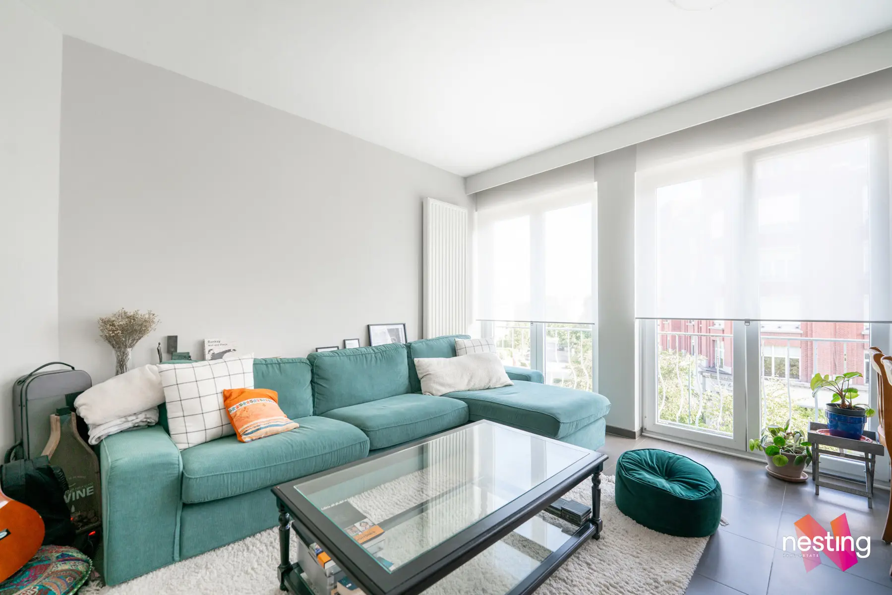 Un hall d'entrée, un séjour de +- 23 m2, une cuisine ouverte super-équipée donnant sur un premier balcon, 2 chambres de +- 14m2 et 13m2 dont une avec un accès au second balcon, une salle de bain et un wc séparé.