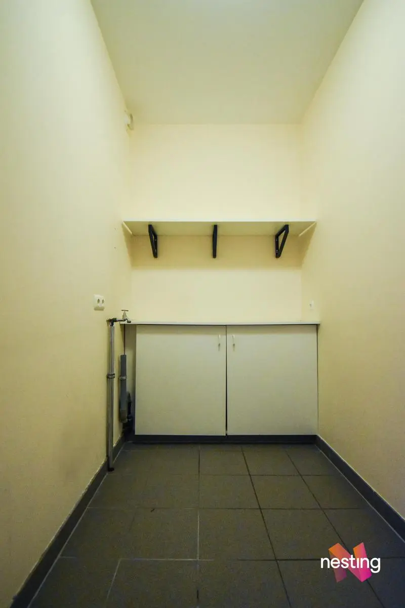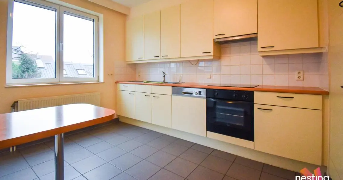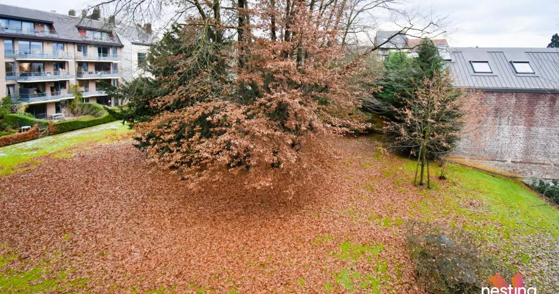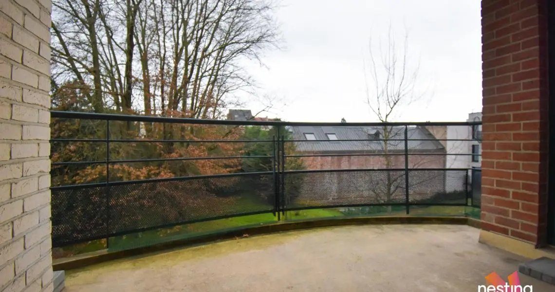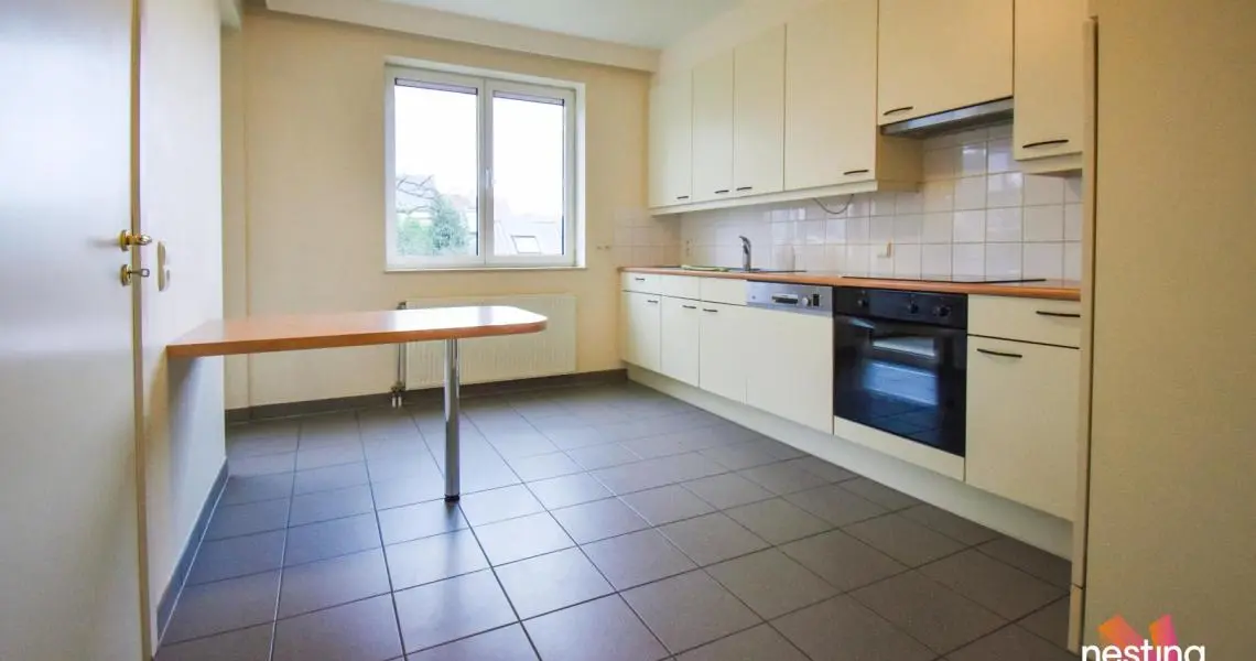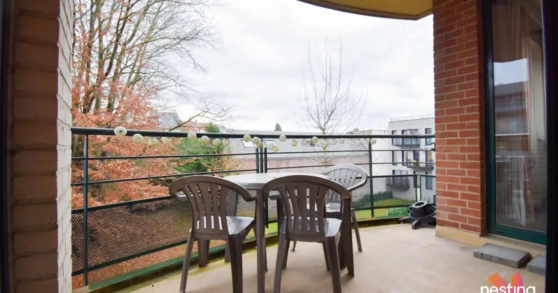 Hall d'entrée avec toilette, vaste séjour de +-50m² avec accès à une terrasse offrant une vue dégagée sur un jardin, cuisine super équipée avec coin déjeuner, buanderie avec sèche linge, hall de nuit, 1 salle de douche, 2 grandes chambres (+/-17 et +/-20m²) dont 1 avec sa salle de bains et toilette.