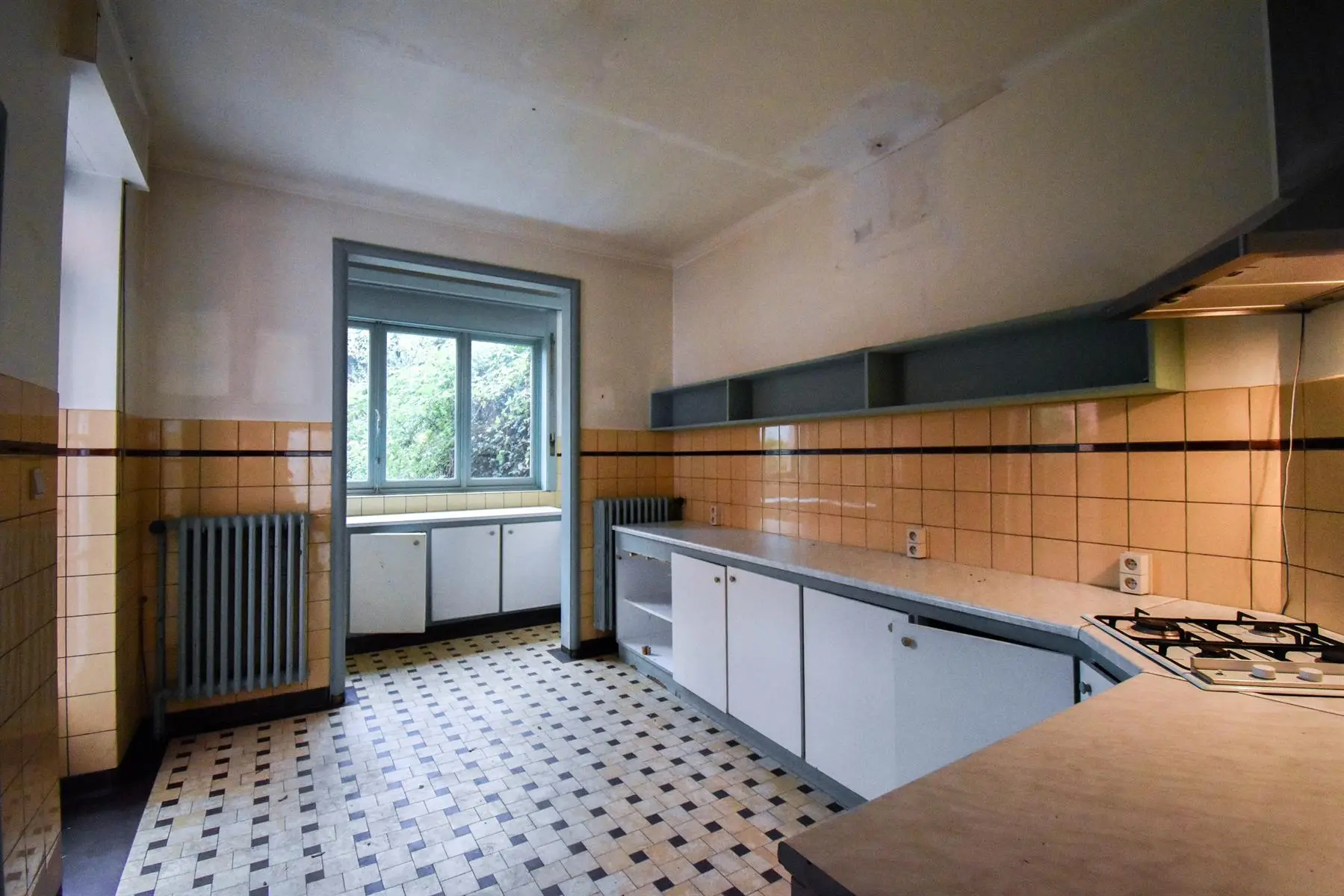 Altitude 100 - Avenue Maréchal Joffre 124, dans un quartier calme et très recherché, à proximité des transports en communs et dans commerces, superbe maison bel-étage des années 40 de +/-200m2, à rénover, très lumineuse, parquet partout et offrant : au rez : hall d'entrée avec vestiaire et wc, grande cuisine, salle à manger, salon donnant sur la terrasse de +/-8m2 et le jardin de +/-110m2. Au 1er : 2 grandes chambres, un bureau et une salle de bains. Au 3ème, 2 grandes chambres et une salle de bains. Au sous-sol : vaste garage, nombreuses caves, buanderie. Très beau potentiel après travaux (plans projeté disponible sur demande). Chaudière au mazout. PEB : F. A visiter sans tarder !