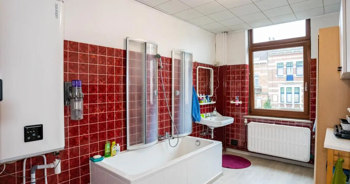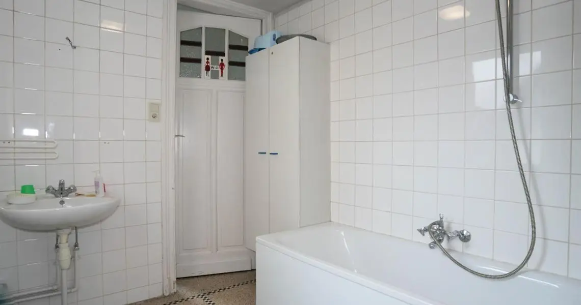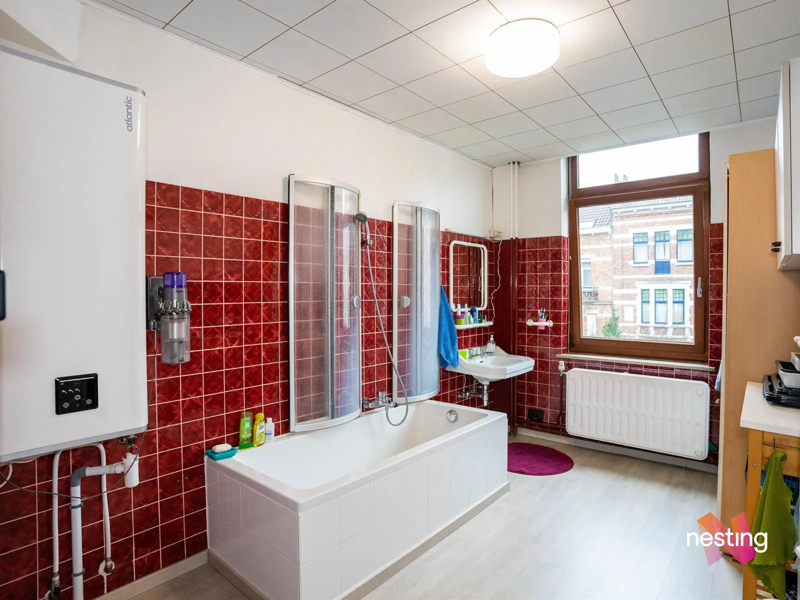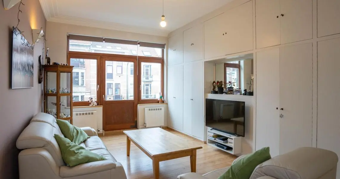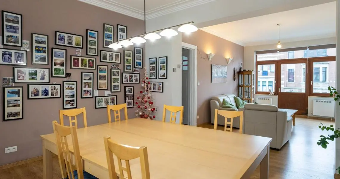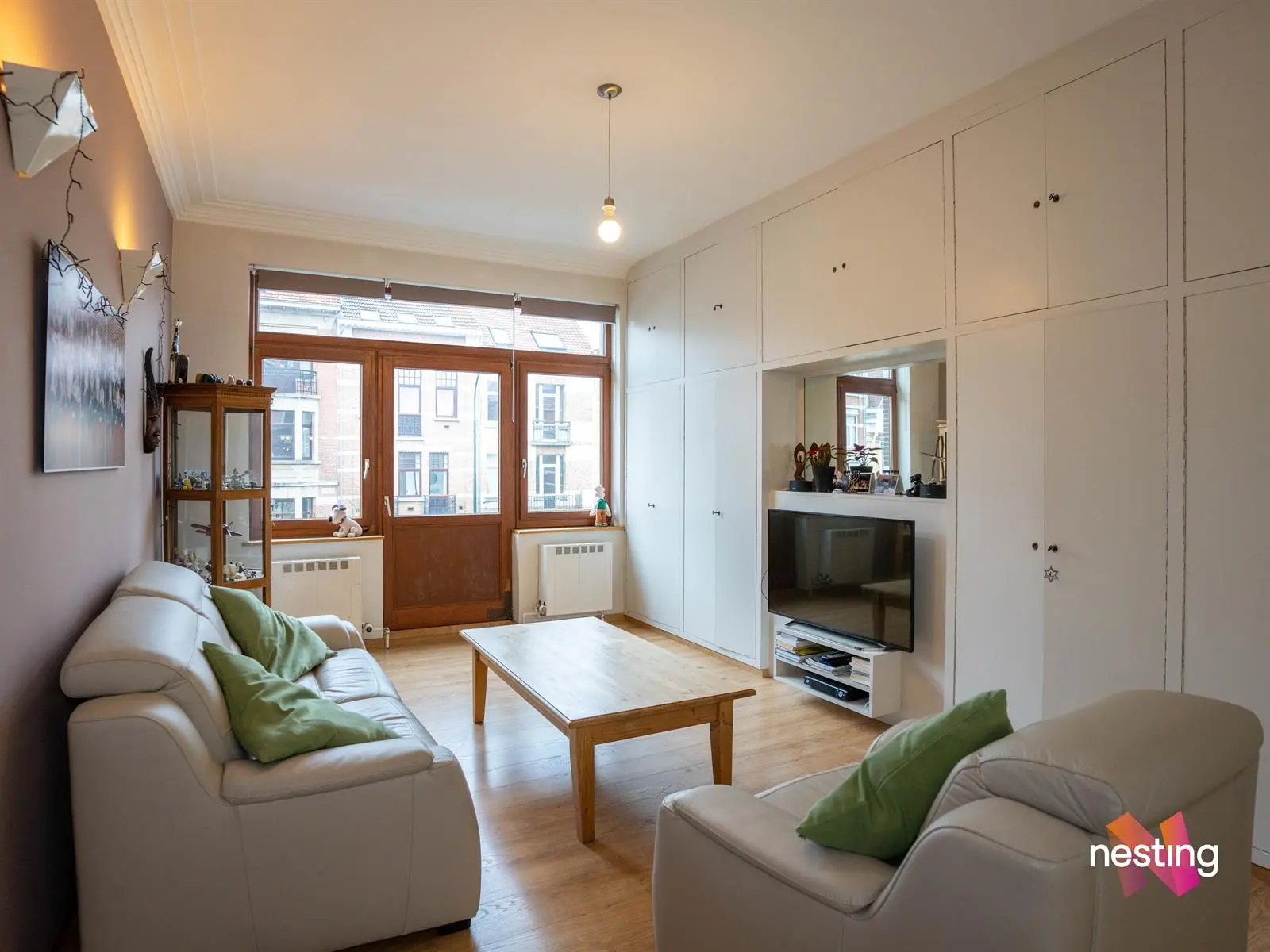 au 1er étage : une salle de bains, une grande pièce à vivre de +- 40m2 lumineux avec balcon, un wc séparé et une cuisine super équipée (+- 10 ans).