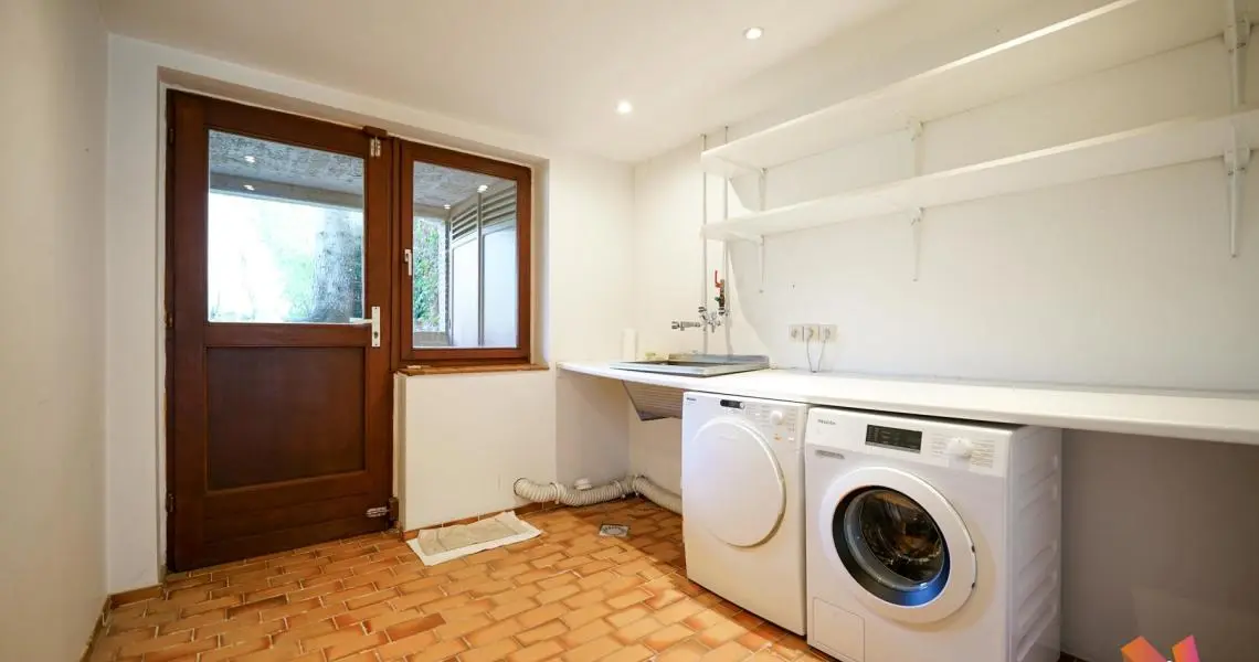 Hall d'entrée avec placards, WC, buanderie donnant sur une terrasse et le jardin, cave/bureau et garage (+ emplacement extérieur).