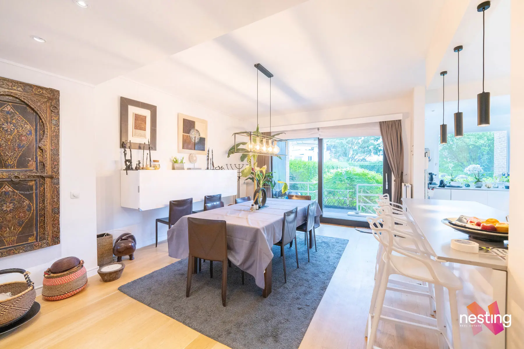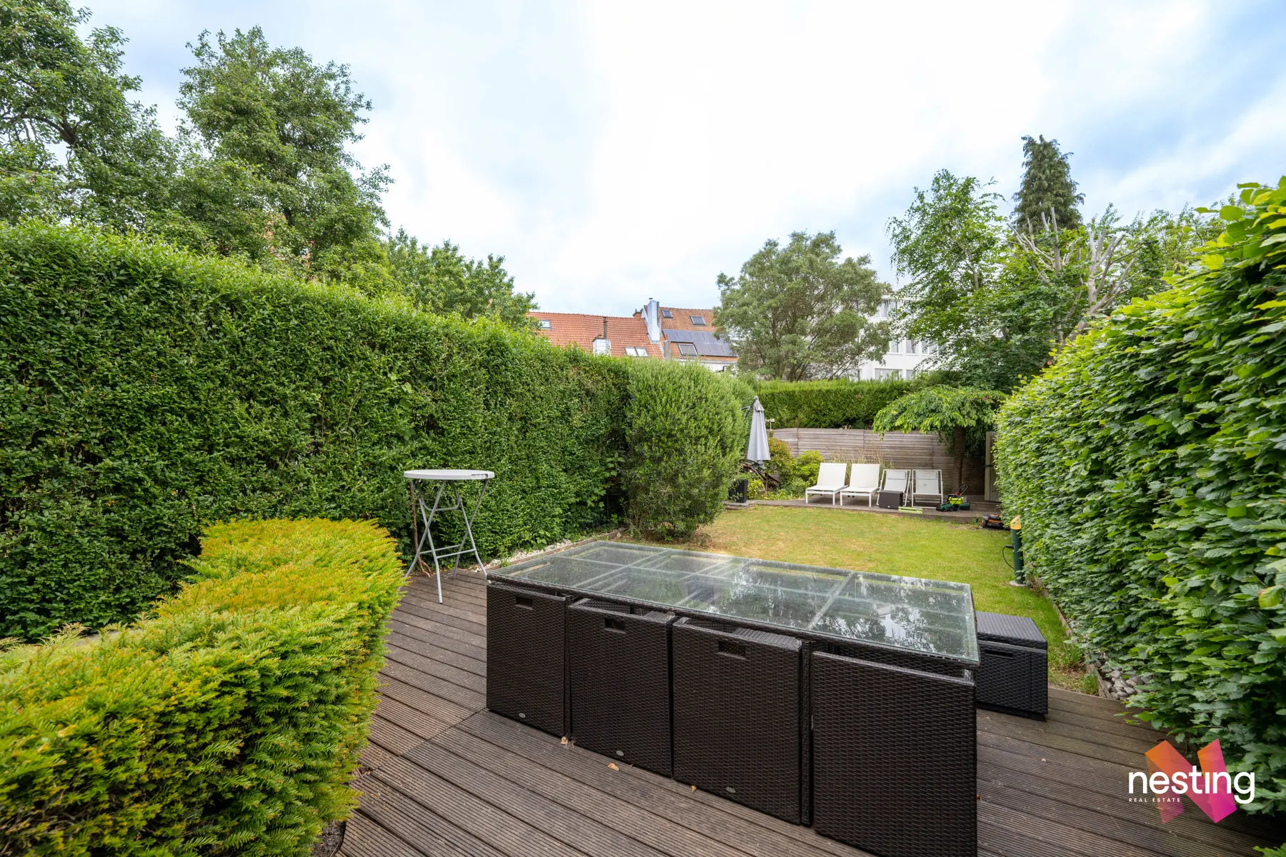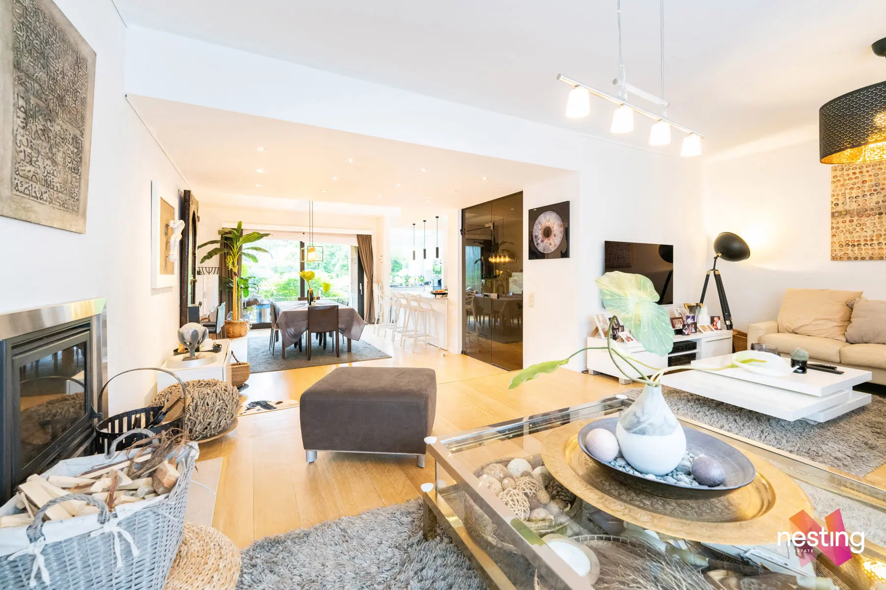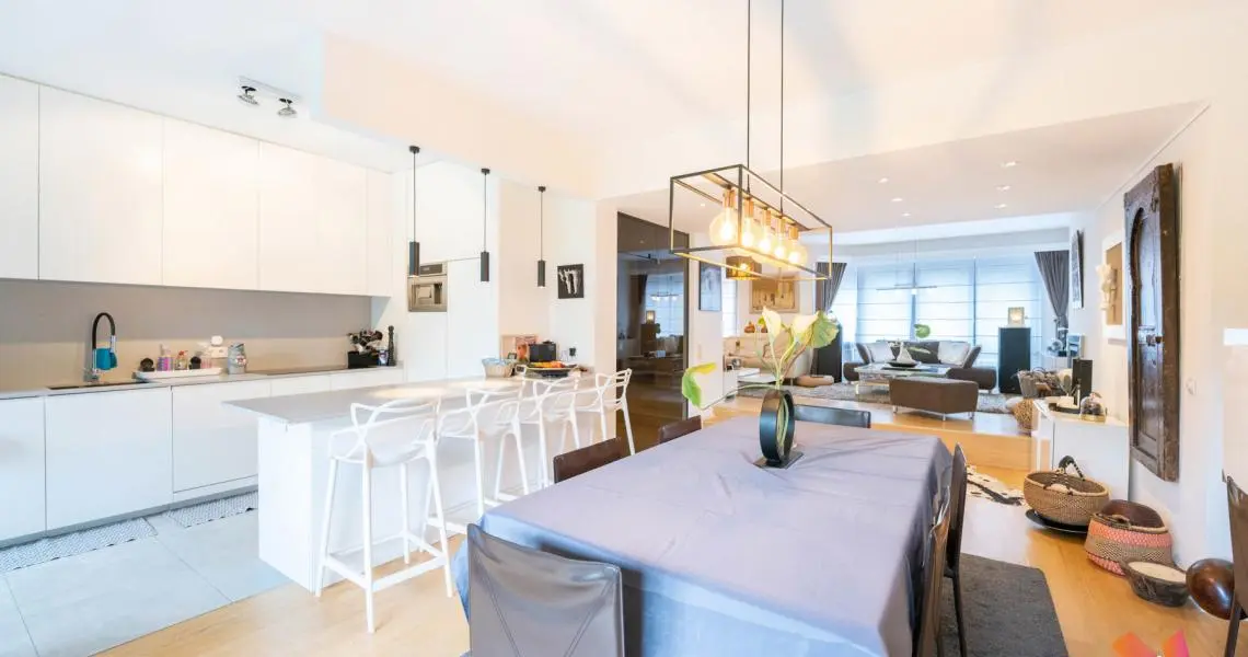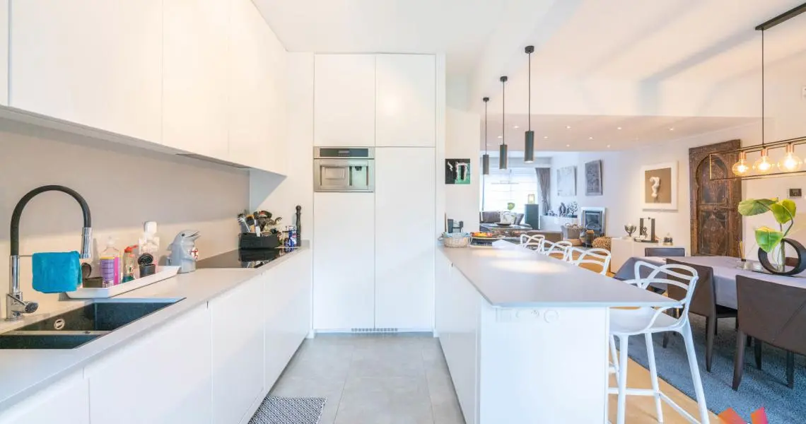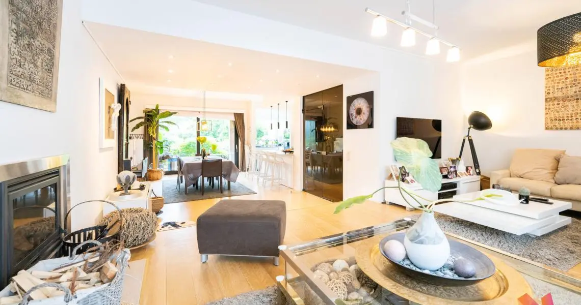 Au 1er étage : un salon avec feu ouvert, salle à manger, une cuisine US super équipée, accès à une la terrasse et au jardin de +- 125m2