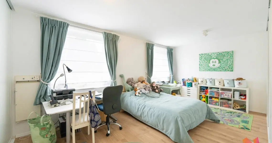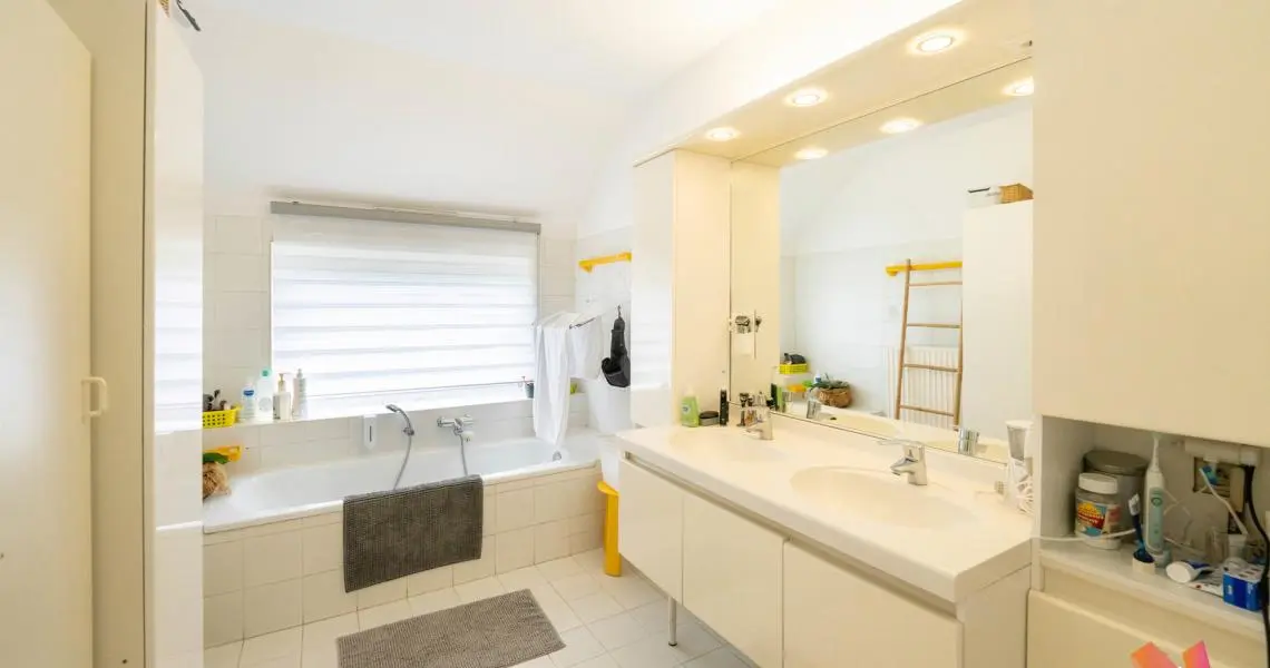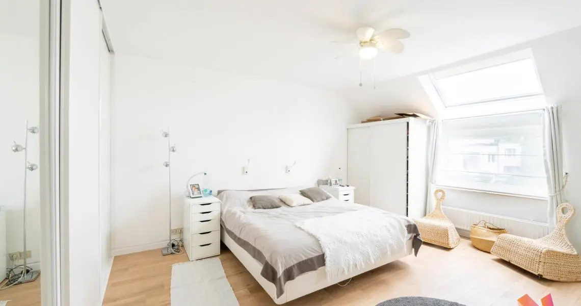 Au deuxième étage : hall, wc séparé, une salle de douche, 1 chambre avec placards de 25,5m2 (initialement divisée en 2 chambres) + masterbedroom de +) 23m2 avec ses placards et sa salle de bains (8,5m2)