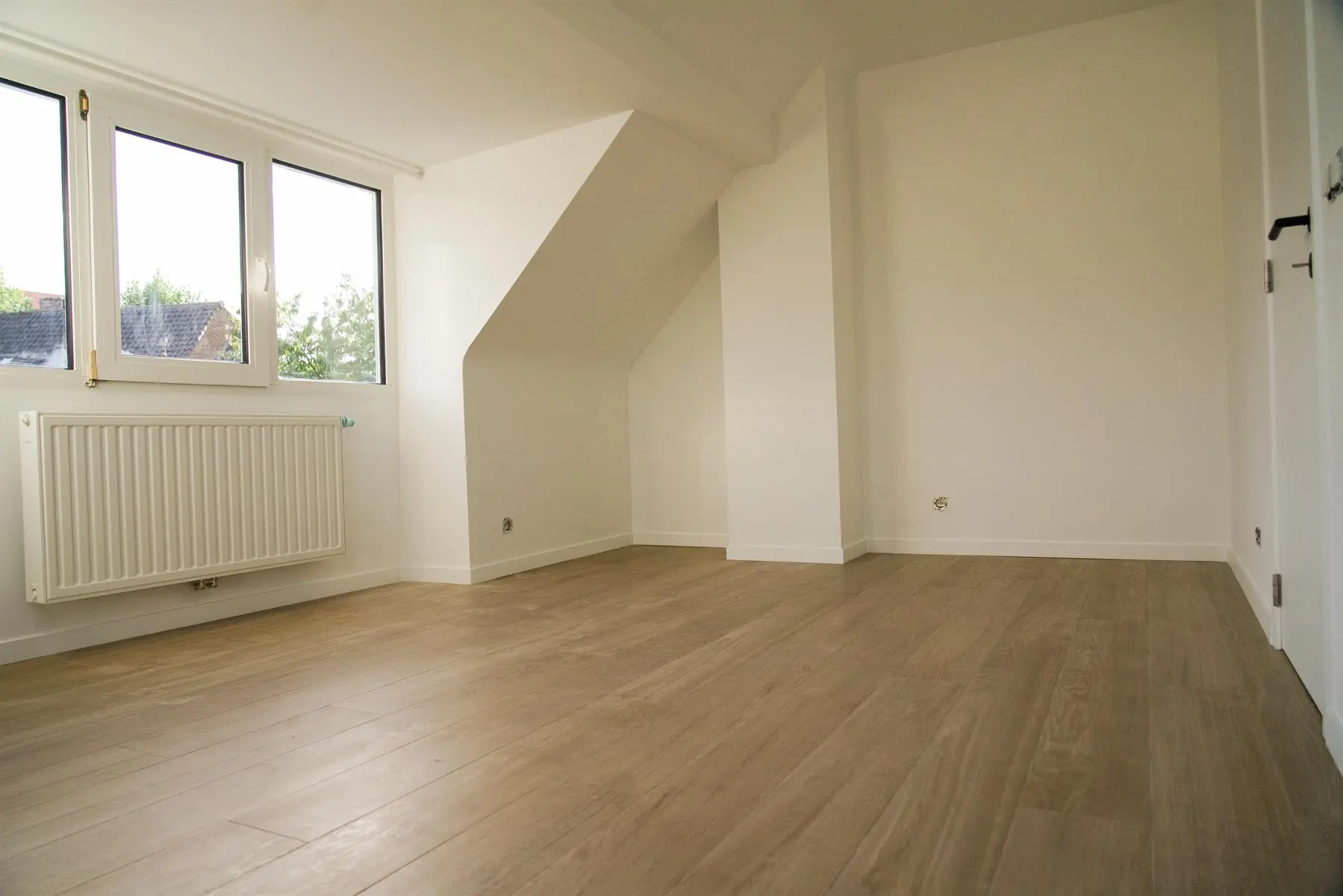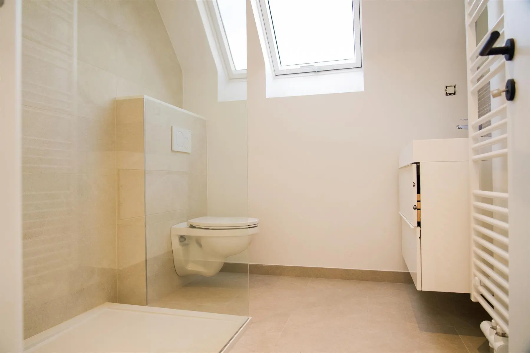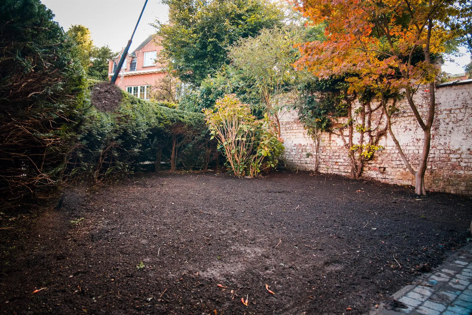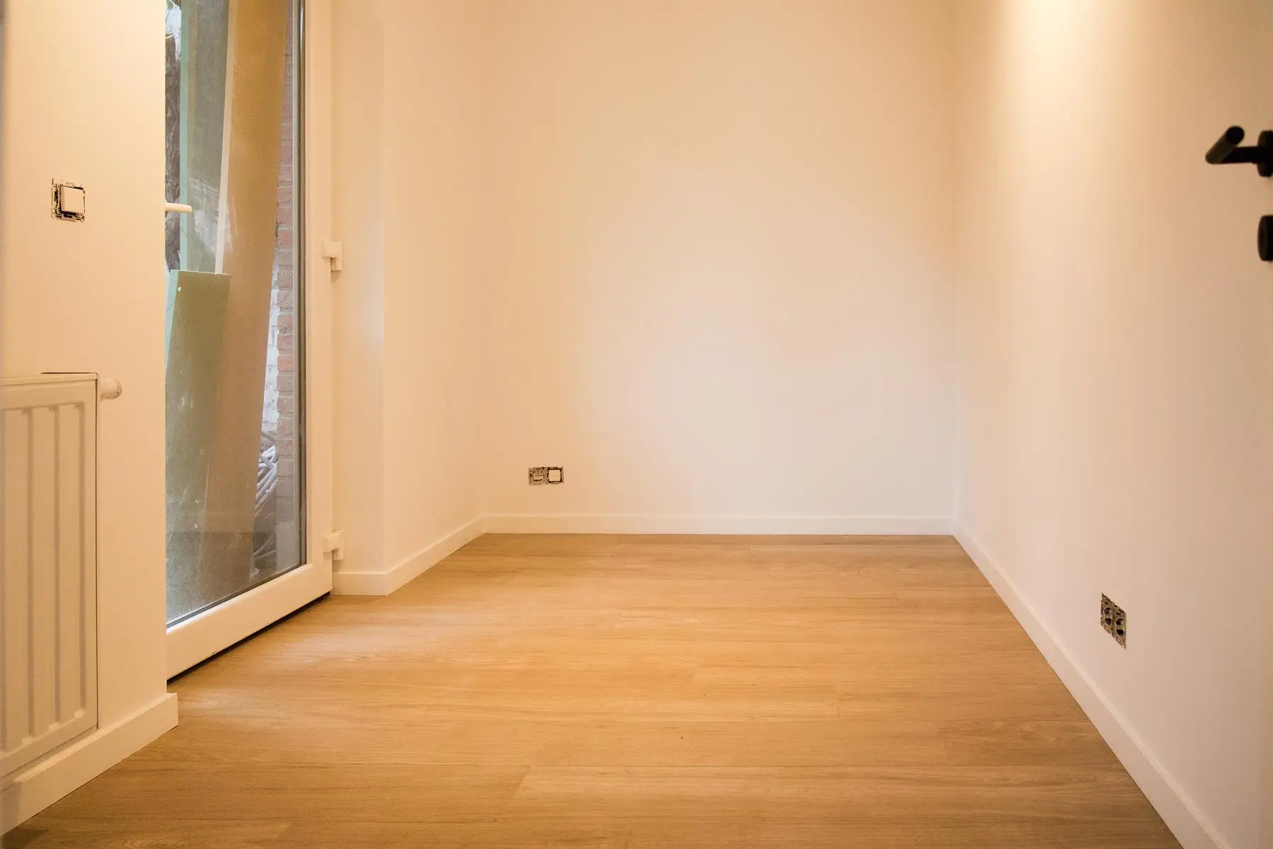 Au rez-de-chaussée : hall d'entrée avec vestiaire et WC séparé, bureau/petite chambre de +/-7m2, garage pour une voiture, buanderie. Jardin de +/-50m2 orienté au sud.