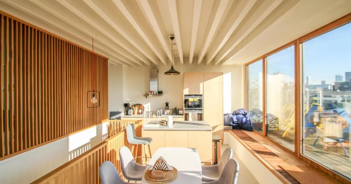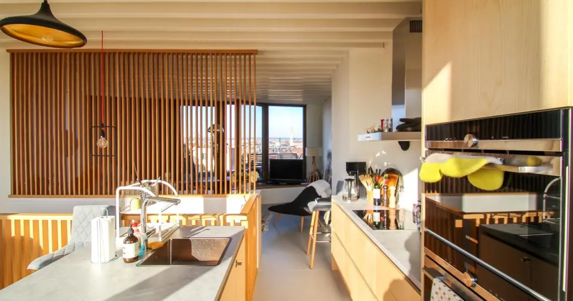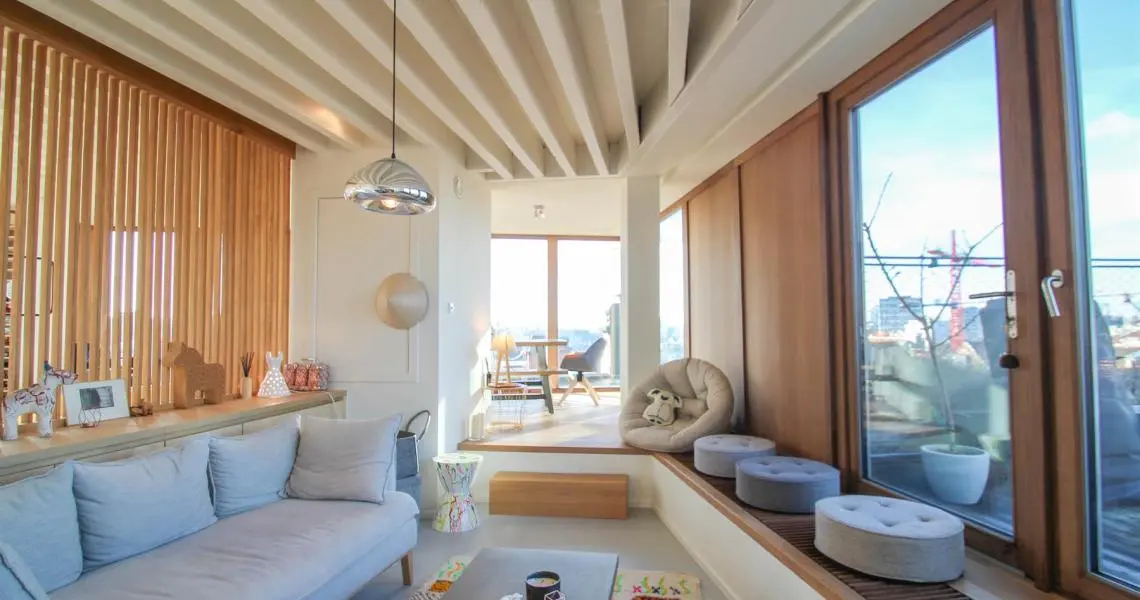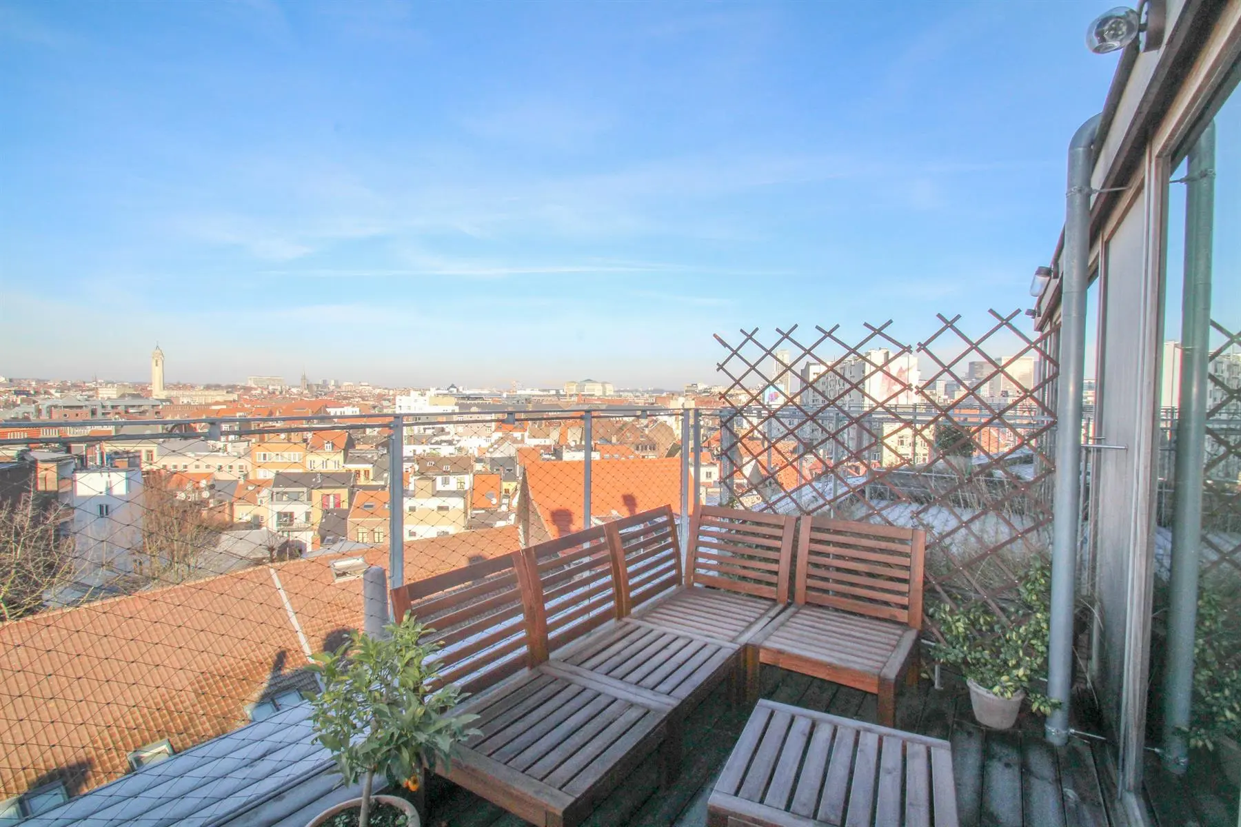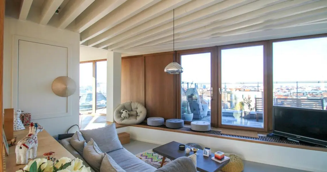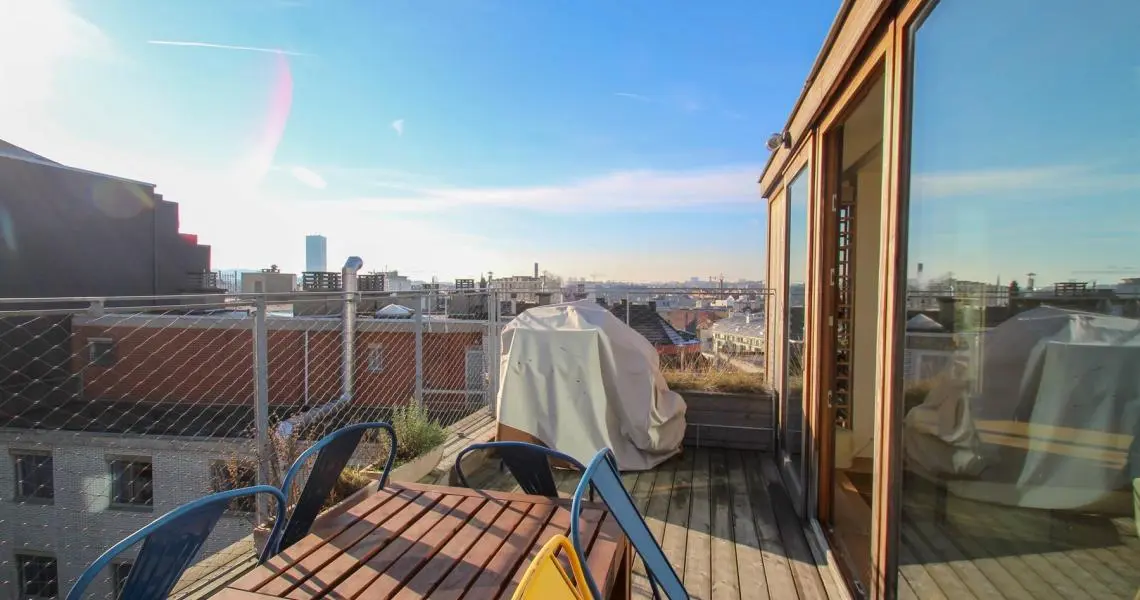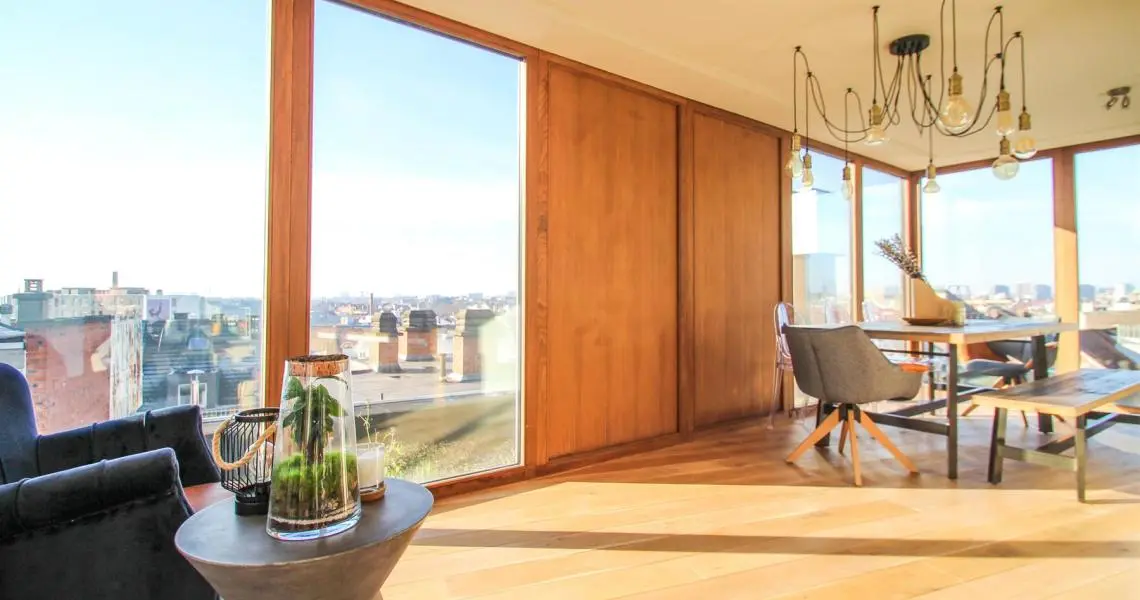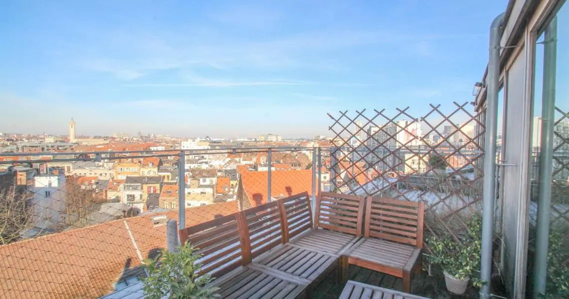 Situé à proximité de la Place Sainte-Catherine, de la rue Antoine Dansaert, des commerces et des transports en communs, dans un immeuble récent, superbe Penthouse/duplex de 132m2, très lumineux, calme, parquet partout et offrant : Au 6ème étage : hall d'entrée avec vestiaire, 2 chambres dont une Master Bedroom avec salle de bains, un bureau/dressing, salle de douche, débarras/buanderie. Au 7ème étage : Vaste séjour avec cuisine Américaine, donnant accès à deux superbes terrasses offrant une vue imprenable sur tout Bruxelles. Double vitrage. Ascenseur. Cave. Parking intérieur en supplément pour 150euros/mois. Charges de 250euros/mois. PEB : C+ Libre immédiatement. Bien exceptionnel, à visiter sans tarder!