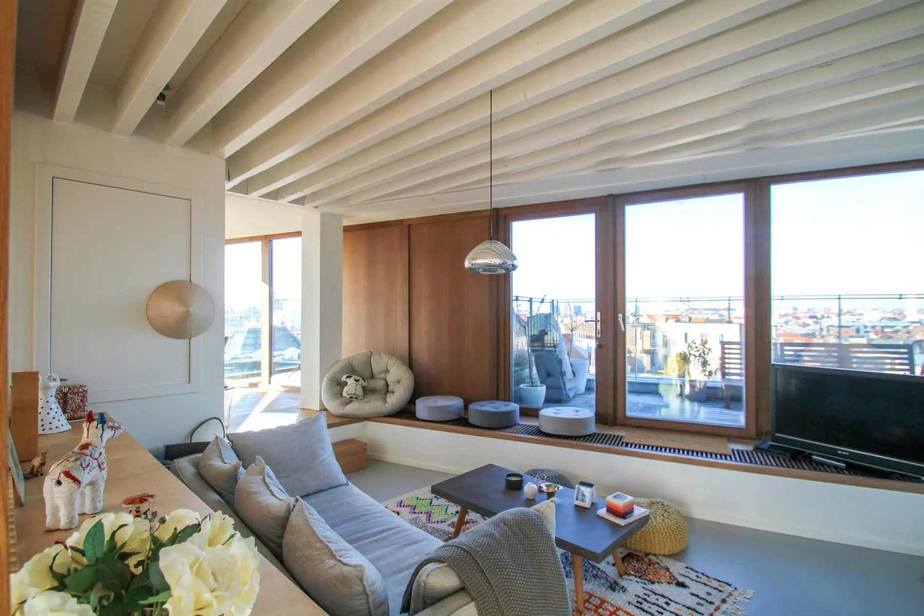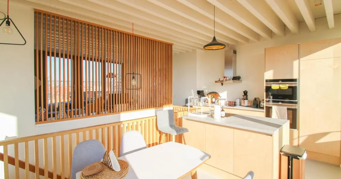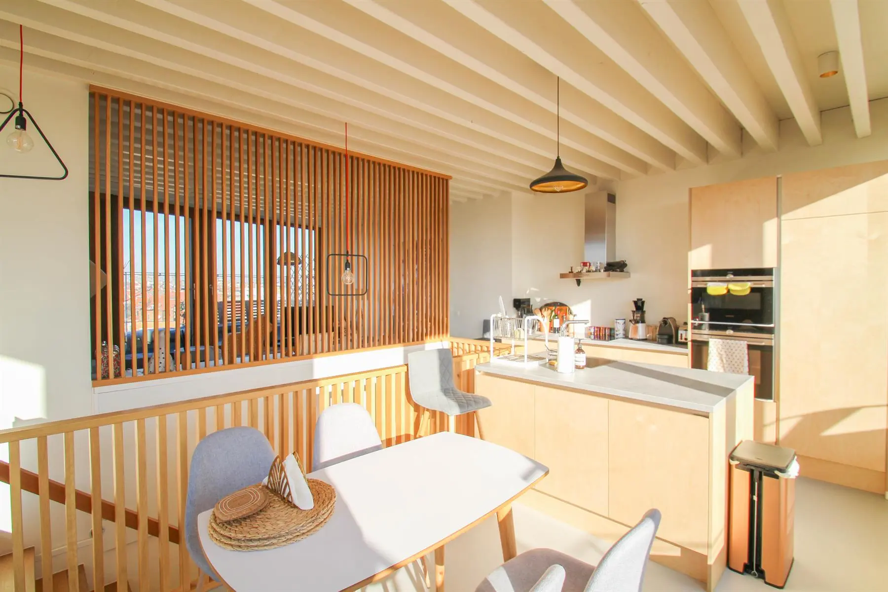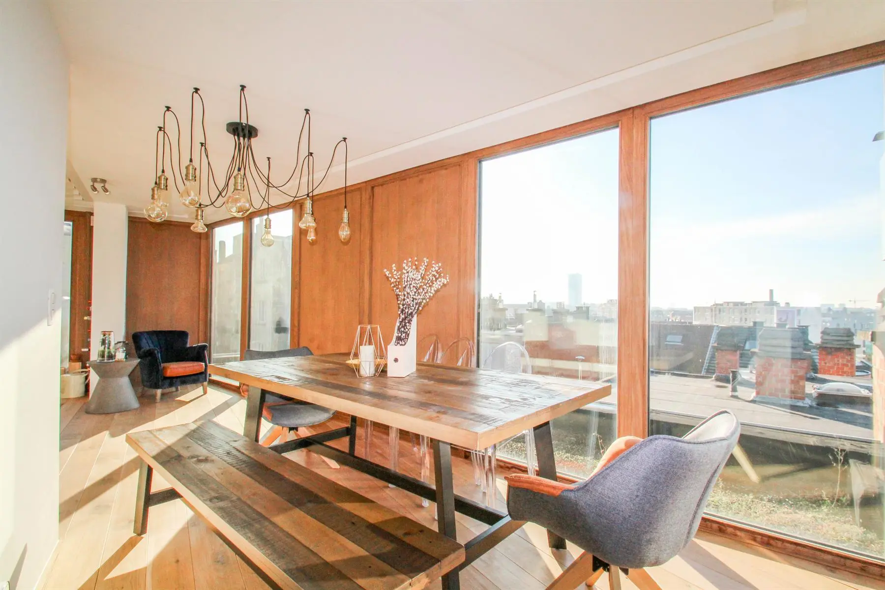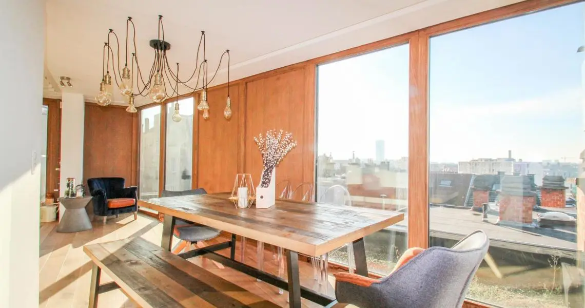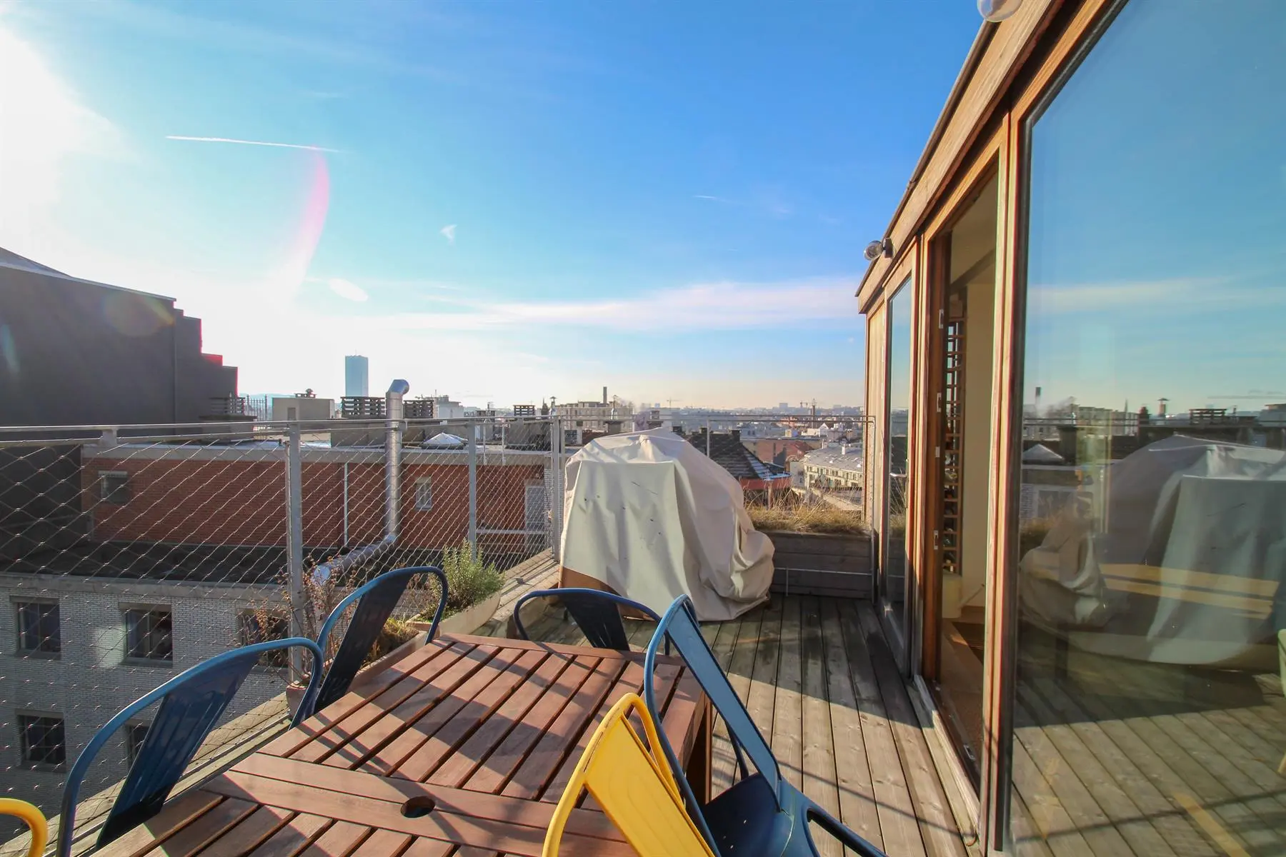 Situé à proximité de la Place Sainte-Catherine, de la rue Antoine Dansaert, des commerces et des transports en communs, dans un immeuble récent, superbe Penthouse/duplex de 132m2, très lumineux, calme, parquet partout et offrant : Au 6ème étage : hall d'entrée avec vestiaire, 2 chambres dont une Master Bedroom avec salle de bains, un bureau/dressing, salle de douche, débarras/buanderie. Au 7ème étage : Vaste séjour avec cuisine Américaine, donnant accès à deux superbes terrasses offrant une vue imprenable sur tout Bruxelles. Double vitrage. Ascenseur. Cave. Parking intérieur en supplément pour 150euros/mois. Charges de 250euros/mois. PEB : C+ Libre immédiatement. Bien exceptionnel, à visiter sans tarder!