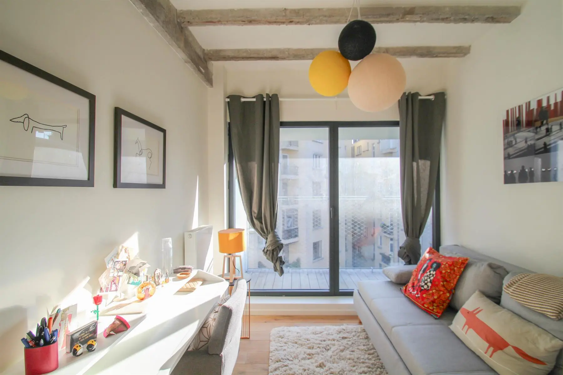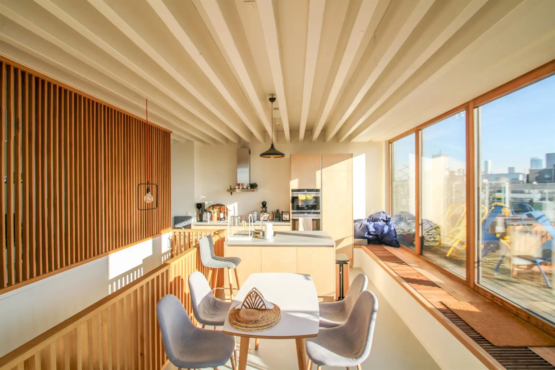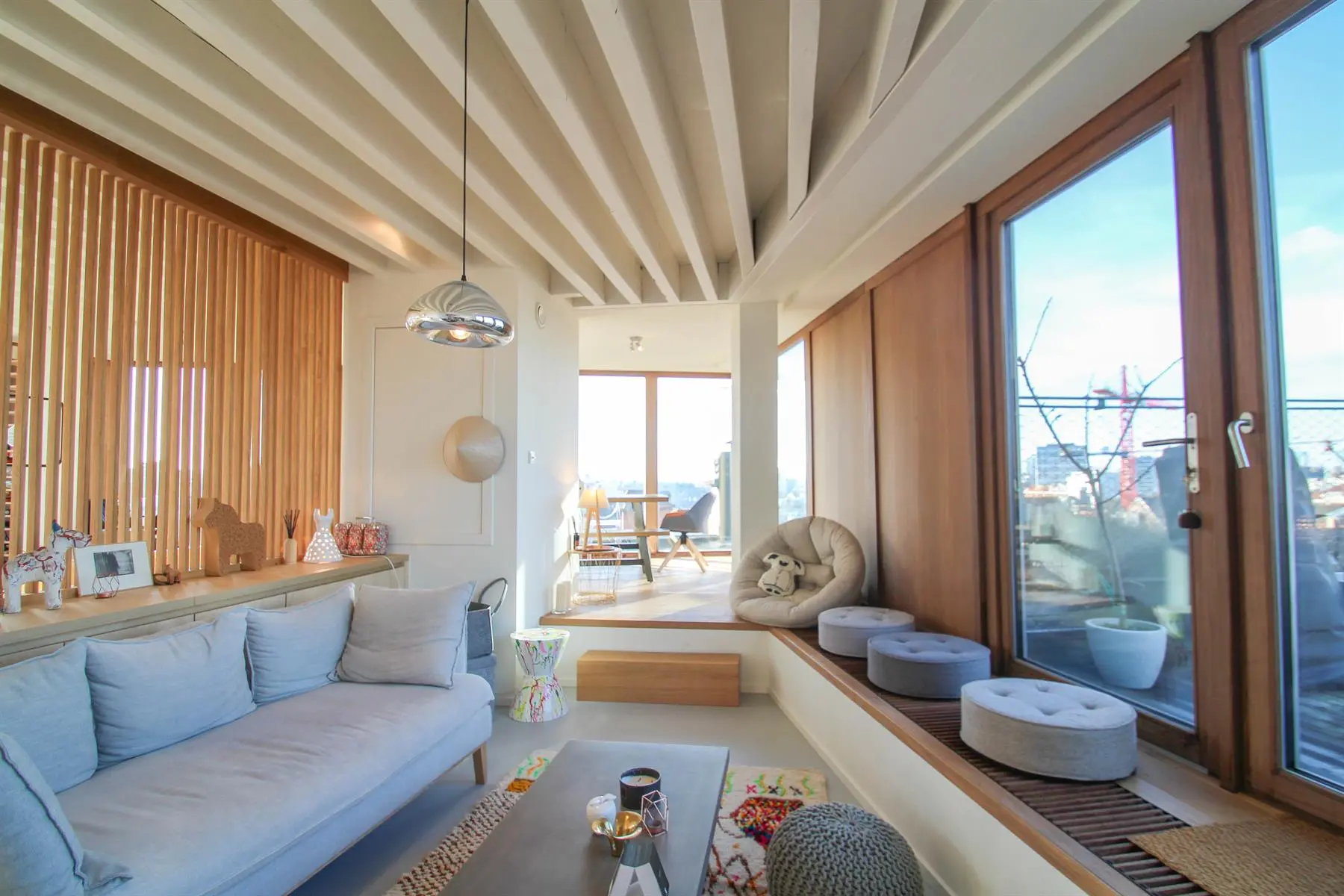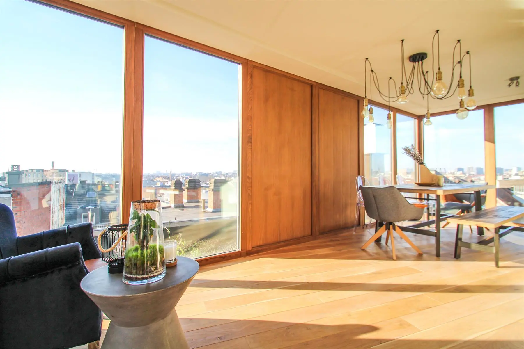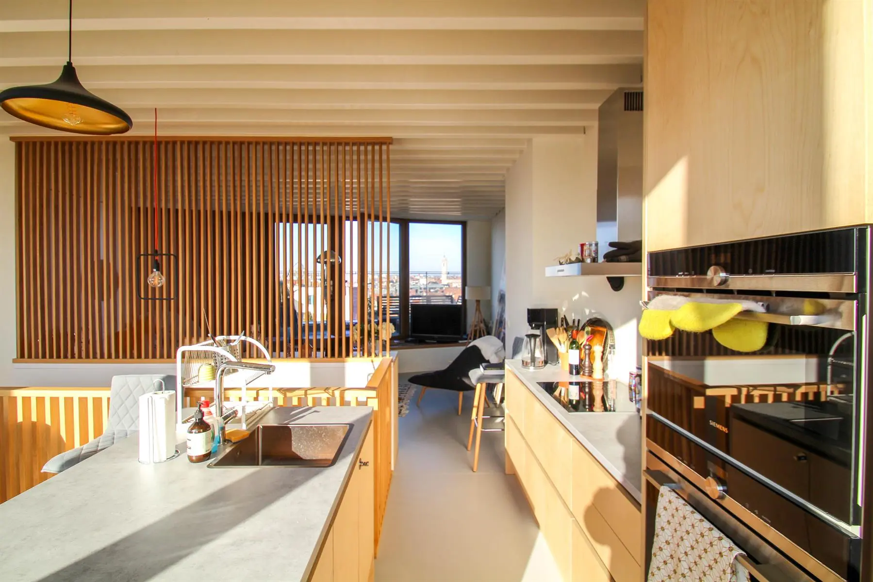Situé à proximité de la Place Sainte-Catherine, de la rue Antoine Dansaert, des commerces et des transports en communs, dans un immeuble récent, superbe Penthouse/duplex de 132m2, très lumineux, calme, parquet partout et offrant : Au 6ème étage : hall d'entrée avec vestiaire, 2 chambres dont une Master Bedroom avec salle de bains, un bureau/dressing, salle de douche, débarras/buanderie. Au 7ème étage : Vaste séjour avec cuisine Américaine, donnant accès à deux superbes terrasses offrant une vue imprenable sur tout Bruxelles. Double vitrage. Ascenseur. Cave. Parking intérieur en supplément pour 150euros/mois. Charges de 250euros/mois. PEB : C+ Libre immédiatement. Bien exceptionnel, à visiter sans tarder!