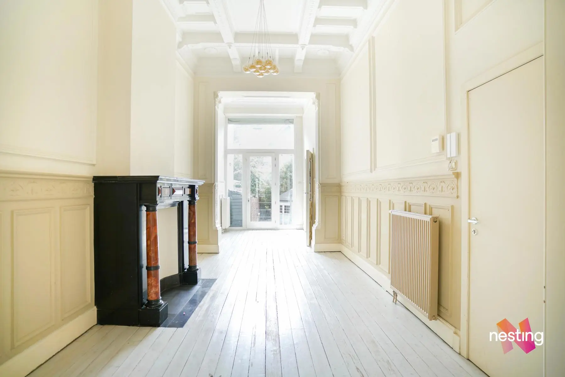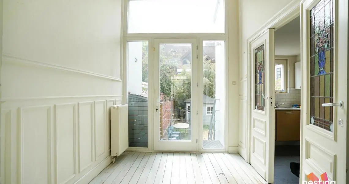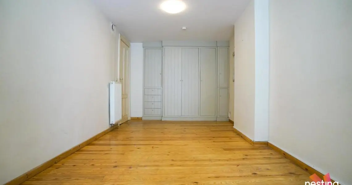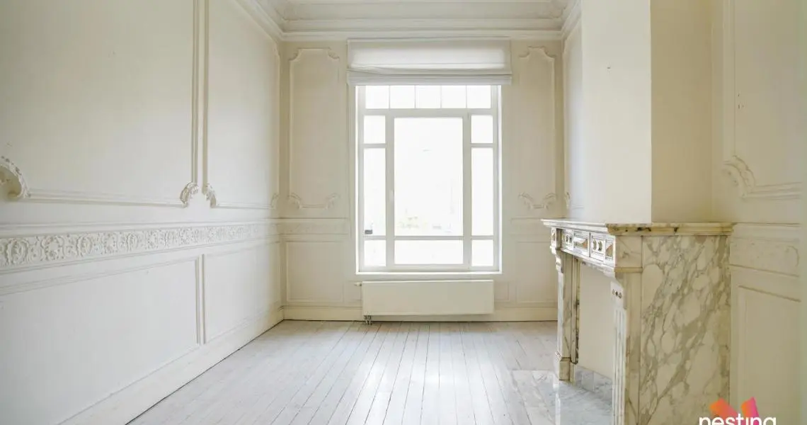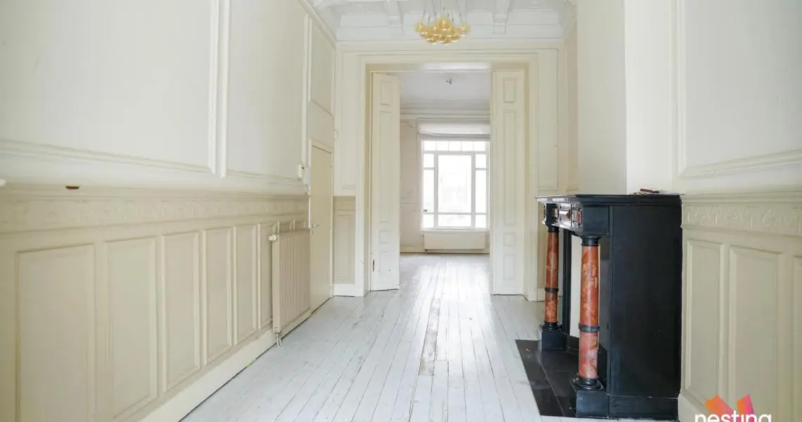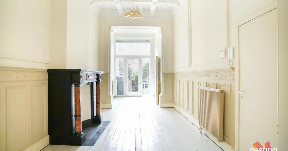Dans un immeuble de maître, superbe Rez de jardin de +/- 150m2 en ‘duplex inversé’ offrant de grandes et lumineuses réceptions en plancher avec de beaux plafonds moulurés.