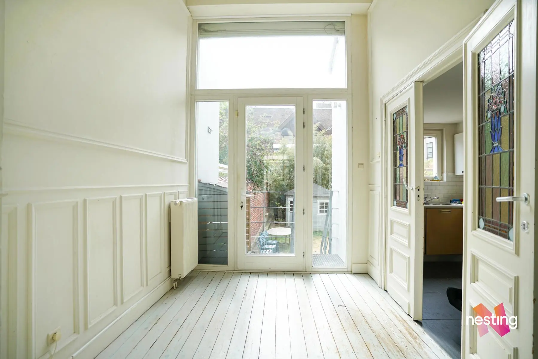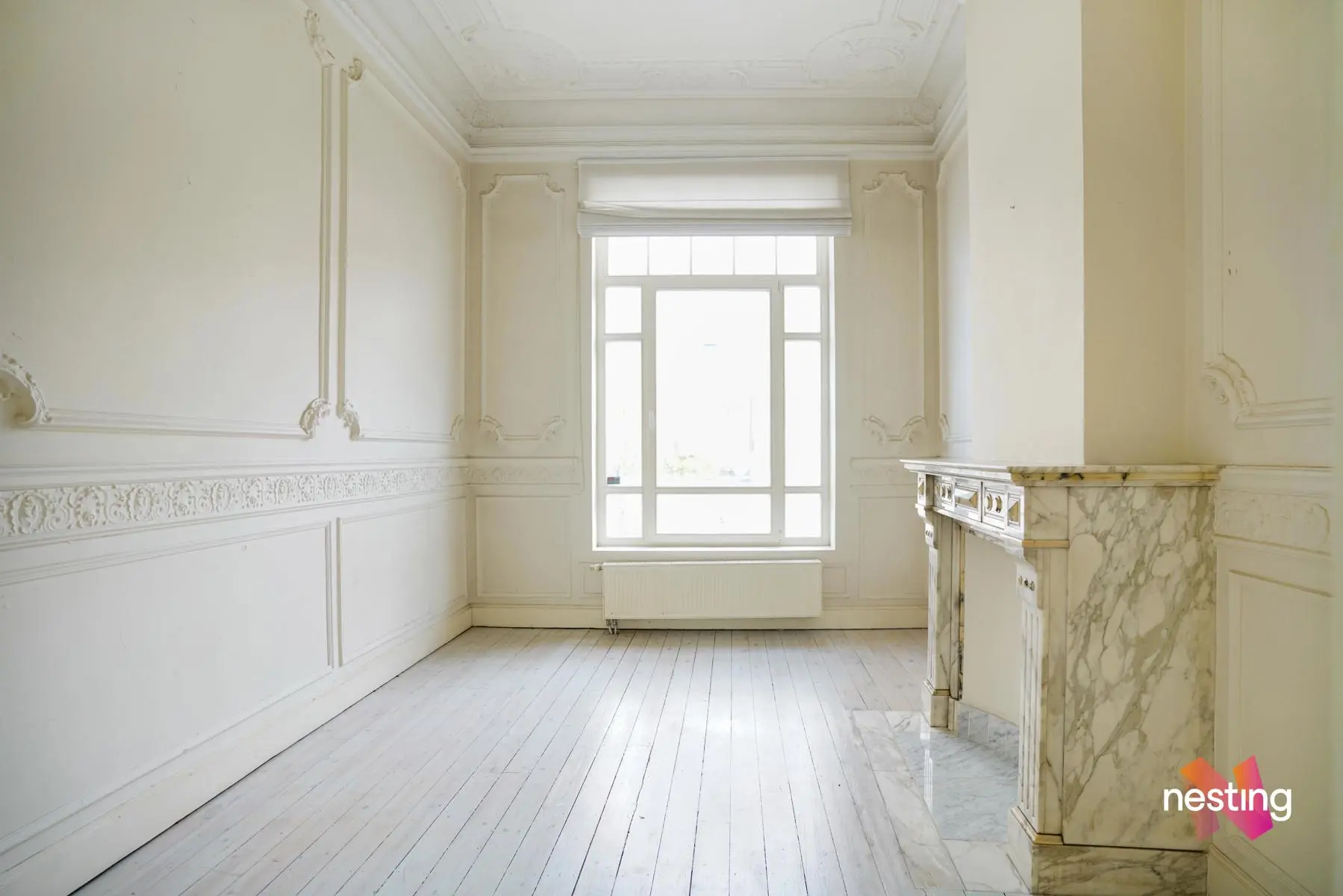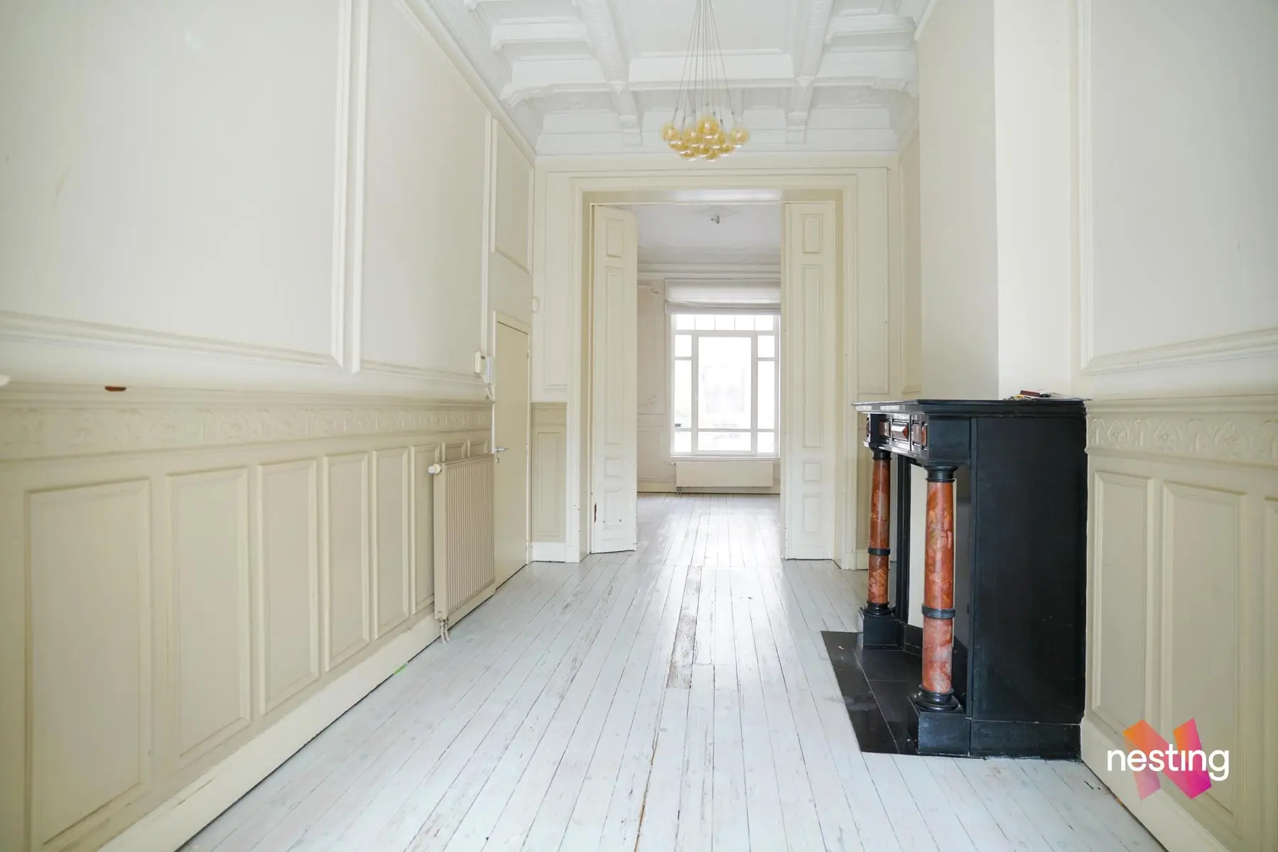 Dans un immeuble de maître, superbe Rez de jardin de +/- 150m2 en ‘duplex inversé’ offrant de grandes et lumineuses réceptions en plancher avec de beaux plafonds moulurés.