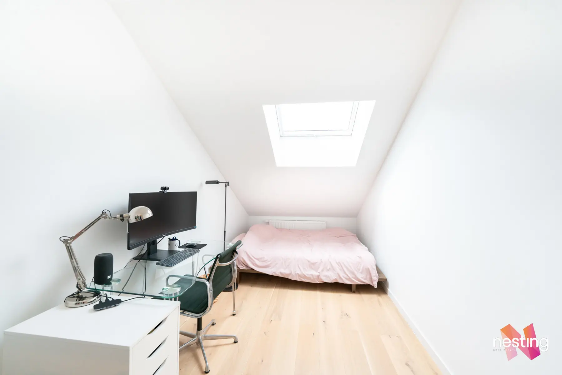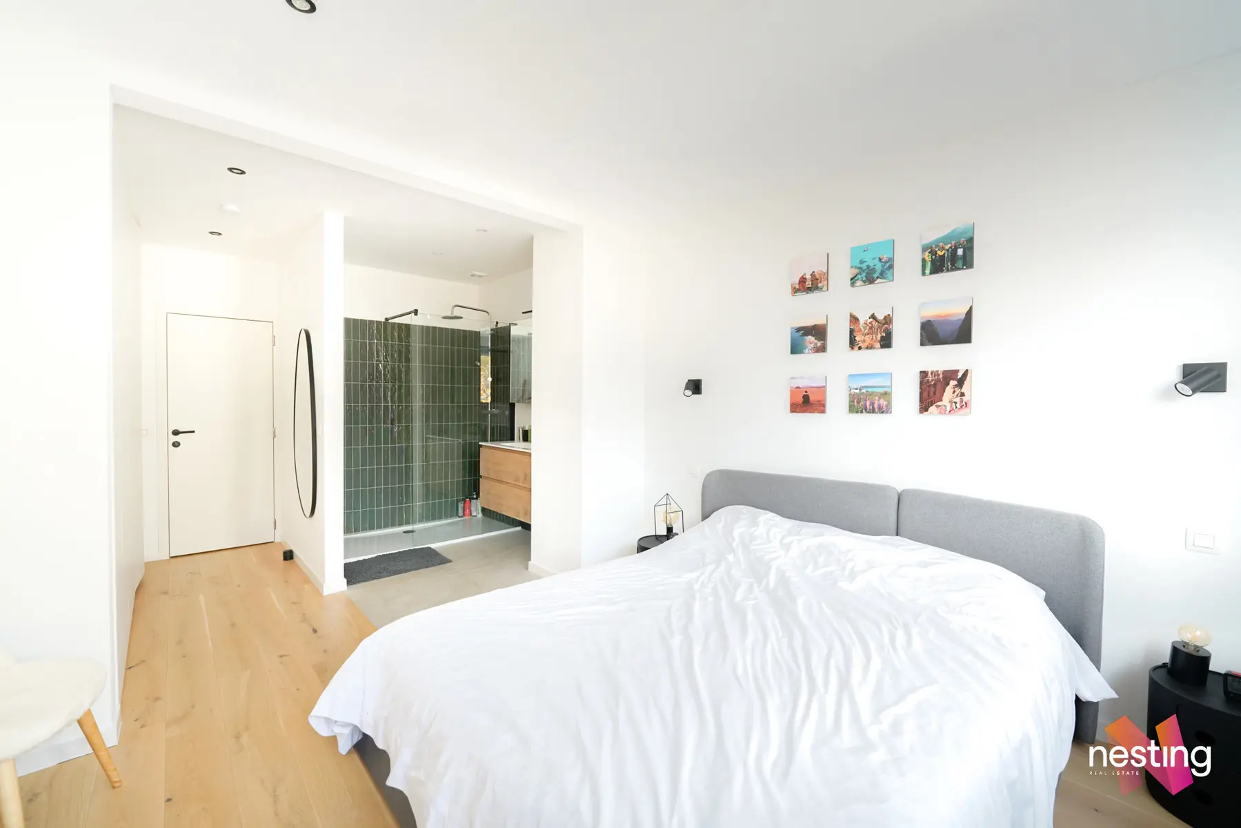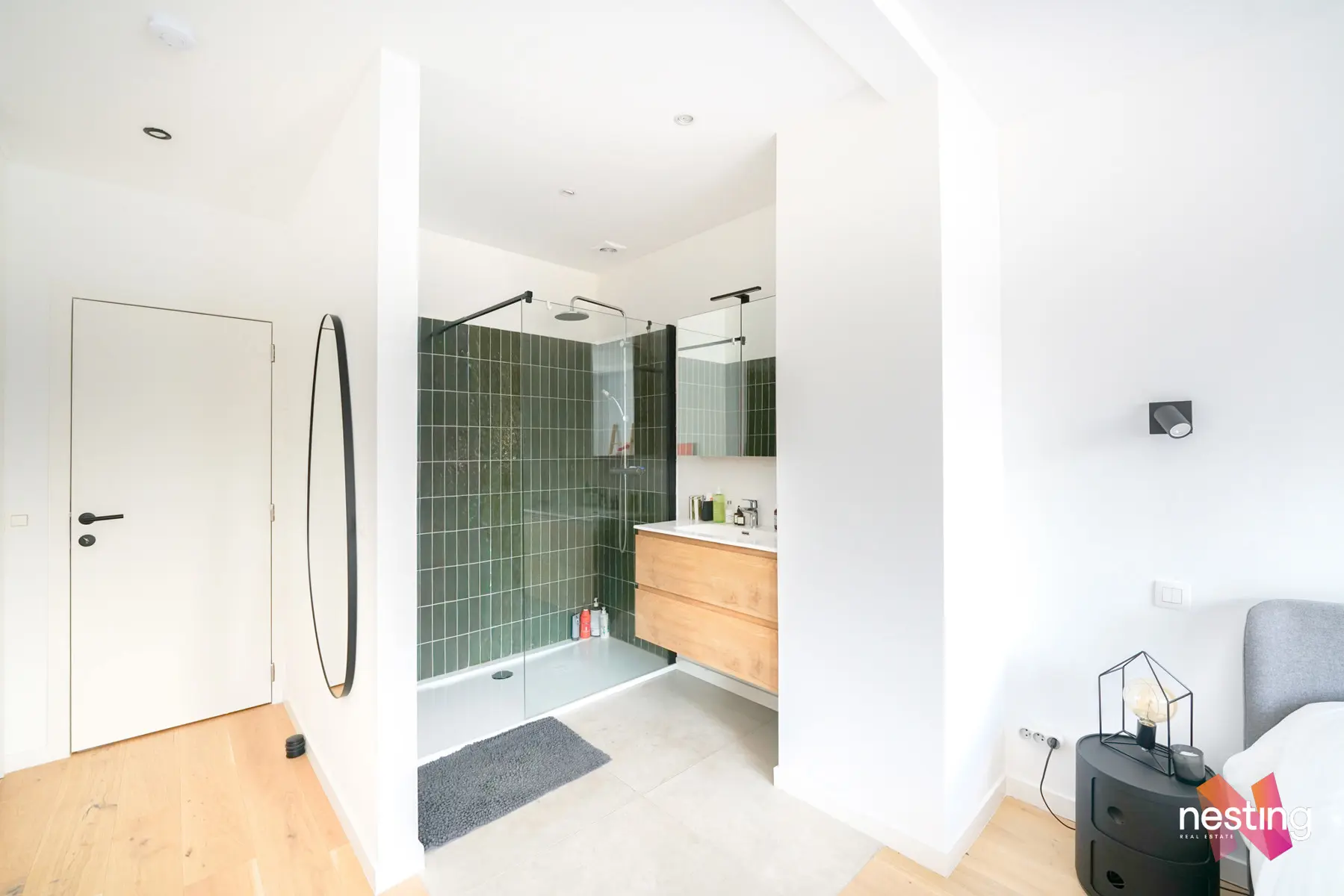 À l’étage : hall de nuit, 2 chambres( 12m2), une salle de bain et Master bedroom de +- 20m2 avec avec salle de douche privative.