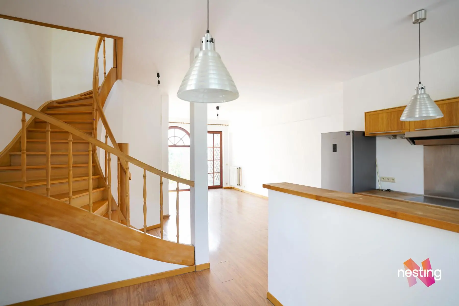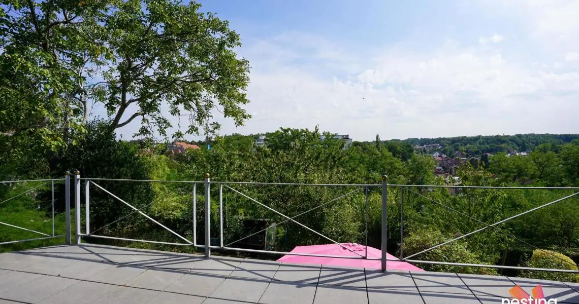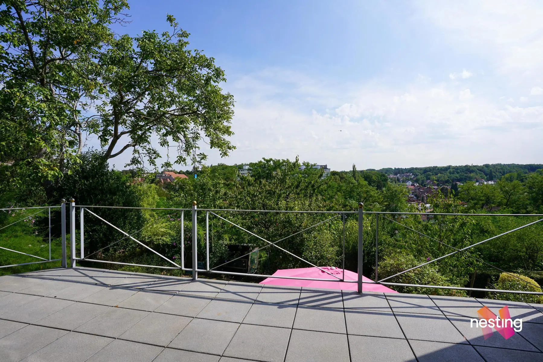 Au rez-de-chaussée : hall d'entrée séparé grand séjour de +/- 45m2 avec cuisine US, le tout donnant accès à une superbe terrasse de +/-16m² et orientée plein sud !