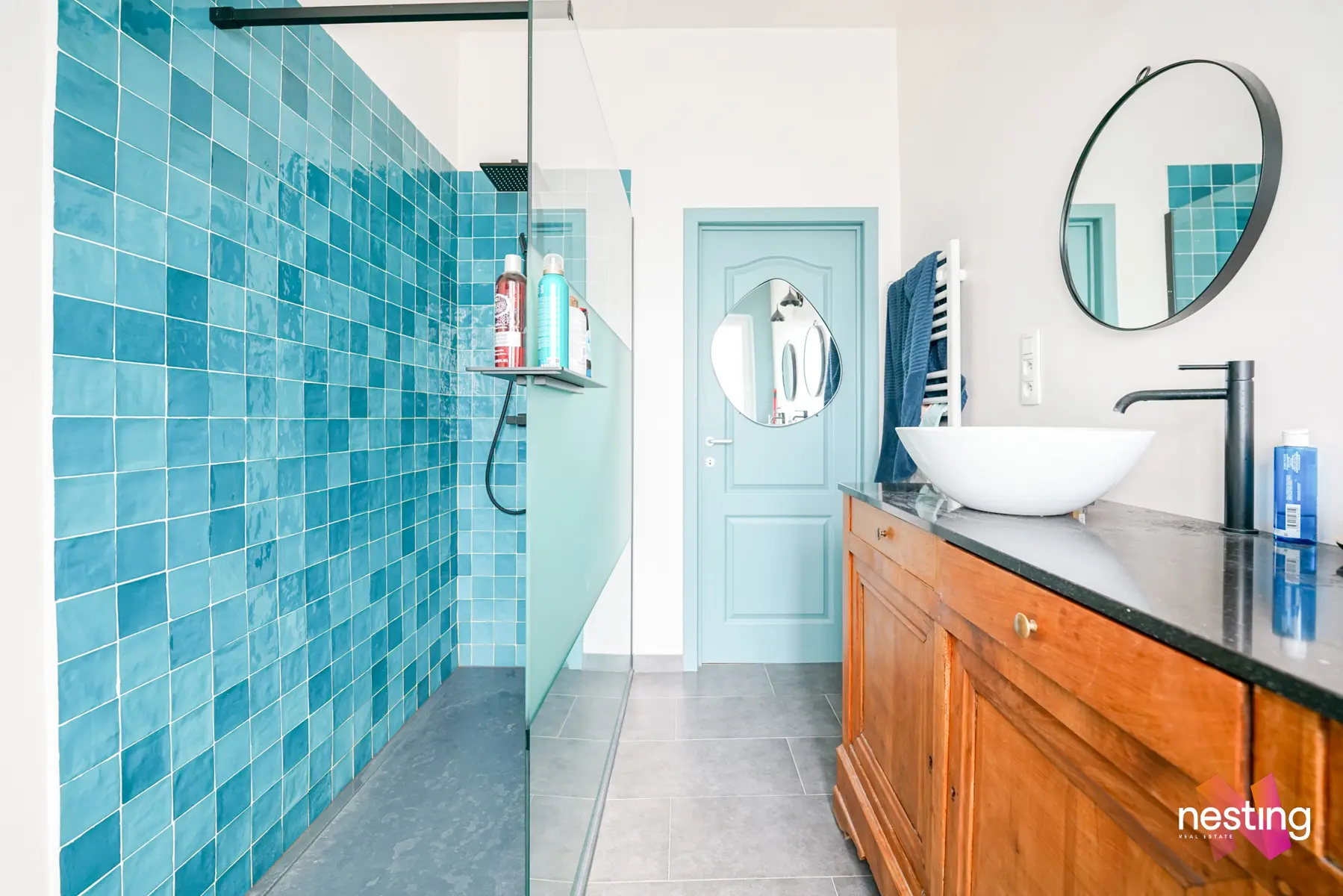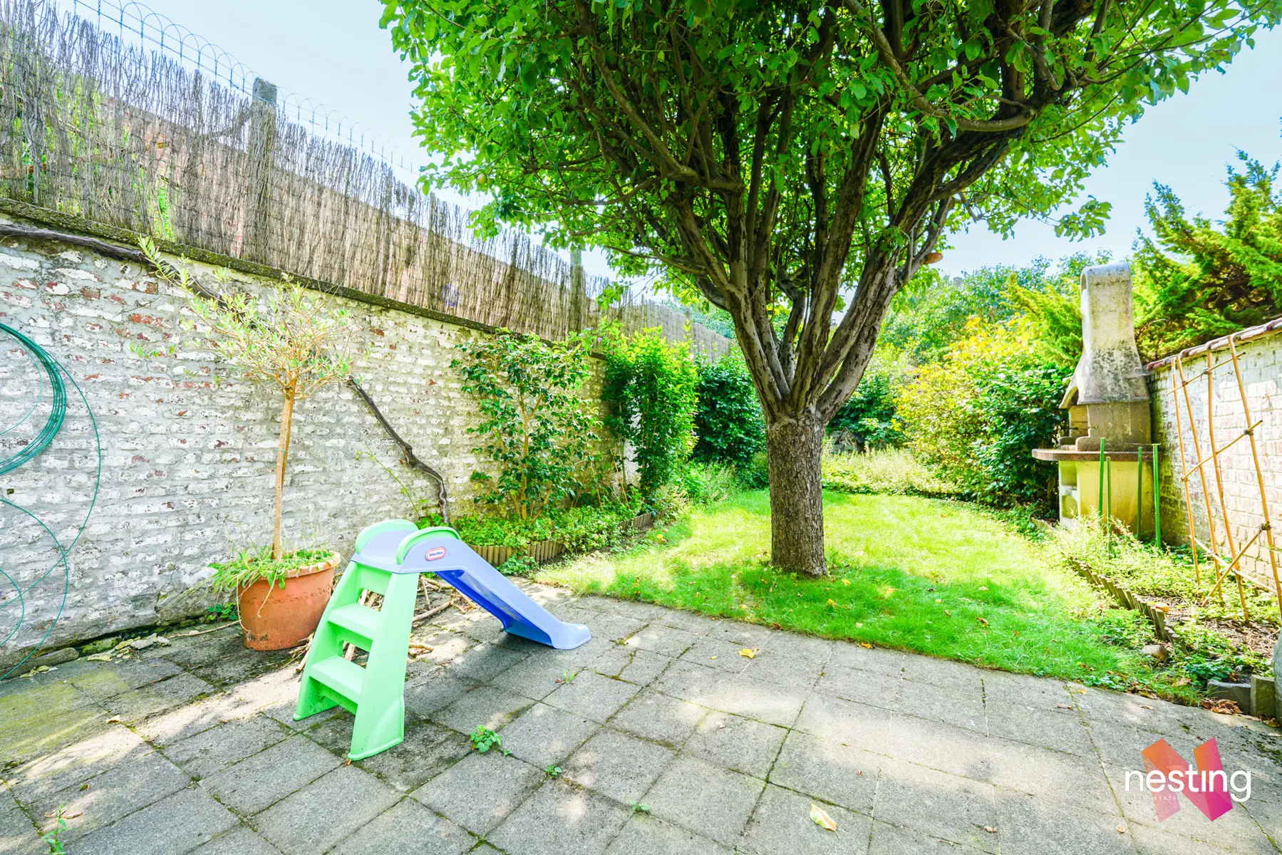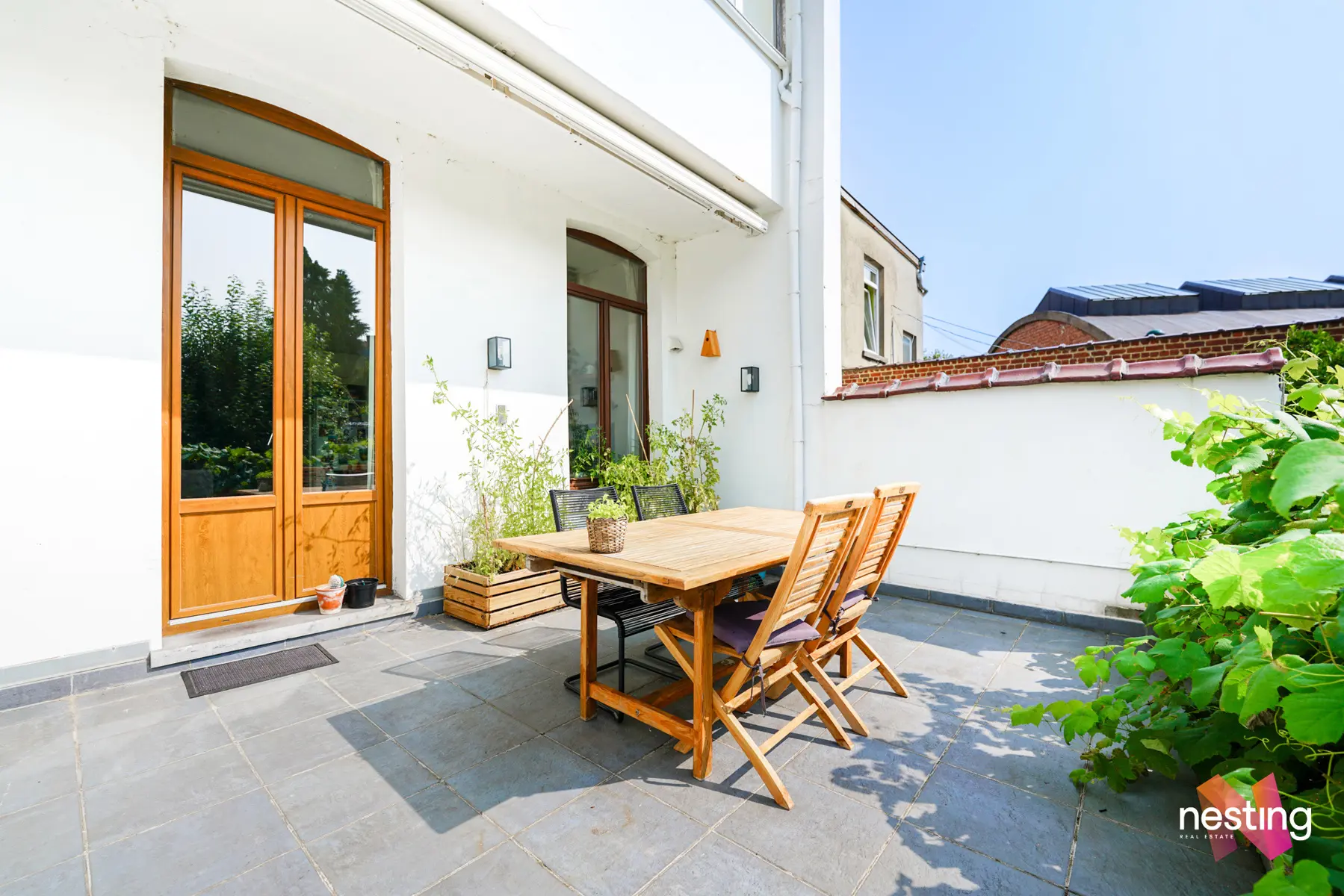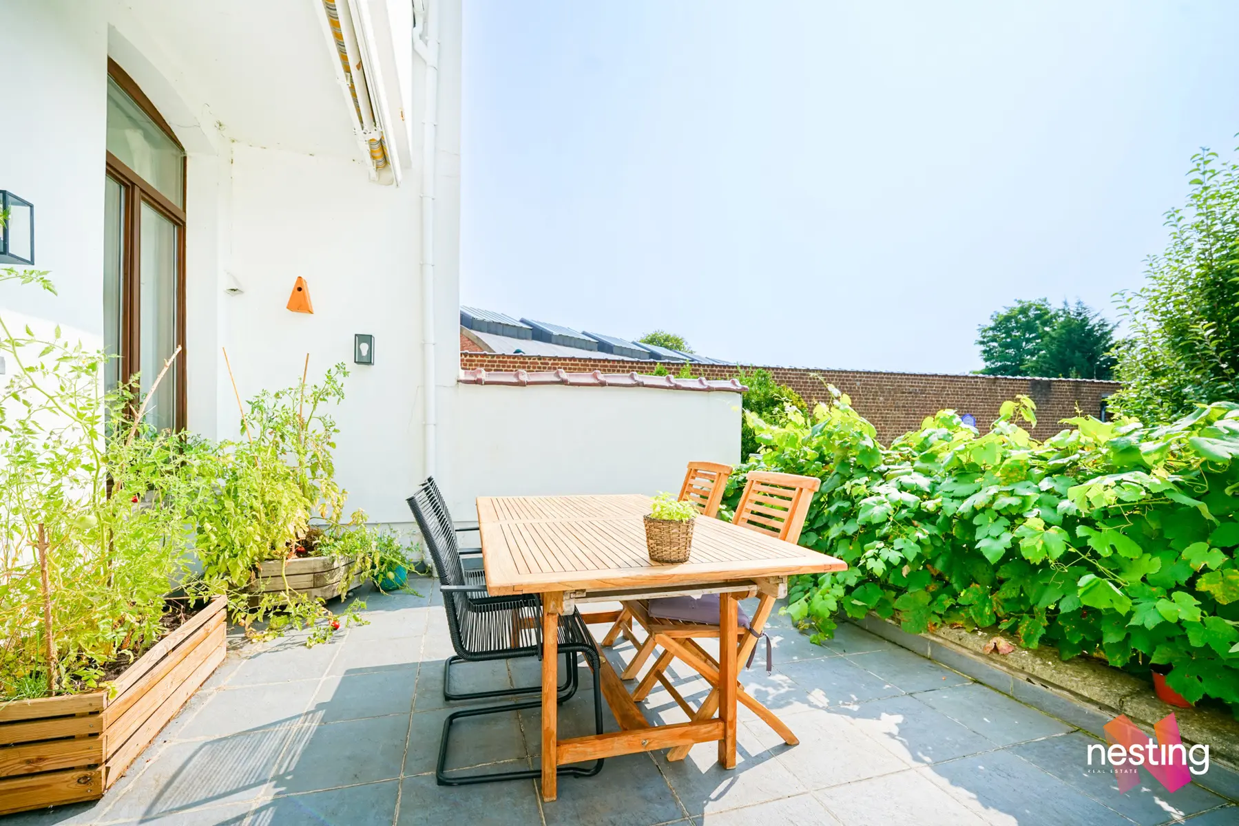 Au rez-de-chaussée : une lumineuse pièce à vivre avec un feu au bois, une grande cuisine américaine super équipée et une salle à manger donnant sur une grande terrasse et le jardin. Au 1er étage : 2 chambres (+- 15,5 et 13) et une belle salle de douche avec wc.