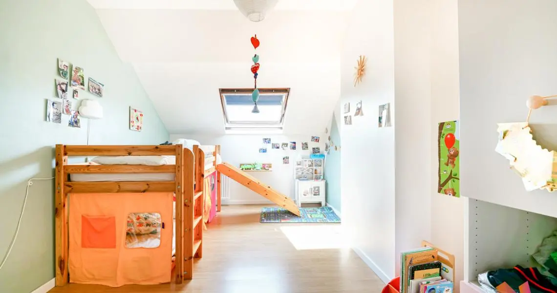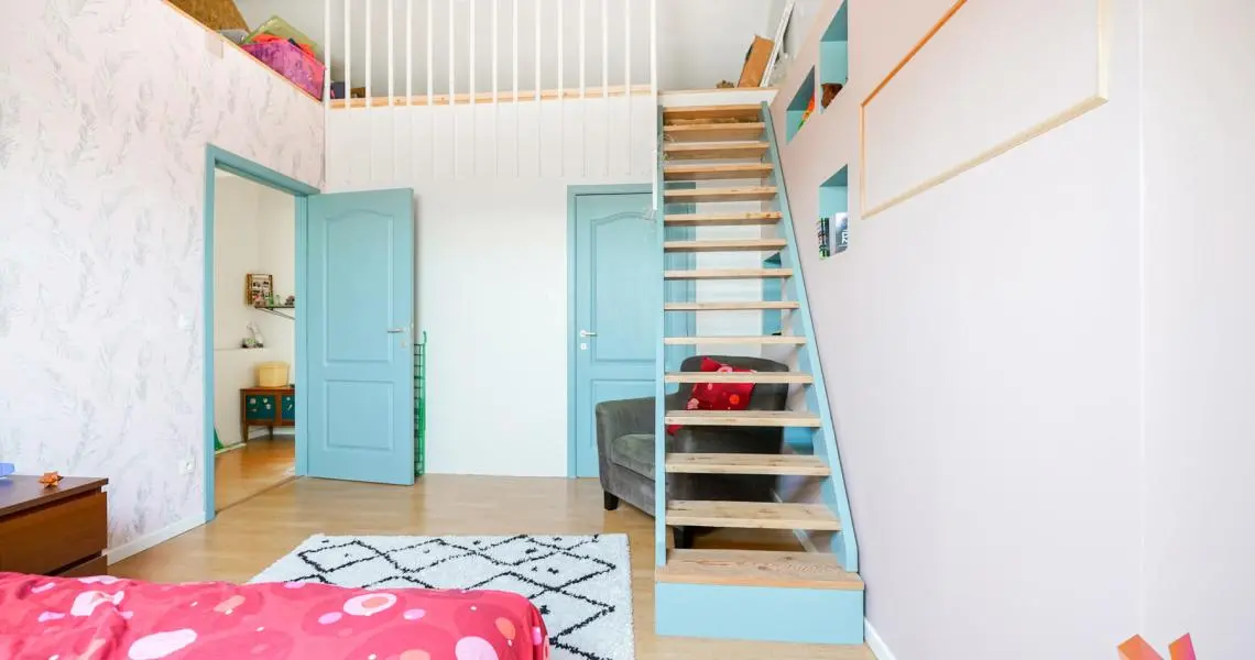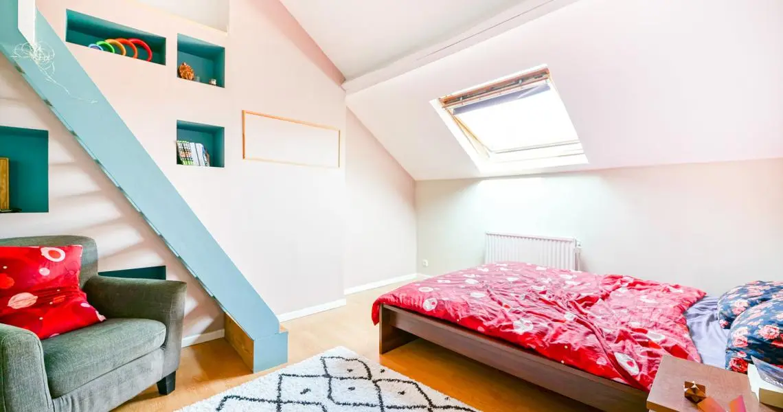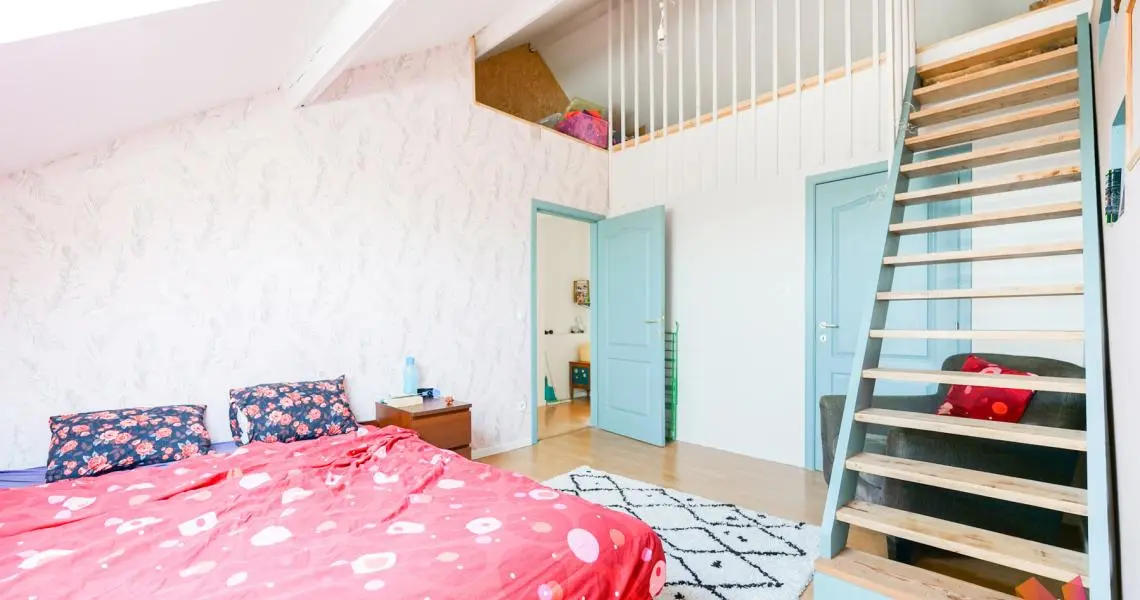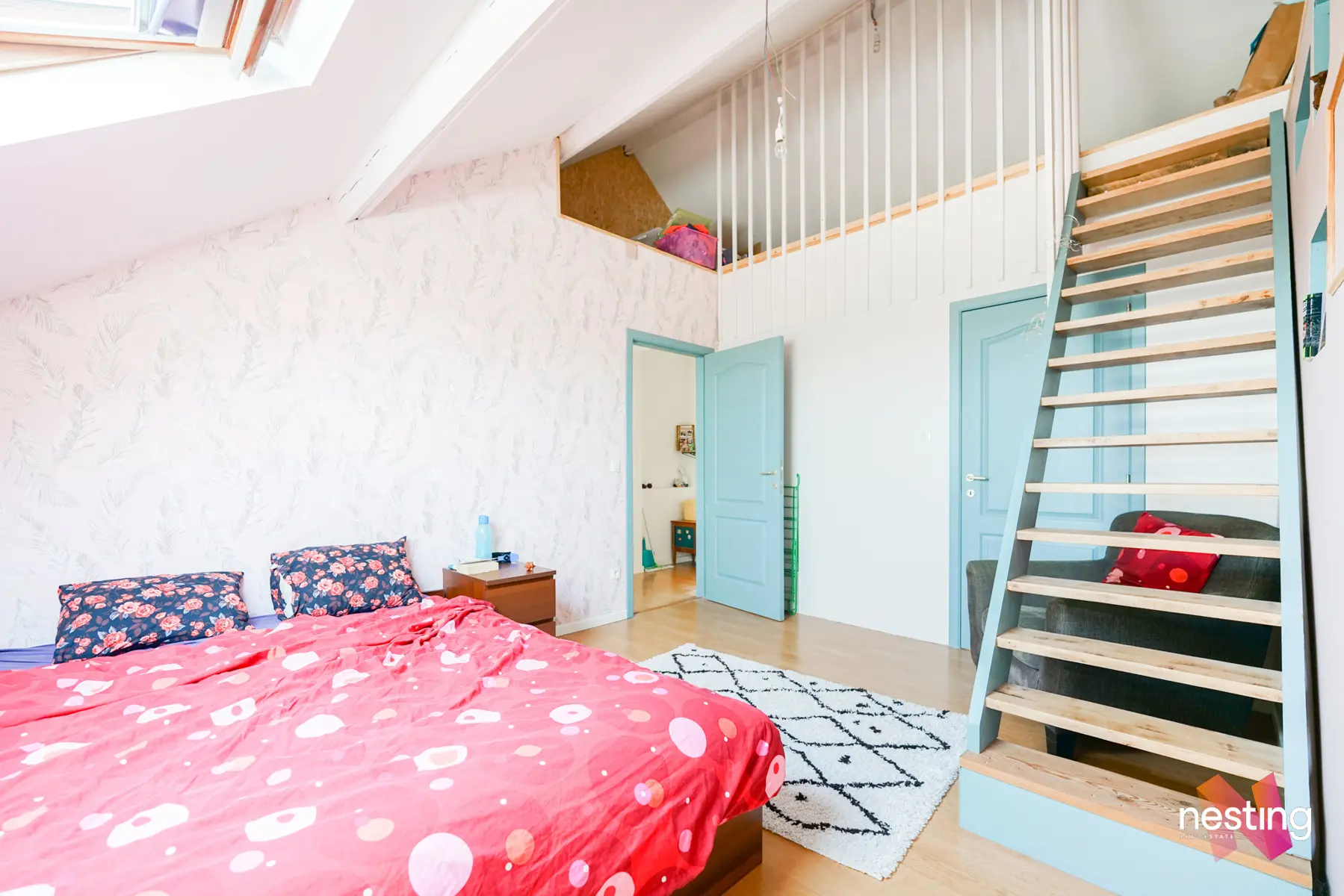 Au 2e étage : 2 chambres (+- 15,5 avec une mezzanine et 13) et une salle de bains avec wc.