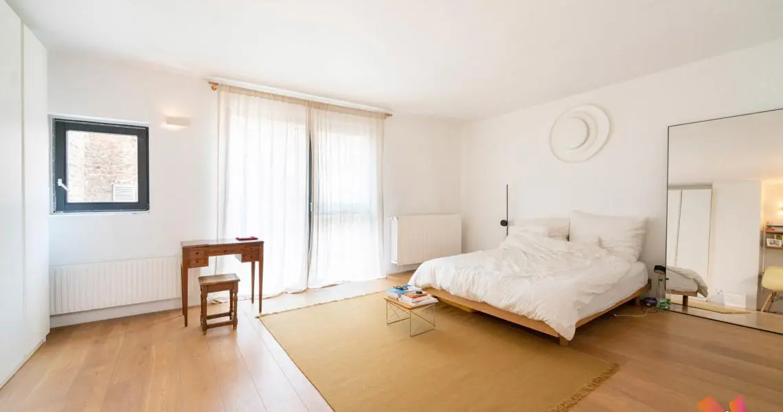 Étage : une belle mezzanine de 27 m² surplombe le séjour et mène à deux grandes chambres (23 m² et 17 m²), ainsi qu’à une salle de bain complète avec double lavabo, baignoire, douche et WC.