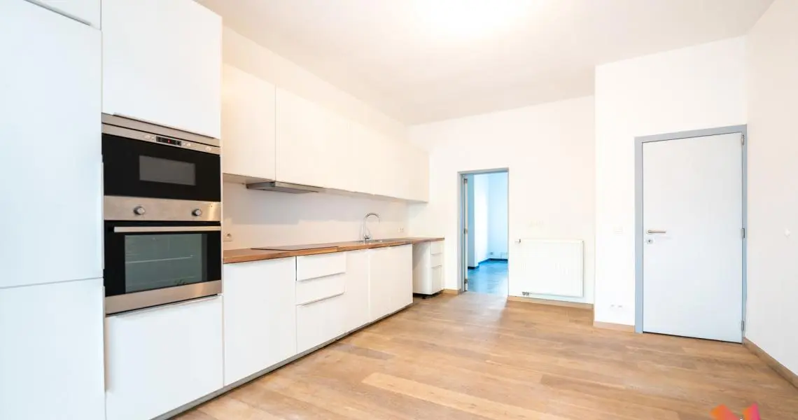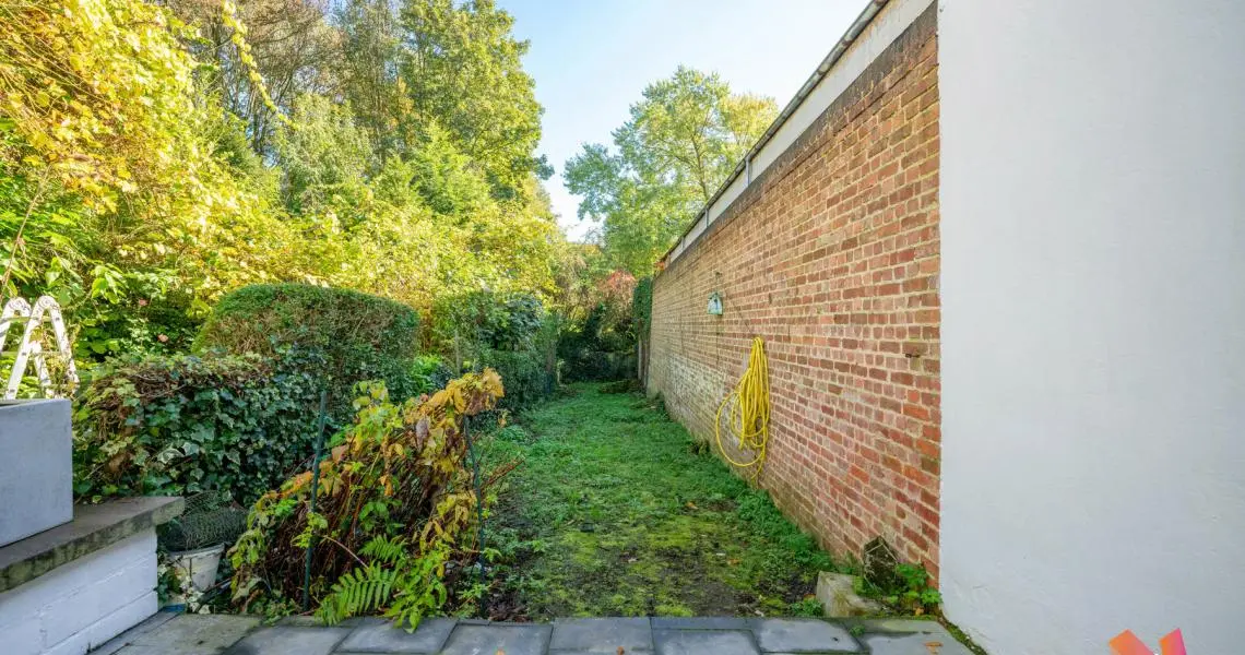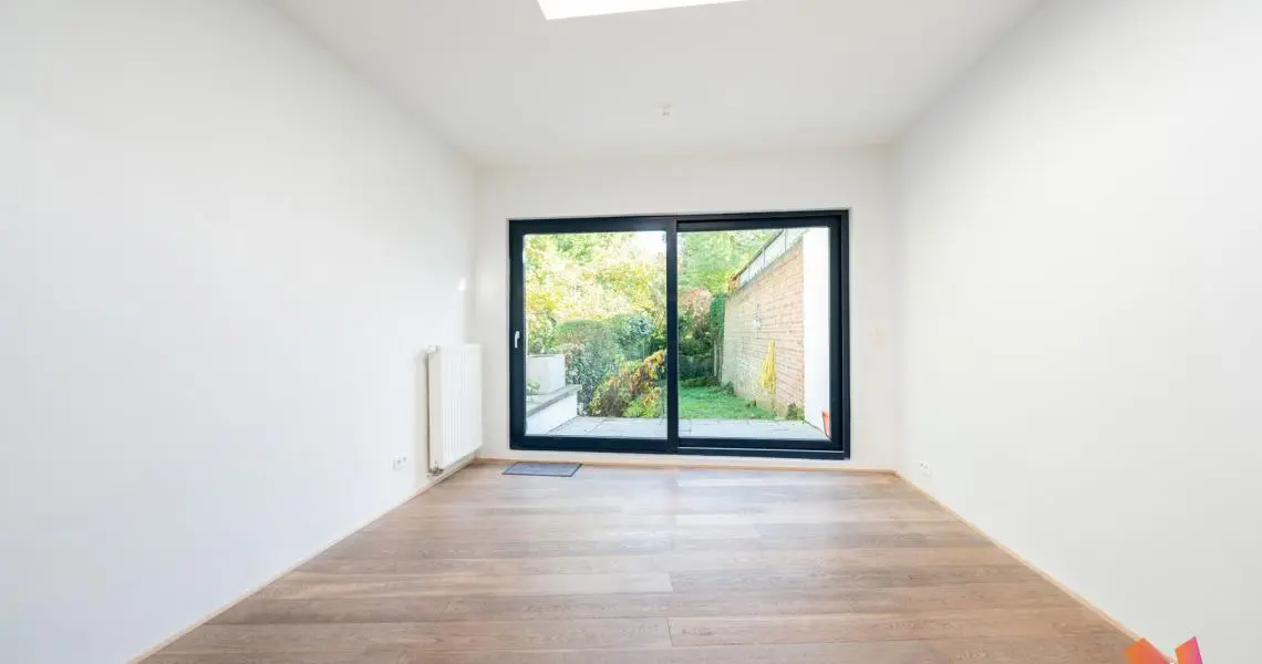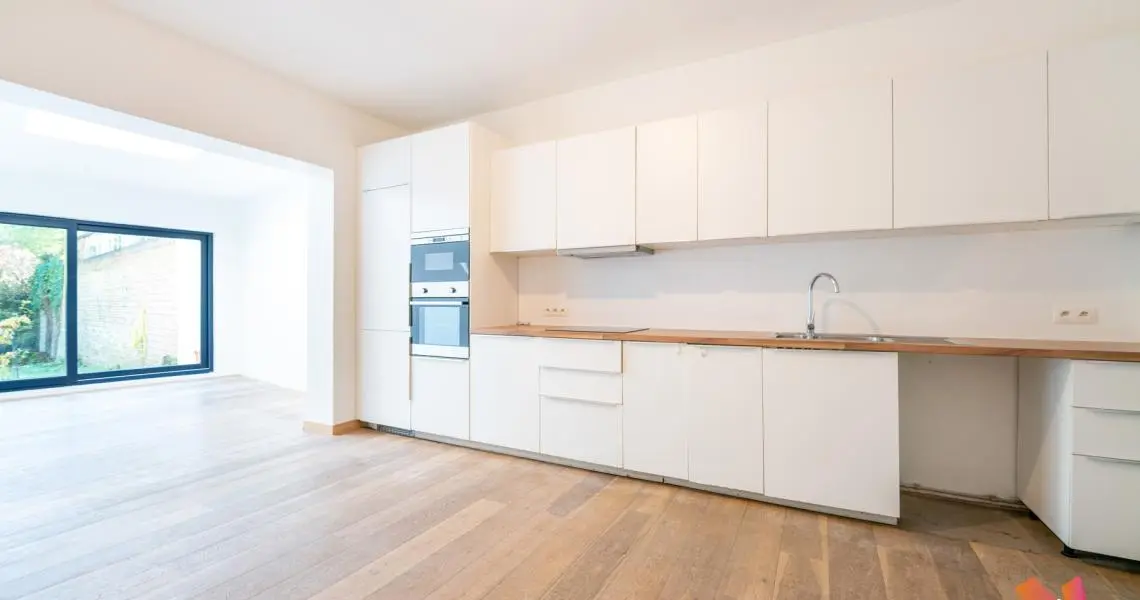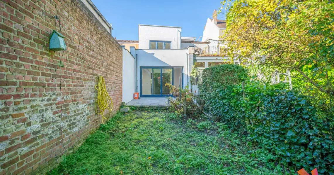 Au rez-de-chaussée : un jardinet privatif de +- 25m² à l'avant de la maison, un hall d'entrée, un salon avant, une cuisine ouverte super équipée/salle à manger lumineux (+-35m²) et un jardin Est de +- 100m².