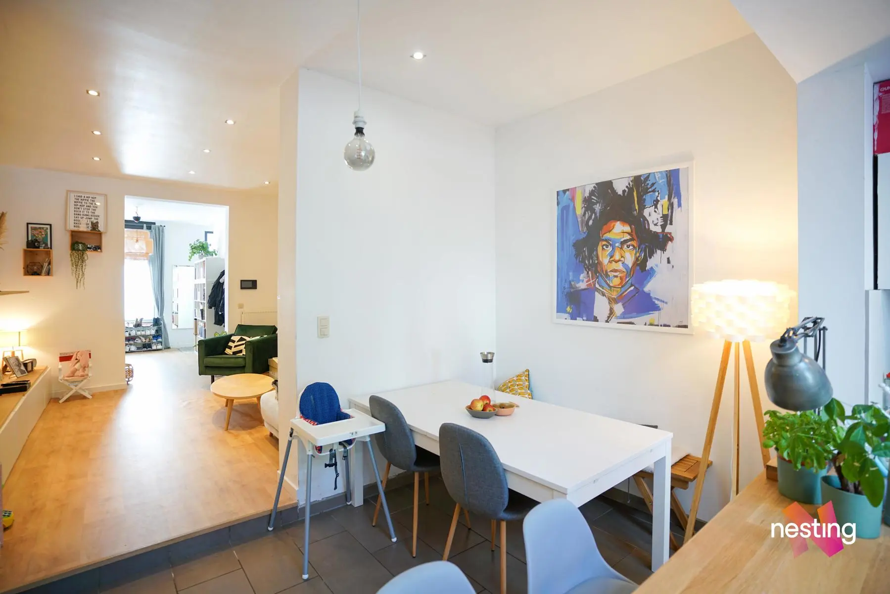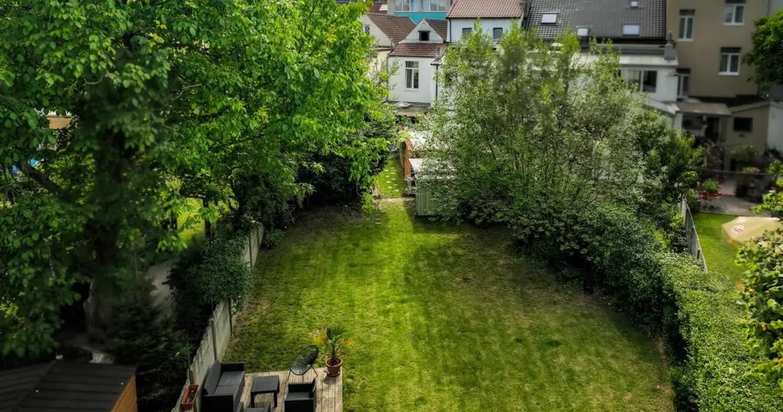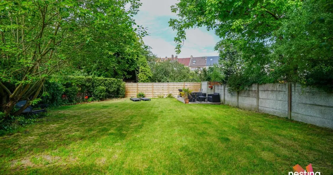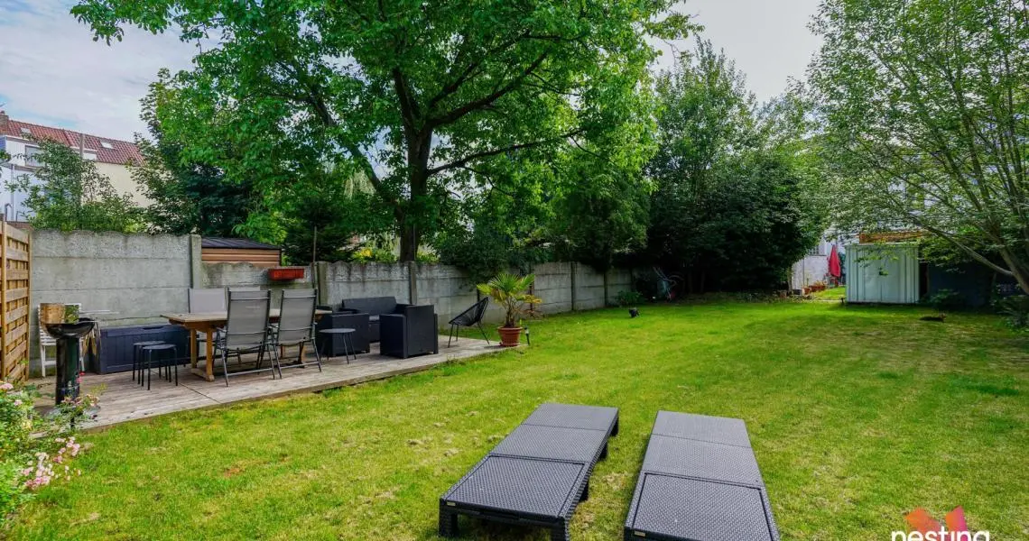au Rez : hall d’entrée, bureau, salon salle à manger, toilette séparée, cuisine US super-équipée, donnant sur la terrasse et le jardin de +/-260m2 ensoleillé toute la journée !