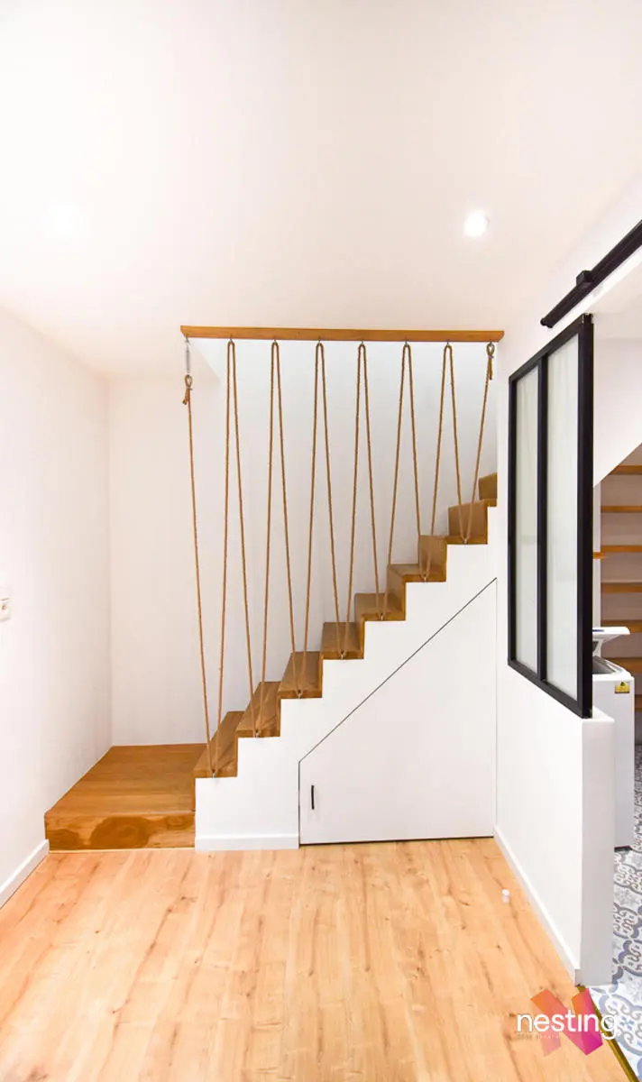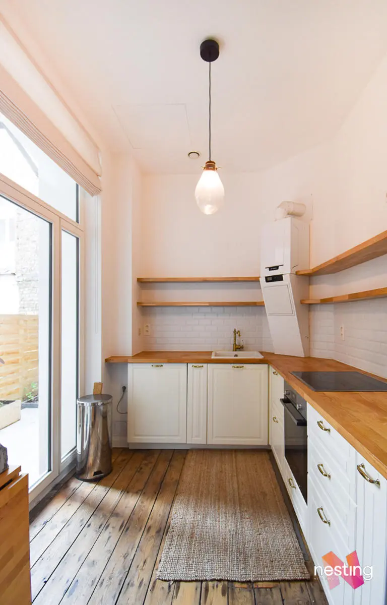 Rez-de-chaussée : Salon/salle à manger, cuisine ouverte super équipée, cour privée de +- 15m2, une chambre.
