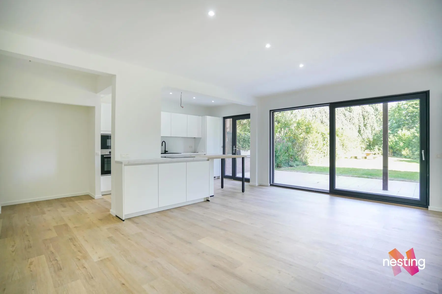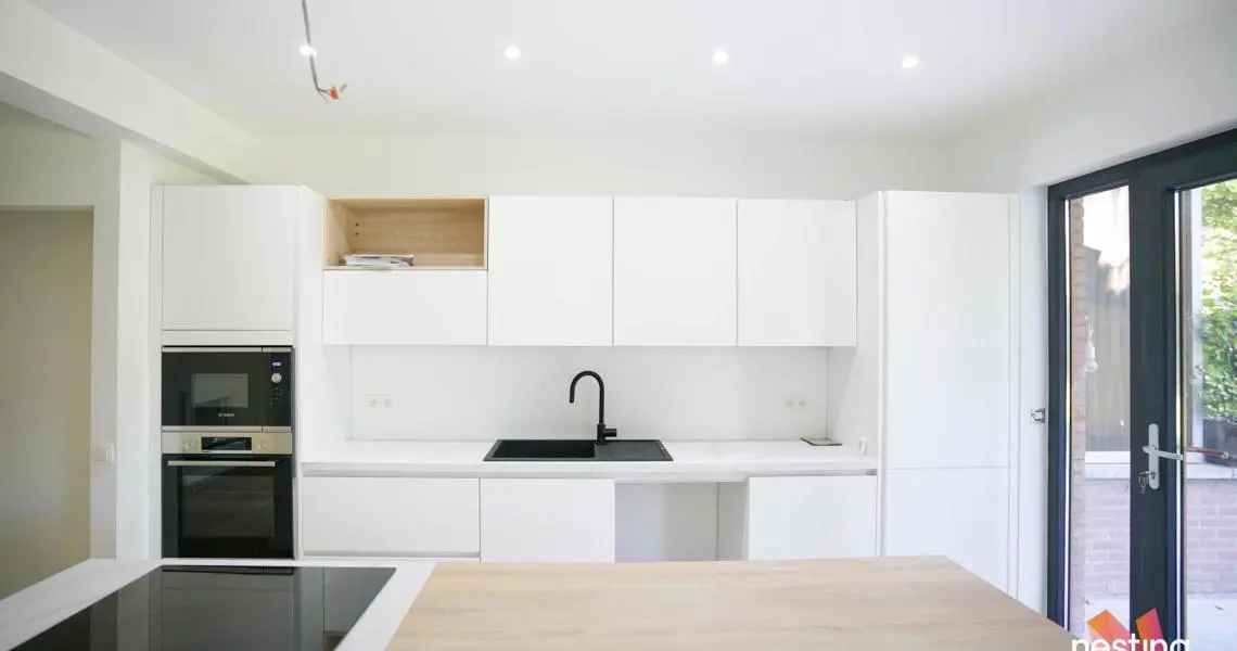 Hall d'entrée avec un coin vestiaire, Cuisine US super équipée, séjour de +/-60m2 donnant sur la terrasse de +/-50m2 et le jardin de +/-500m2 orienté sud-est, hall de nuit, 2 chambres, salle de douche avec espace buanderie et wc séparé.