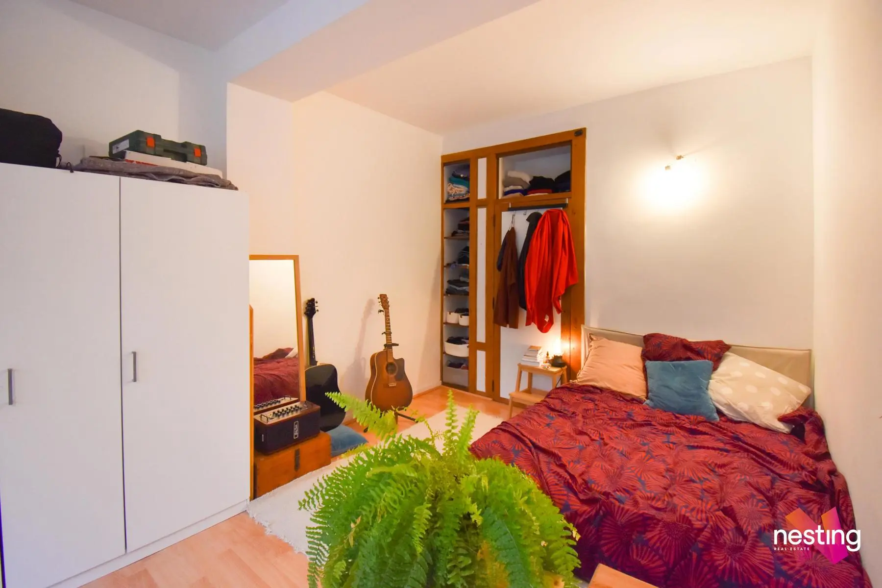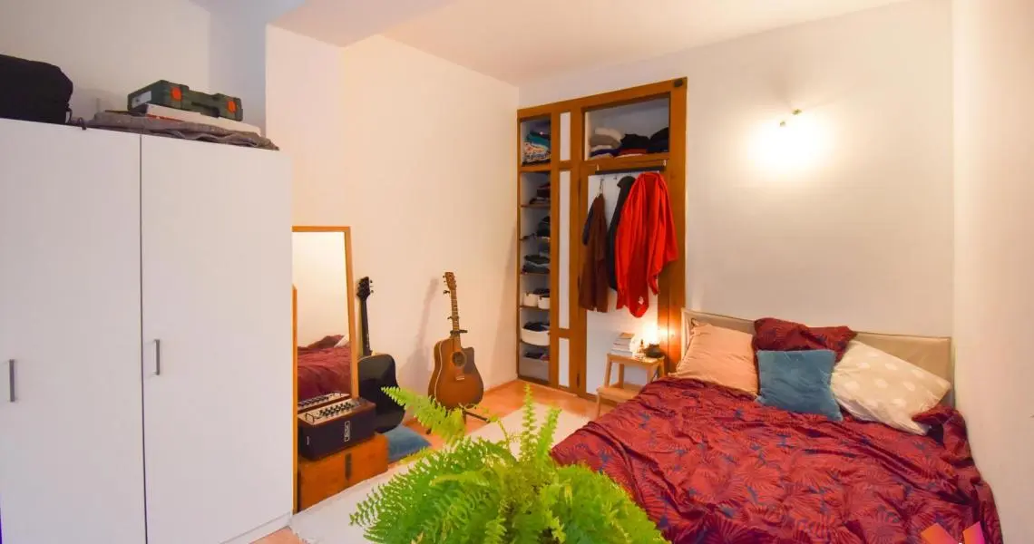 Un hall d'entrée avec coin buanderie et placards (machine à laver inclus), une cuisine fermée équipée (pas de lave vaisselle), un grand salon + coin nuit, une salle de bains avec wc, une terrasse et une cave.