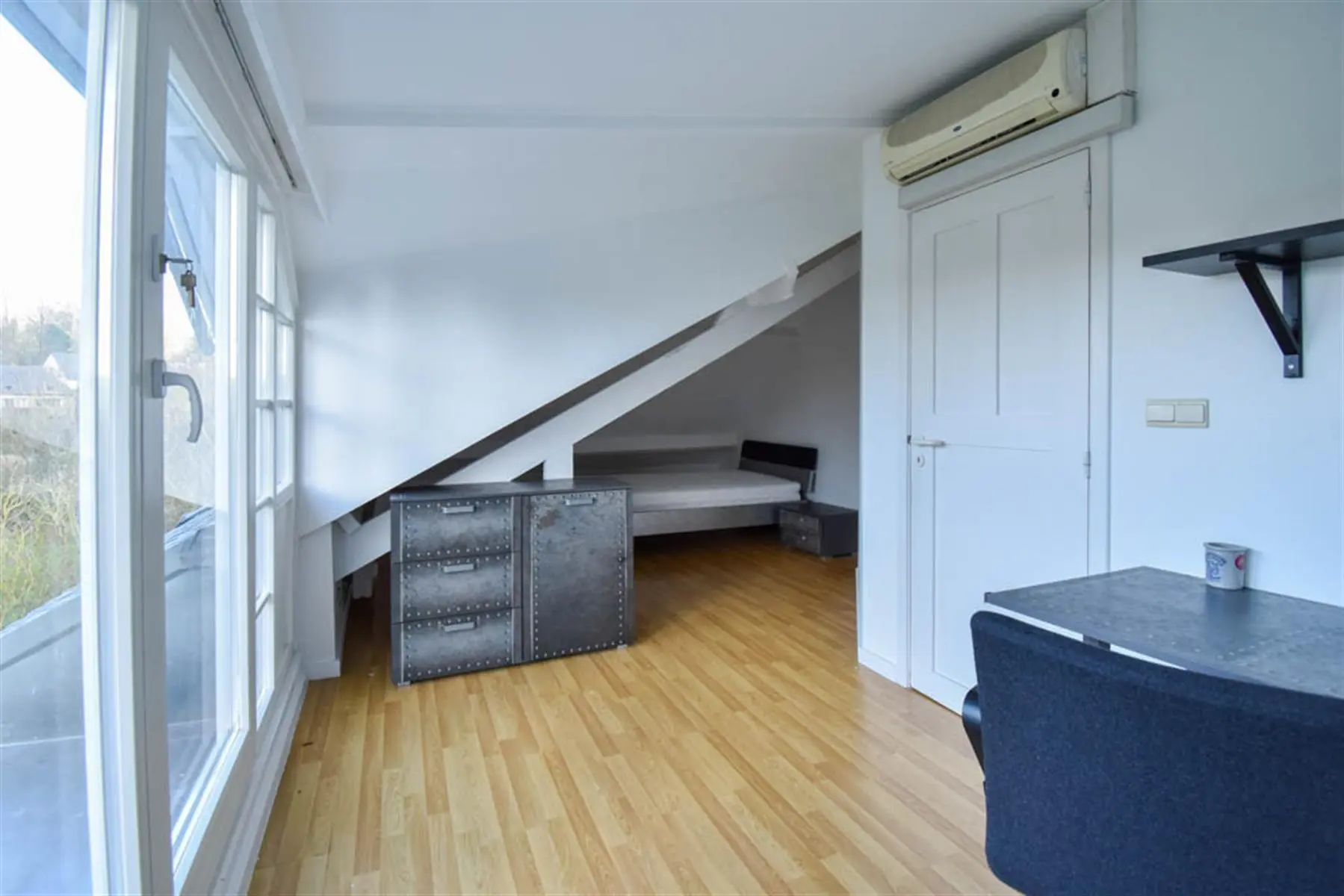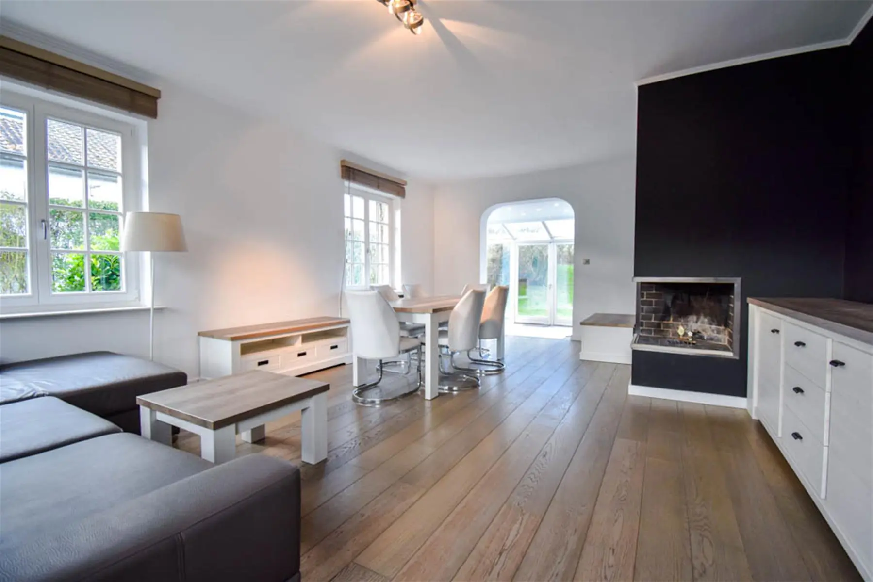 Maison très lumineuse, parquet partout et offrant: au rez-de-chaussée: hall d'entrée avec wc séparée, cuisine, salon avec feu ouvert de +/-35m2 avec veranda de +/-15m2 donnant accès sur le jardin de +/- 800m2, cuisine, 2 chambres (14 et 12m2).