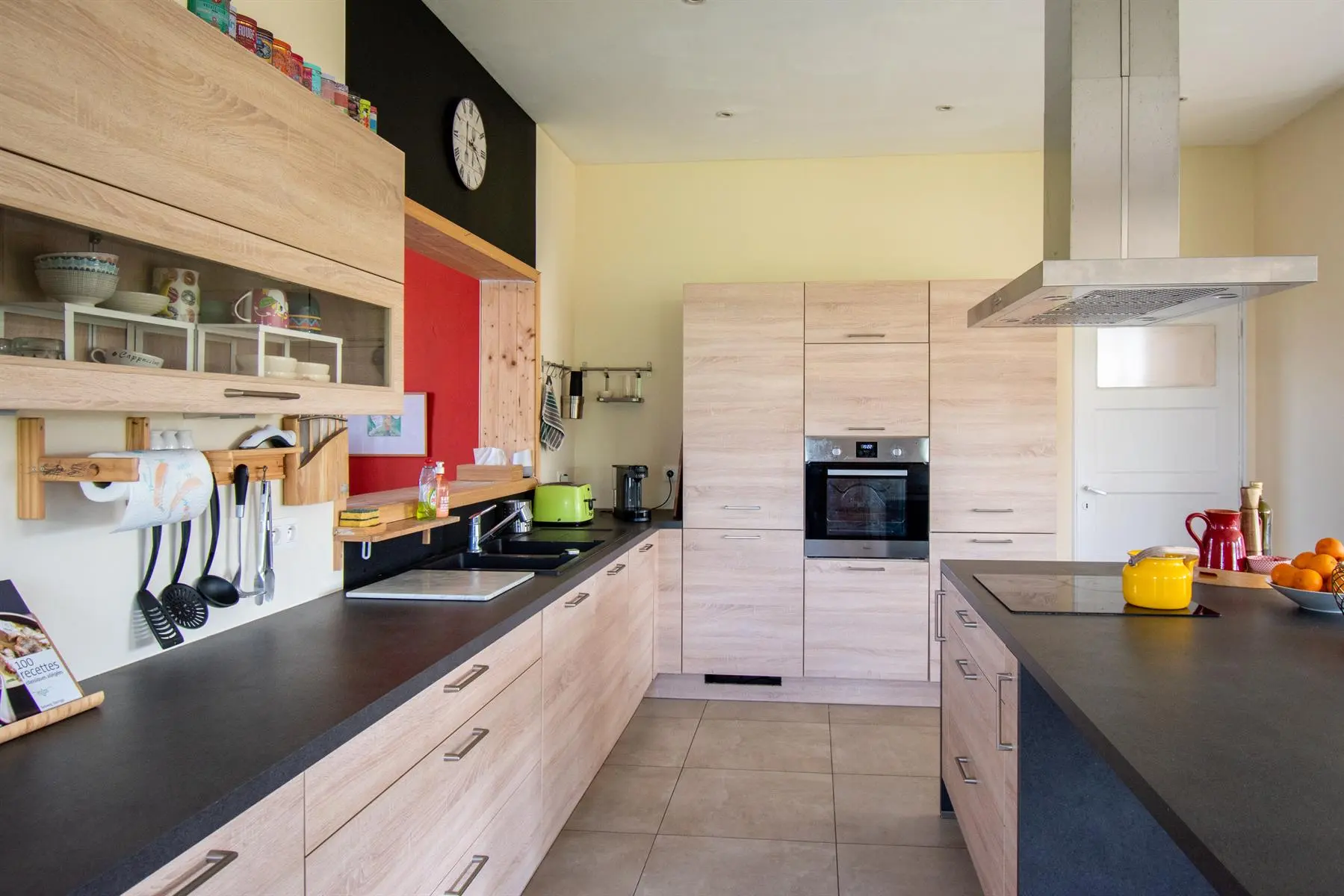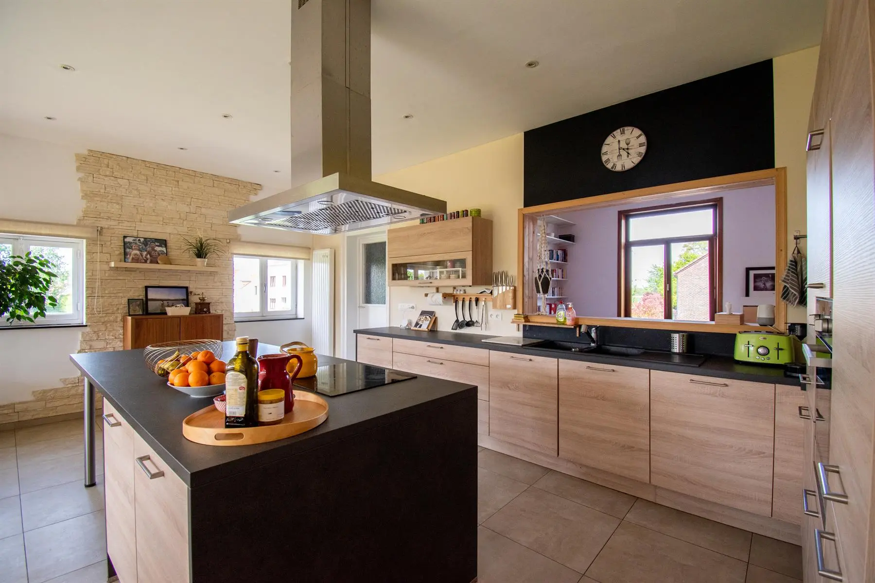 Au rez : un hall d'entrée, une grande cuisine ouverte super équipée et salle à manger de +/- 44m2, un salon de +/-18m2, une salle de bain de +/- 5m2 et un jardin de +/-550 m2.