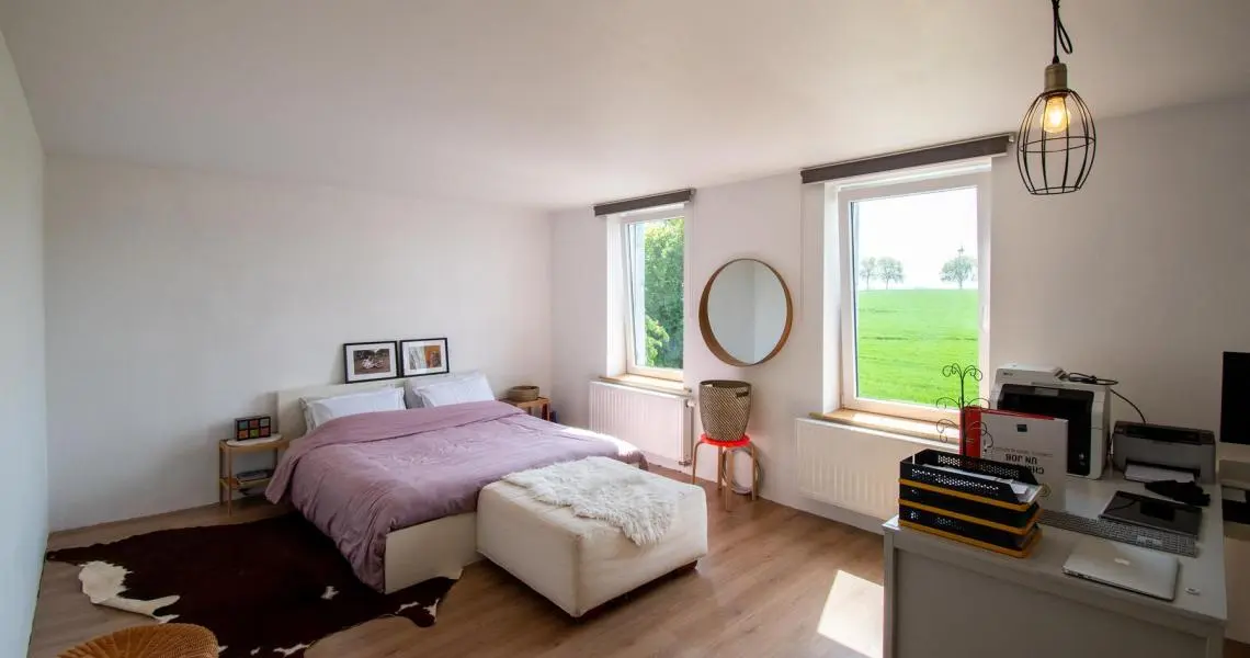 Au 1er : 2 grandes chambres (+/- 24 et 14m2) et hall de +/- 10m2 (pour accéder dans l'autre maison).