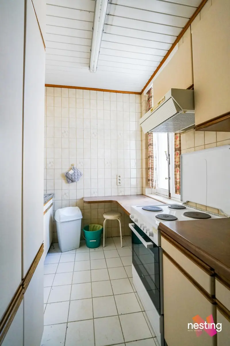 Hall d'entrée, wc, cuisine séparée, vaste séjour de +-30m2 donnant sur un espace extérieur, chambre et salle de douche attenante.